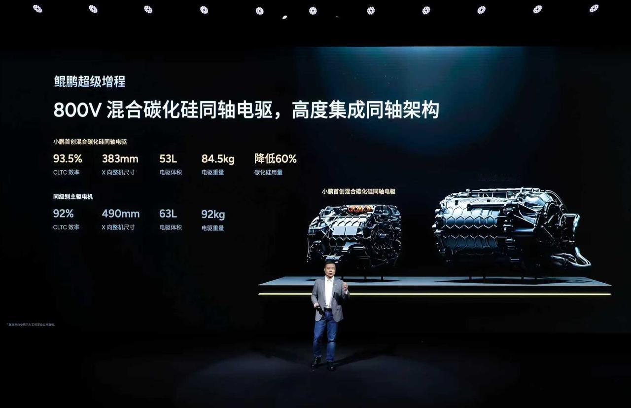 鲲鹏超级增程搭载第三代1.5T高效增压中冷发动机,针对“电为主、油为辅”的工况全面优化,即使在亏电状态下,仍可支持车辆以150km/h时速稳定巡航,确保低电量下动力表现依然充沛稳定。 小鹏首创800V混合碳化硅同轴电驱,采用高度集成同轴架构,CLTC综合效率高达93.5%,兼具高集成与强动力,峰值扭矩达465N·m,峰值功率210kW,并实现电量剩余8%动力无衰减。