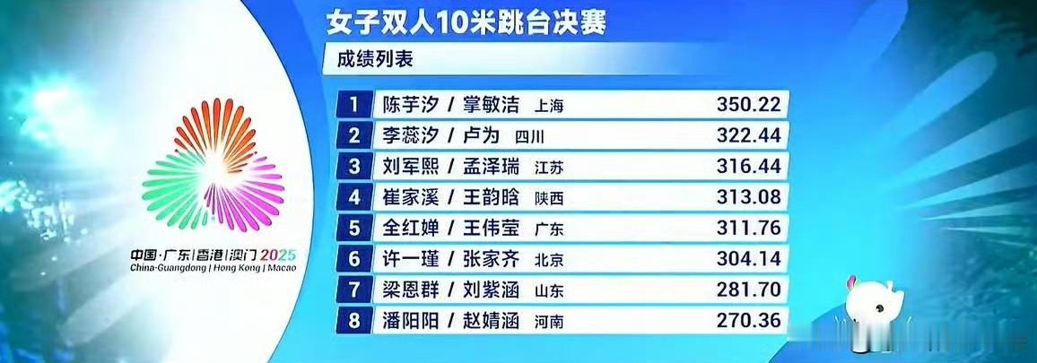 11月6日,2025全国运动会跳水女子双人10米跳台决赛结束。 上海队陈芋汐与掌敏洁以总分350.22夺得金牌,四川队李蕊汐与卢为以322·44分获得银牌,江苏队刘军熙与孟泽瑞以316.44获得铜牌。 比较遗憾的是,广东队全红婵与王伟莹以311.76分排在第5位,未能进入前3名。 首先,我们要恭喜上海队陈芋汐与掌敏洁获得本届全运会跳水女子双人10米跳台决赛冠军。 两人确实配合默契,每一跳的成绩都排在第一位。 全红婵与王伟莹的五轮跳水中,前三轮都是比较不错的,但后两轮的水花都没有压住,尤其是第五跳的失误比较大。 不管如何,只要能站上全运会的舞台就是一种胜利,期待全红婵的下一次比赛,大家觉得呢?