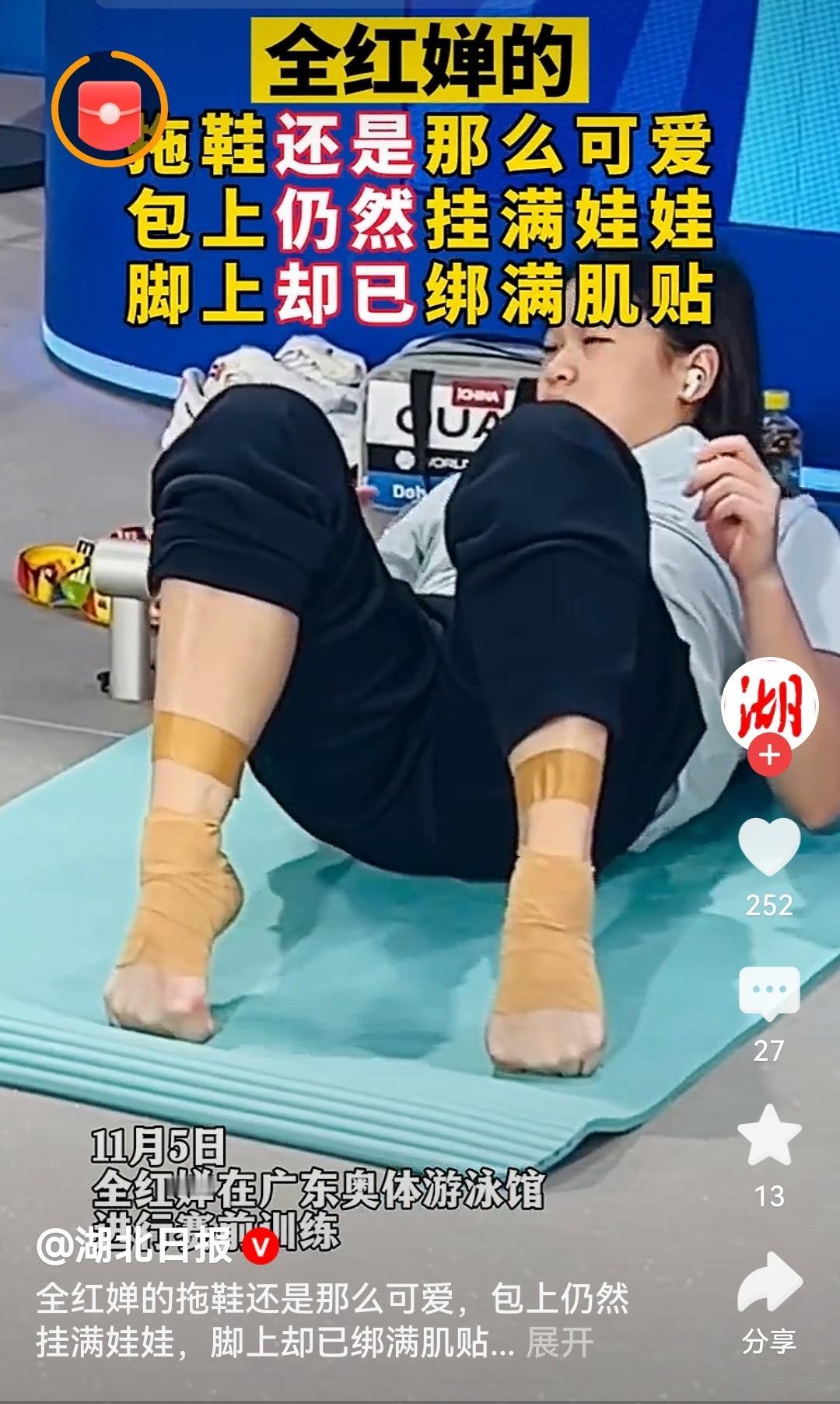 全红婵脚上绑满肌贴看到全妹脚上的肌贴好心疼,但她依然带着可爱的娃娃包、穿软乎乎的拖鞋,笑着赛场拼搏——这份带着热爱的坚韧太戳人了!健康比什么都重要,永远为你骄傲~[加油][加油][加油] 运动肌贴胶带 评论打卡任务