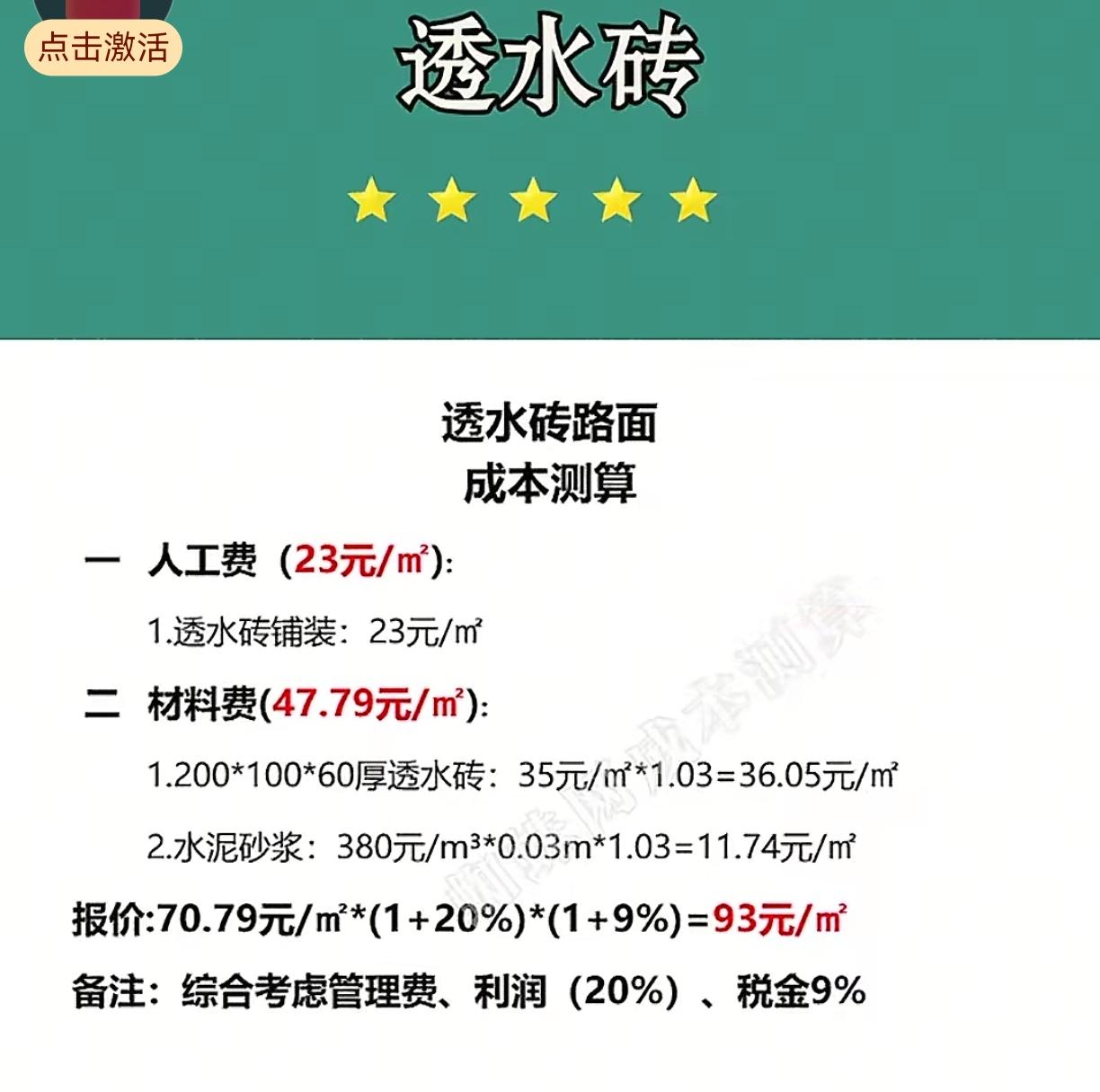 家人们,透水砖路面报价93元/m²,别以为能透水就万事大吉,这里的坑能让路面一年就报废! 先盯人工费23元/m²,必须要求“留缝3-5毫米”,有些师傅为省事儿铺得密不透风,水渗不下去,跟普通地砖没区别,白瞎了“透水”功能。 材料费猫腻多:透水砖36.05元/m²,得看孔隙率,拿杯水倒上去,3秒内渗完才合格,渗得慢的就是假透水砖,下雨照样积水。水泥砂浆11.74元/m²,得用“干硬性砂浆”,别用稀砂浆,不然砖会被泡得返碱,白花花一片特难看。 最关键的是基层!合同里必须写清“下铺10公分碎石垫层”,很多队省了这步,光靠砖透水根本不够,雨水渗不进地下,路面还会塌陷。 避坑招:完工后做透水测试,泼一桶水,地面不积水才算合格;留20%尾款,过一个雨季再给,要是出现积水、砖松动,直接扣钱返工。 别为了省小钱买劣质砖,这路面要是不透水,还不如铺普通地砖,你们踩过这种坑吗?评论区聊聊!