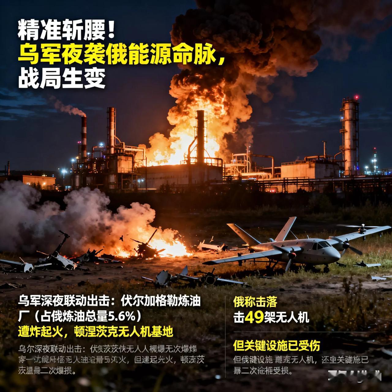 精准斩腰!乌军夜袭俄能源命脉,战局生变 乌军深夜联动出击:伏尔加格勒炼油厂(占俄炼油总量5.6%)遭炸起火,顿涅茨克无人机基地爆二次爆炸。俄称击落49架无人机,但关键设施已受损。乌方剑指俄军燃料补给线,借低成本无人机瘫痪俄战争“血液”,西方称这是战场破局新信号!顿涅茨克局势 俄罗斯前线战报