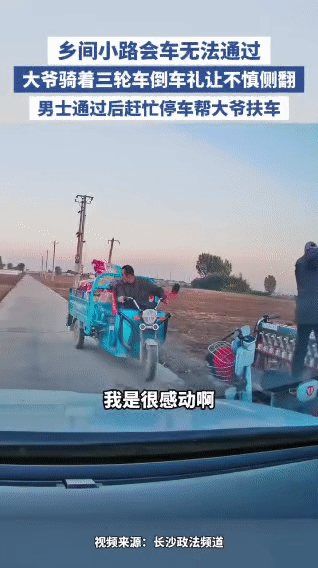 河北乡间小路会车时,大叔骑三轮车倒车礼让,不慎侧翻进田。驾车男子通过后立刻停车,帮忙扶起了三轮车。双向的善意,暖了一路~ 为双方的善良和理解点赞。善良 正能量