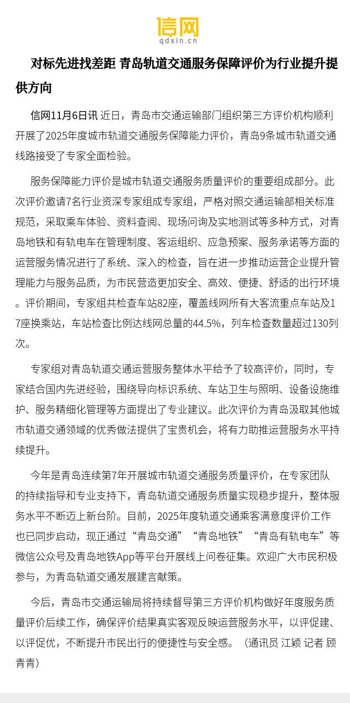 【对标先进找差距 青岛轨道交通服务保障评价为行业提升提供方向】专家组对青岛轨道交通运营服务整体水平给予了较高评价,同时,专家结合国内先进经验,围绕导向标识系统、车站卫生与照明、设备设施维护、服务精细化管理等方面提出了专业建议。