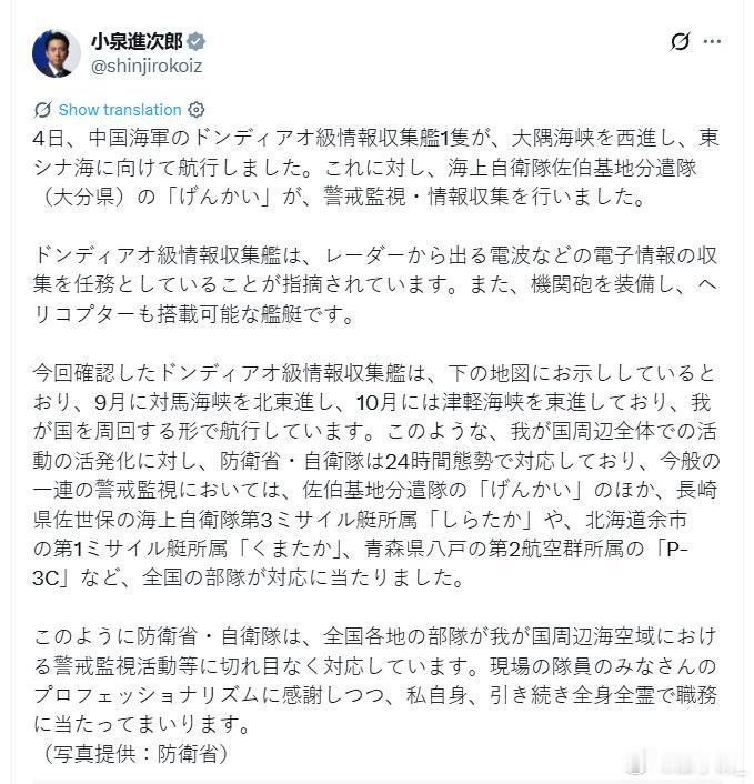 日本新任防卫大臣小泉进次郎11月5日亲自发帖,谈论中国海军796开阳星舰的绕日航行,言语中透露出对中国海军“街溜子”的无奈 小泉进次郎称如图所示,此次确认的中国海军东调级侦察舰于9月通过对马海峡向东北航行,10月向东通过津轻海峡,绕日本航行。东调级侦察舰的任务是采集雷达发出的无线电波等电子信息。针对日本的类似行动在增加,日本防卫省和自卫队都在“24小时无休地应对”云云。不是湾湾哪有事就是日本有事吗?到时候先干翻倭寇,看你还有没有事。