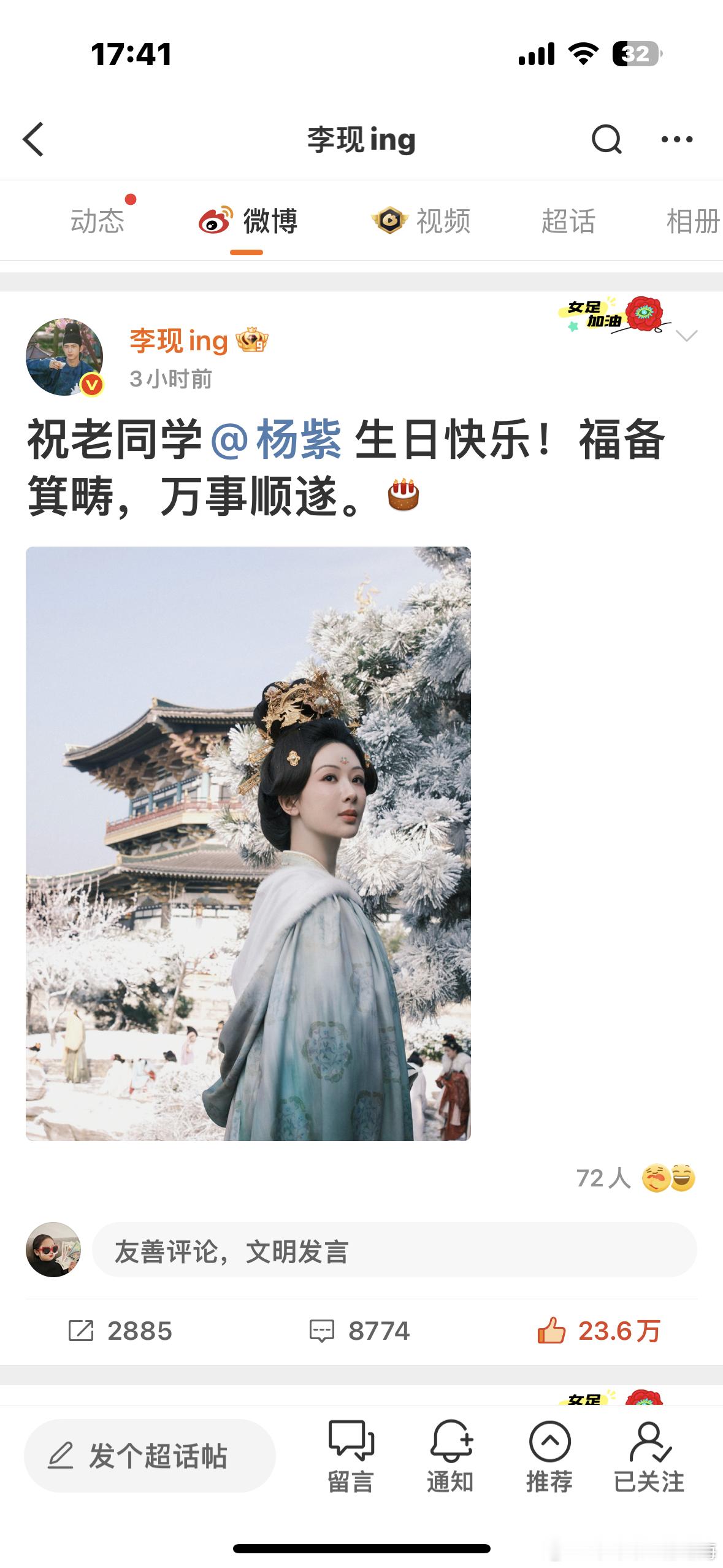 李现祝杨紫生日快乐,敬连续八年从未间断的生日祝福,两位继续一起携手走花路吧。