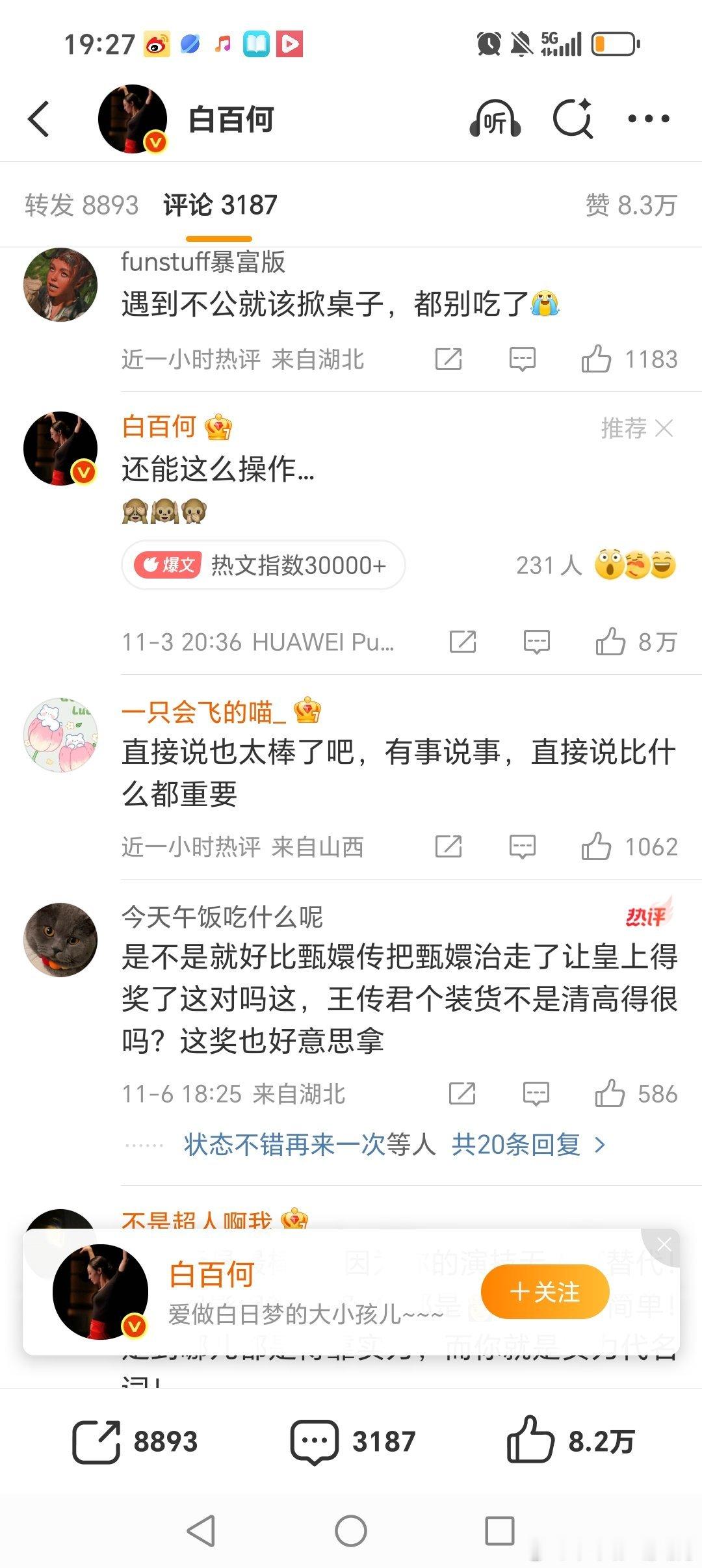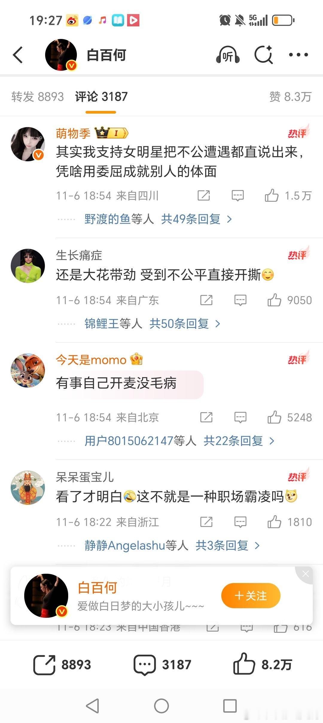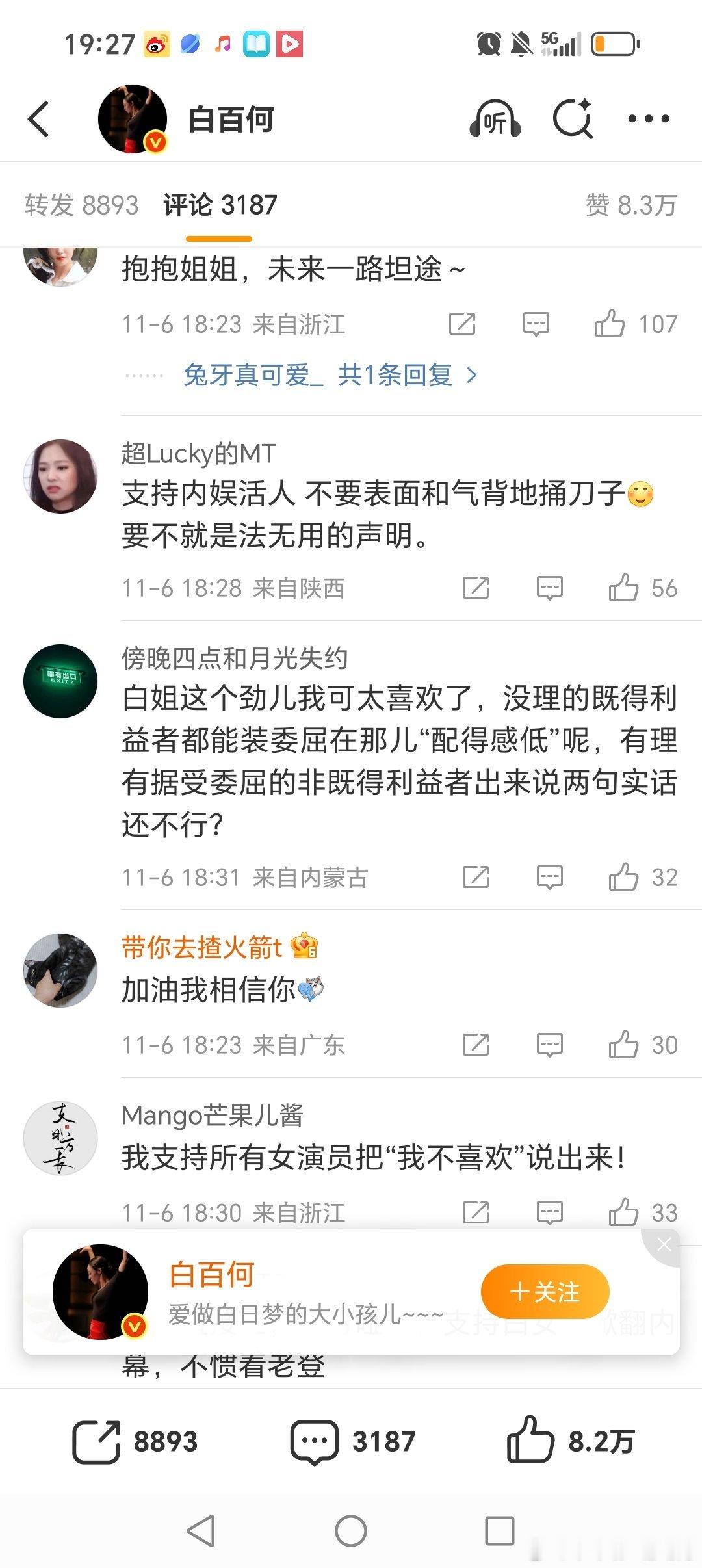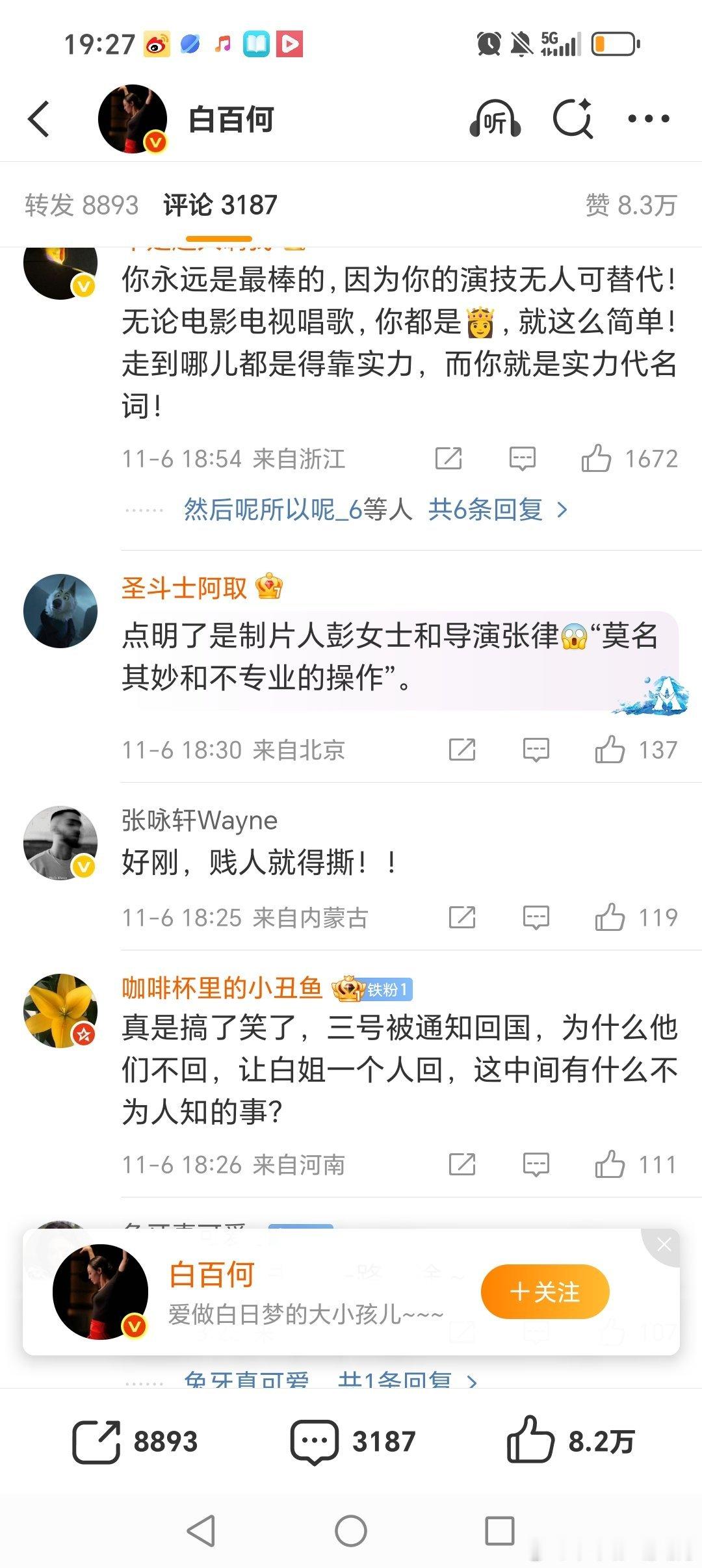 目前白百何评论区全是声援之声,幸好彭瑾没微博……
