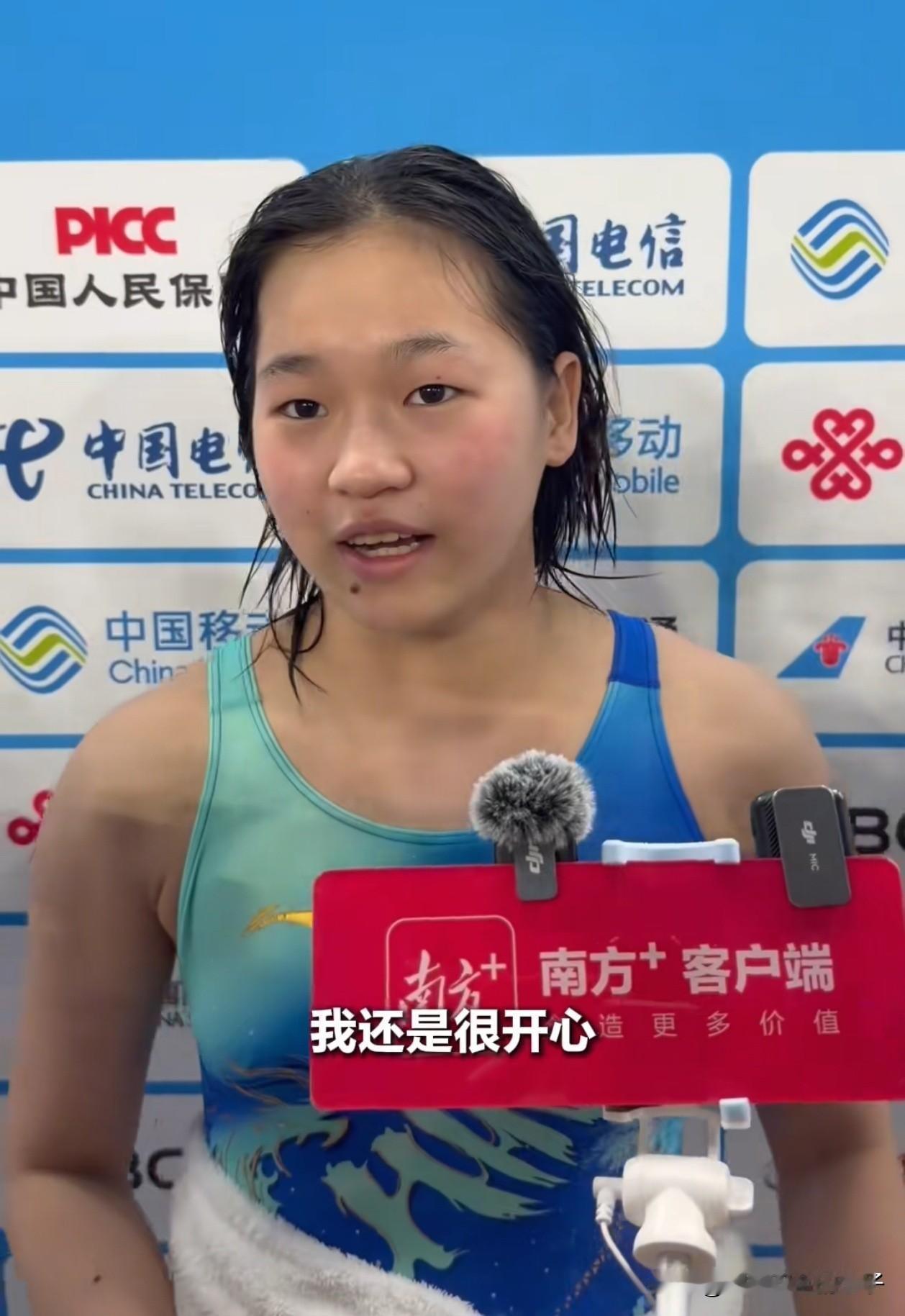 全红婵的心可真大,第5名还这么开心! 赛后有记者问她,上次拿了冠军后发文说自己很棒,那这次觉得自己表现得怎么样呢,不等记者问完,她就回答说还是觉得自己很棒。 她觉得自己能坚持完赛就挺厉害了,她伤病也恢复得不太理想,做动作弹跳时会很痛,跳多了上下楼梯都会很痛苦。 搭档王伟莹刚跳完个人全能,她们俩人都挺累的,加上一起训练的时间也比较短,没配合过多少次,所以能跳成这样,她已经很满意了! 而且我注意到,记者虽然采访的是她,但她基本都会带着搭档回答,也是可以让大家更记住她的搭档王伟莹,两个人都很棒,好好休息,好好恢复!