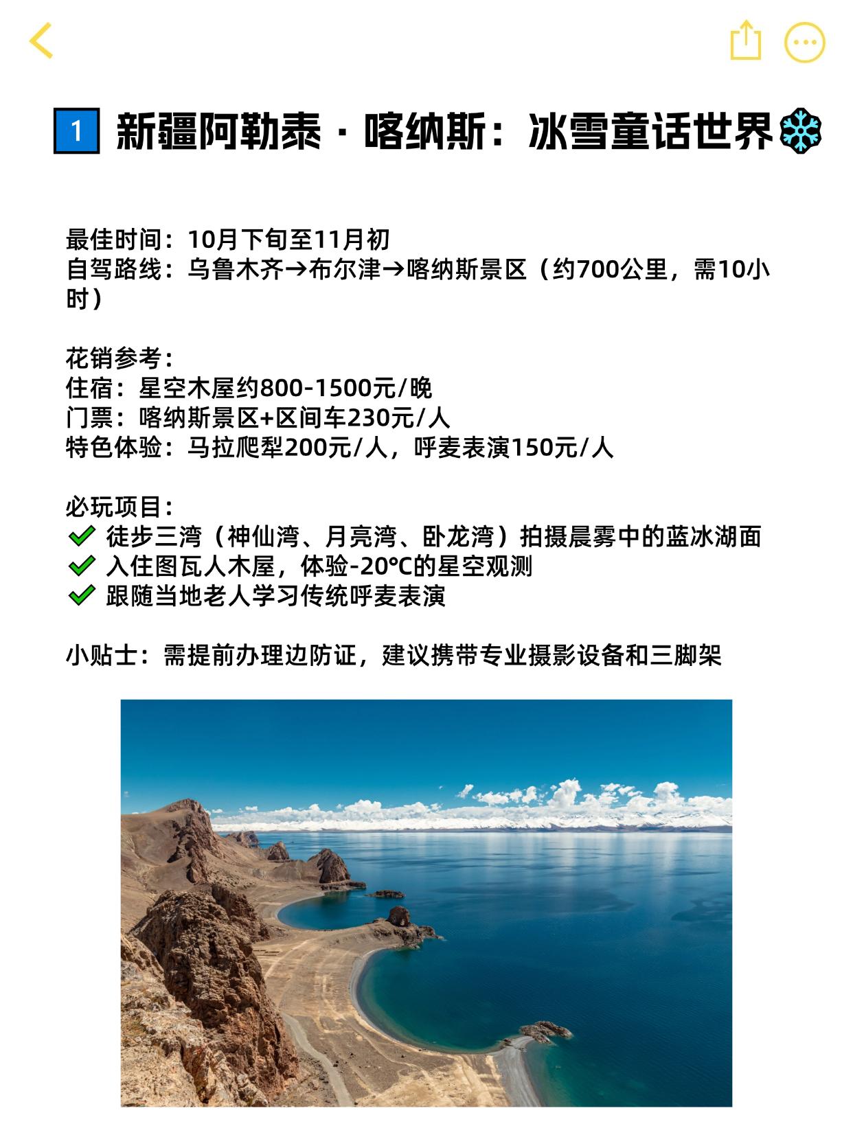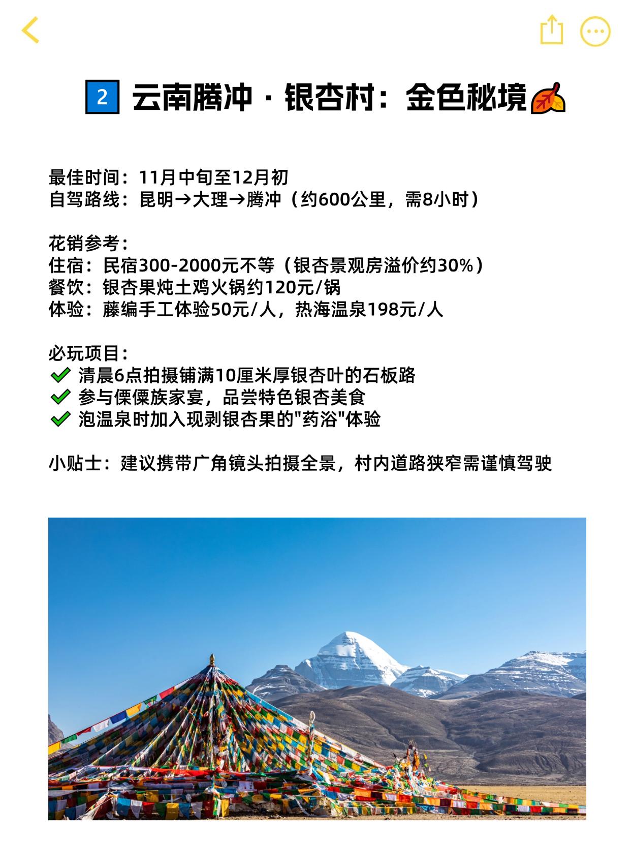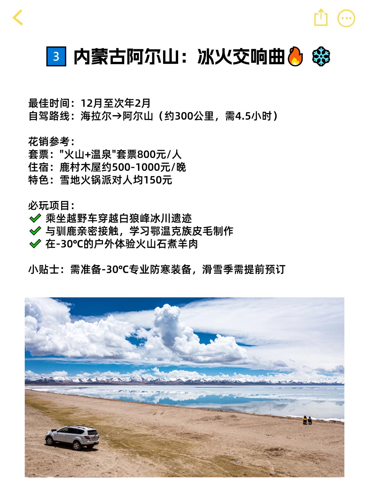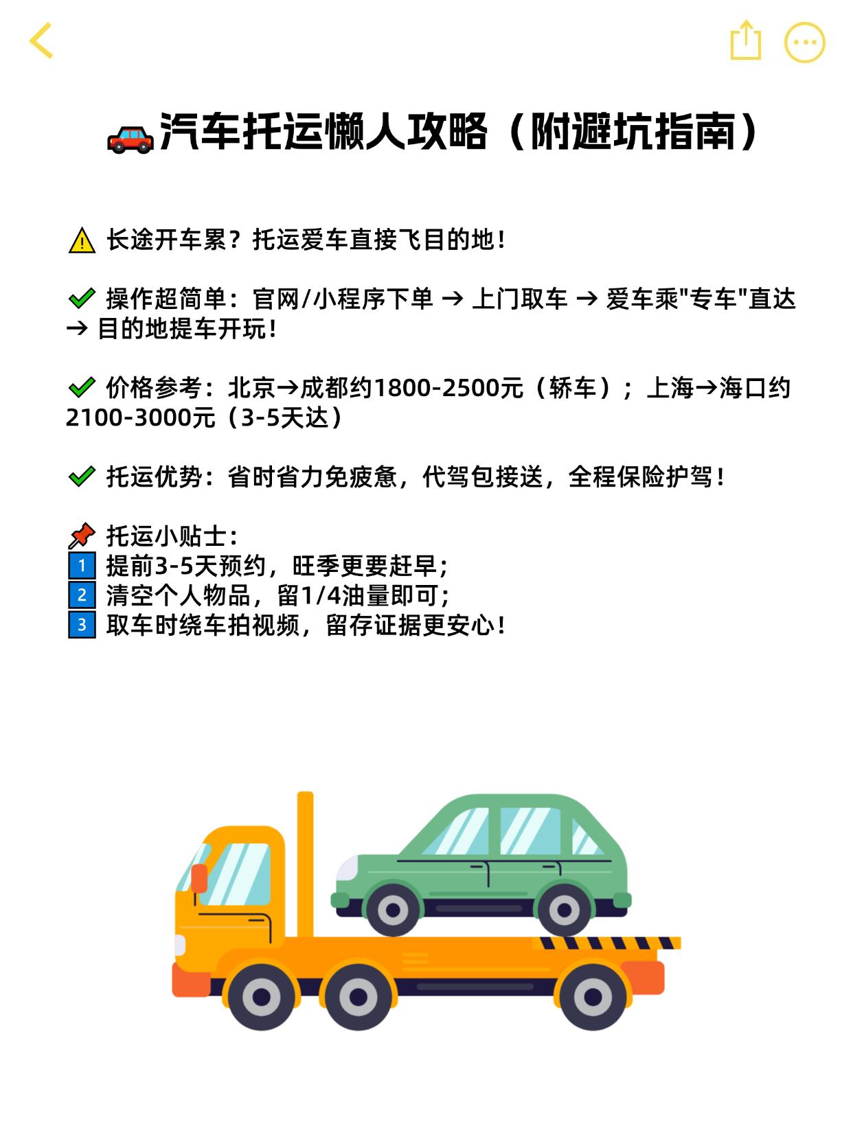 秋冬季节是自驾游的黄金时间,今天给大家推荐三个国内最适合秋冬自驾的目的地 1️⃣ 新疆阿勒泰·喀纳斯:冰雪童话世界❄️ 最佳时间:10月下旬至11月初 自驾路线:乌鲁木齐→布尔津→喀纳斯景区(约700公里,需10小时) 花销参考: 住宿:星空木屋约800-1500元/晚 门票:喀纳斯景区+区间车230元/人 特色体验:马拉爬犁200元/人,呼麦表演150元/人 必玩项目: ✔️ 徒步三湾(神仙湾、月亮湾、卧龙湾)拍摄晨雾中的蓝冰湖面 ✔️ 入住图瓦人木屋,体验-20℃的星空观测 ✔️ 跟随当地老人学习传统呼麦表演 小贴士:需提前办理边防证,建议携带专业摄影设备和三脚架 2️⃣ 云南腾冲·银杏村:金色秘境🍂 最佳时间:11月中旬至12月初 自驾路线:昆明→大理→腾冲(约600公里,需8小时) 花销参考: 住宿:民宿300-2000元不等(银杏景观房溢价约30%) 餐饮:银杏果炖土鸡火锅约120元/锅 体验:藤编手工体验50元/人,热海温泉198元/人 必玩项目: ✔️ 清晨6点拍摄铺满10厘米厚银杏叶的石板路 ✔️ 参与傈僳族家宴,品尝特色银杏美食 ✔️ 泡温泉时加入现剥银杏果的"药浴"体验 小贴士:建议携带广角镜头拍摄全景,村内道路狭窄需谨慎驾驶 3️⃣ 内蒙古阿尔山:冰火交响曲🔥❄️ 最佳时间:12月至次年2月 自驾路线:海拉尔→阿尔山(约300公里,需4.5小时) 花销参考: 套票:"火山+温泉"套票800元/人 住宿:鹿村木屋约500-1000元/晚 特色:雪地火锅派对人均150元 必玩项目: ✔️ 乘坐越野车穿越白狼峰冰川遗迹 ✔️ 与驯鹿亲密接触,学习鄂温克族皮毛制作 ✔️ 在-30℃的户外体验火山石煮羊肉 小贴士:需准备-30℃专业防寒装备,滑雪季需提前预订 ✨ 懒人神技:汽车托运攻略 ⚠️ 长途开车累?托运爱车直接飞目的地! ✔️ 操作超简单:官网/小程序下单 → 上门取车 → 爱车乘"专车"直达 → 目的地提车开玩! ✔️ 价格参考:北京→成都约1800-2500元(轿车);上海→海口约2100-3000元(3-5天达) ✔️ 托运优势:省时省力免疲惫,代驾包接送,全程保险护驾!