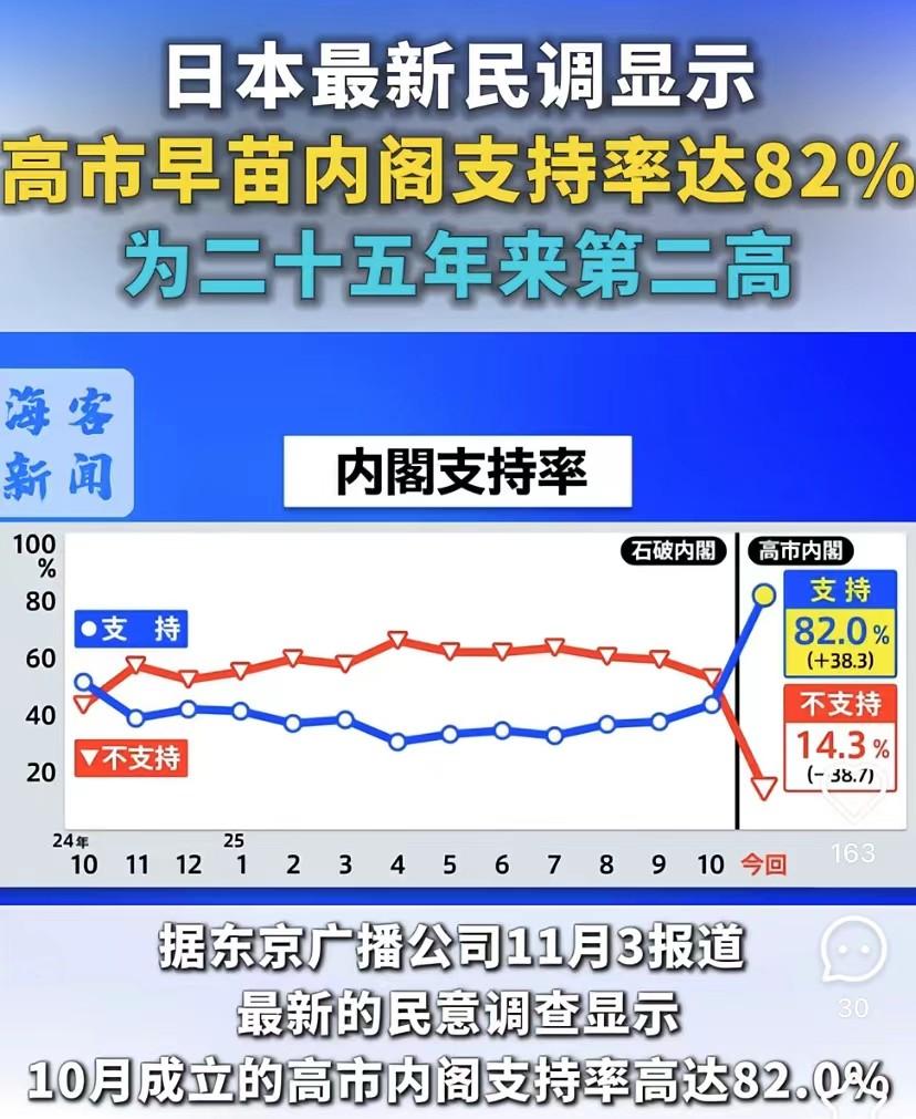 日本首相支持率狂飙,中国连下战书,小国能否扛过风暴? 最近日本换了首相叫高市早苗,大家本来都觉得她撑不了多久,结果最新民调显示她支持率82%,比前任翻了一倍多。年轻人支持的也很多,连六十岁以上的老头老太太也有七成多认可她。这说明日本国内现在风气变了,很多人对现状不满,想要有人带头强硬一把。 高市上台后干的事挺大胆,先是给美国投资五千五百亿,在美国建厂搞钱,但赚的钱不让回流日本。她说这是为了拉美总统特朗普来帮忙撑腰。接着她在APEC峰会上和台湾代表握手合影,还敢在公开场合发到网上。这明显是在挑战一个中国原则。 中国火了,外交部直接连用三个“严重”批评日本。以前中国都是客客气气说话,这次直接划了红线。要是日本继续这么干,可能会遭到贸易制裁。光2024年中国和日本贸易额就有三千亿,要是断了日本日子肯定难过。 现在日本经济不太好,连续三个季度赔钱,日元汇率跌到三十年最低。高市倒好,反而要把军费从GDP的1%加到2%,打算买更多武器。可问题来了,日本年轻人不愿意当兵,招兵率才四成多。就算有钱买装备,也凑不够人手啊。 美国那边其实挺现实,他们让日本掏钱建军事基地,主要是想让日本当挡箭牌。特朗普来访时要钱是明摆着的,但真打起来美国未必会帮忙。历史上美国对盟友也不是特别靠谱,北约被骂冤大头就是例子。 高市现在就是在赌,赌美国会真心支持日本,赌中国不敢真动手。但她可能算错两件事:一是中国这次态度特别强硬,二是日本经济撑不起军备竞赛。现在年轻人虽然喊着要强硬,但万一打仗或者经济更差,民意可能瞬间翻脸。 最近中日关系降到冰点,两国官员见面都冷着脸。网上日本年轻人骂中国的声音多,但老一辈还记得当年历史问题。高市玩的是把双刃剑,支持率再高也掩盖不了问题。 现在大家只能等等看结果了。