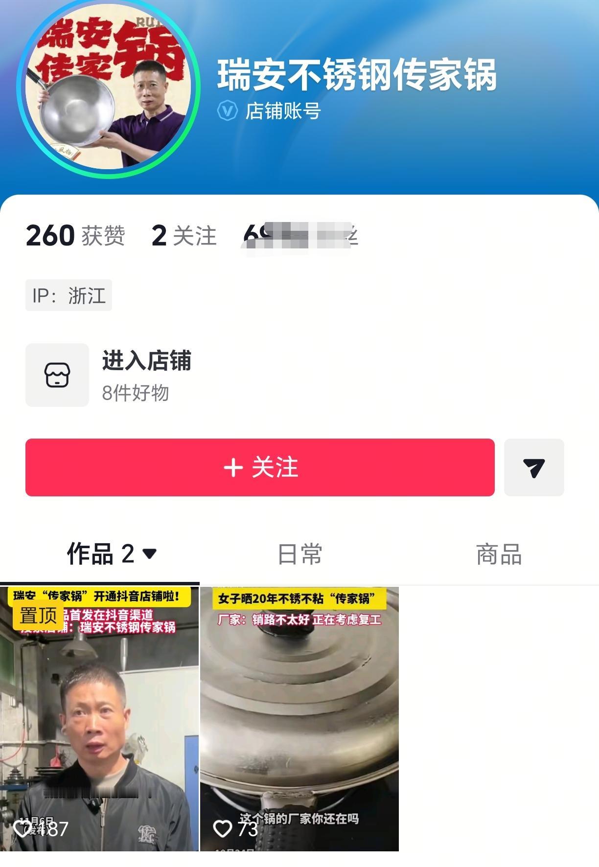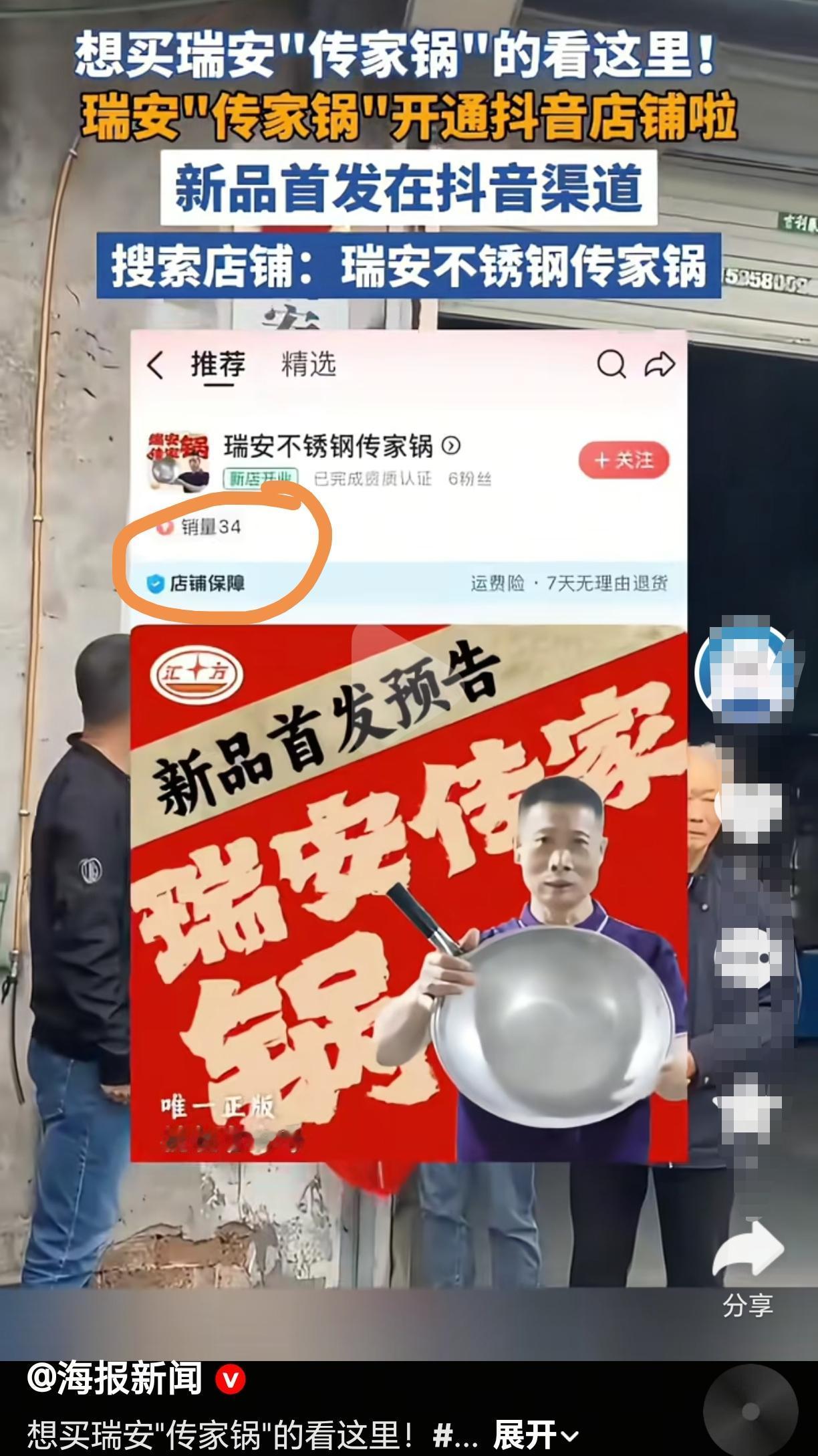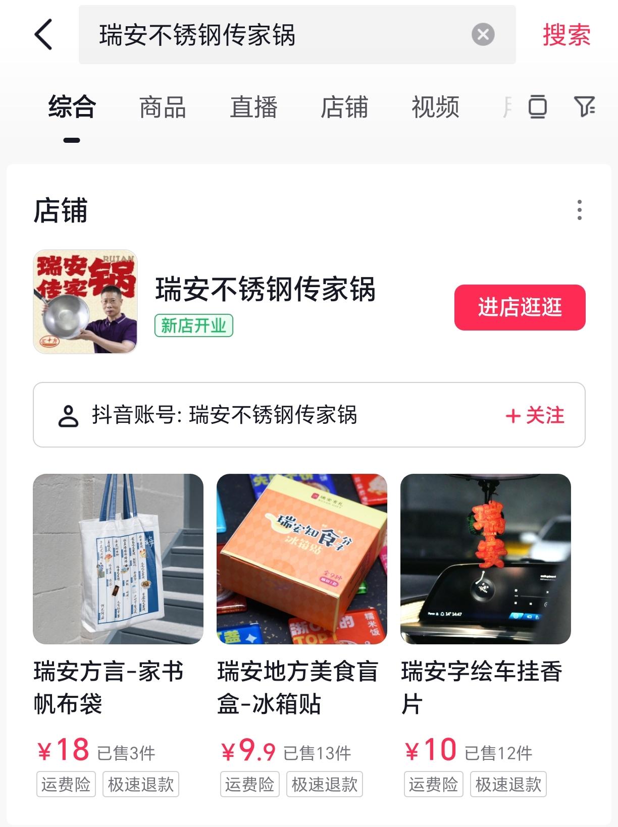 瑞安“传家锅”开通抖音店铺了? 这也算了官方媒体的报道,我信以为真,点进去一看这个店铺的详情,店铺里上架的都是瑞安地方特产(帆布袋、冰箱贴、香片、笔记本),再点开商家资质,老板叫缪某某,这不妥妥骗人嘛! 这个媒体到底想干嘛,明明人家真正的传家锅还没有生产出来,瑞安融媒从来有说过开通抖音店铺,而且店铺图片还有销量34给我看懵了,不是天天宣传一切还在准备中,怎么突然冒出个这去误导大众? 打开这个店铺号的作品,更离谱的是,还用人家本人的头像和视频做宣传,这老板可真“刑”! 大家说,这是媒体帮忙打假,还是带头宣传“假货”? 瑞安锅 瑞安传家锅 瑞安铁锅复产 瑞安五星锅 传家锅
