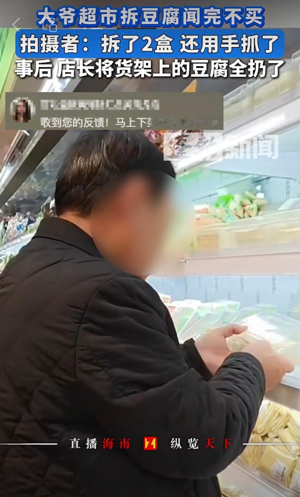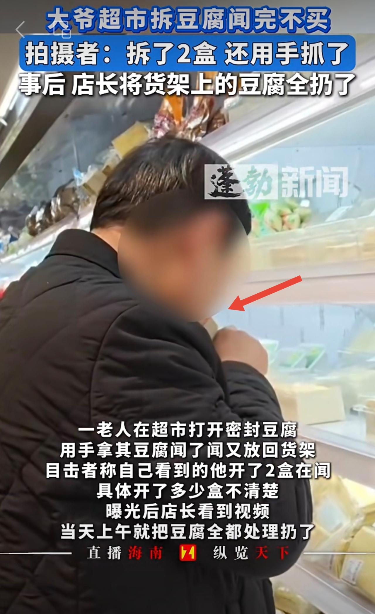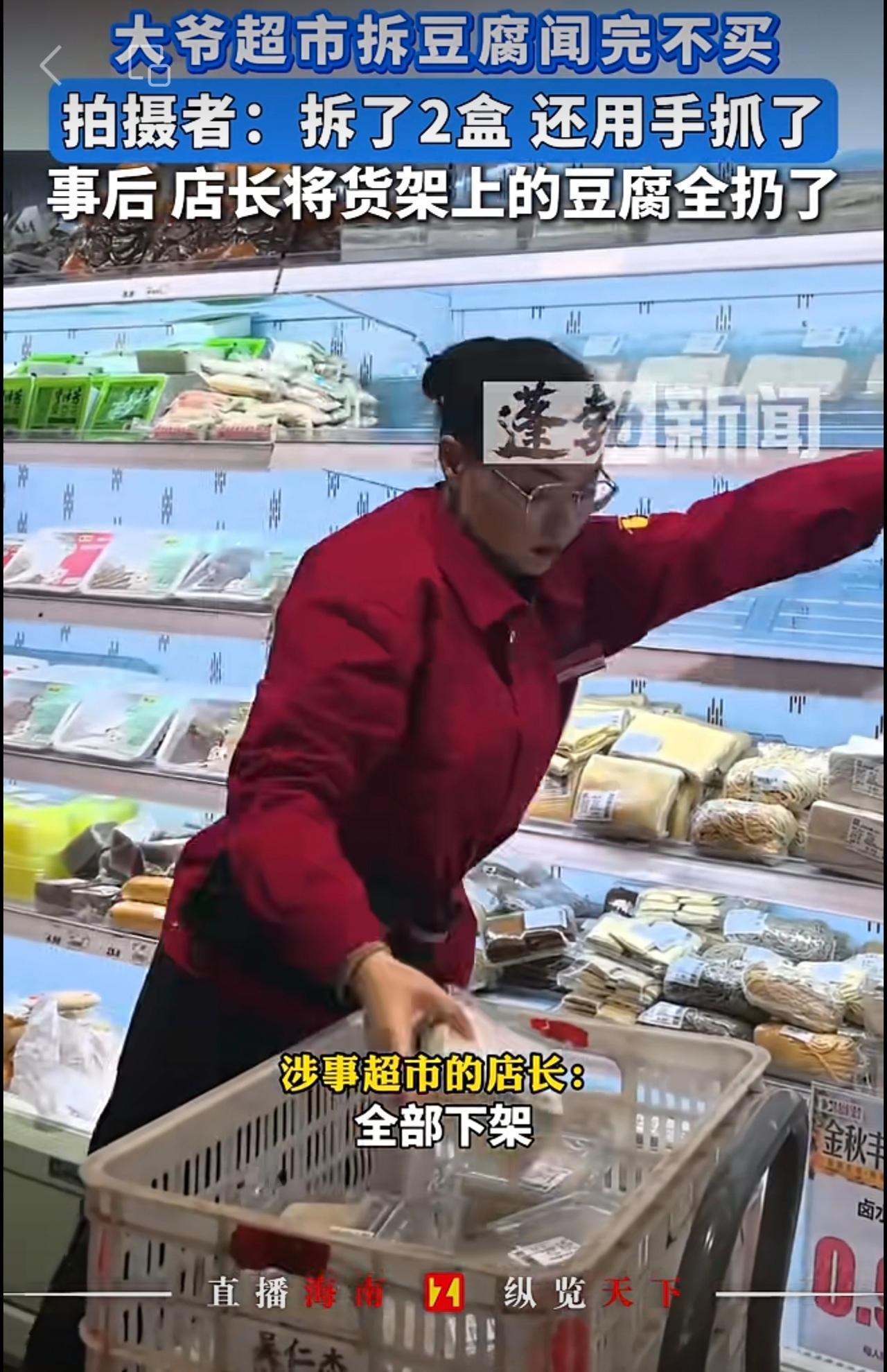 大爷超市拆豆腐闻完不买,拍摄者:拆了2盒,还用手抓了!事发后,店长将货架上的豆腐