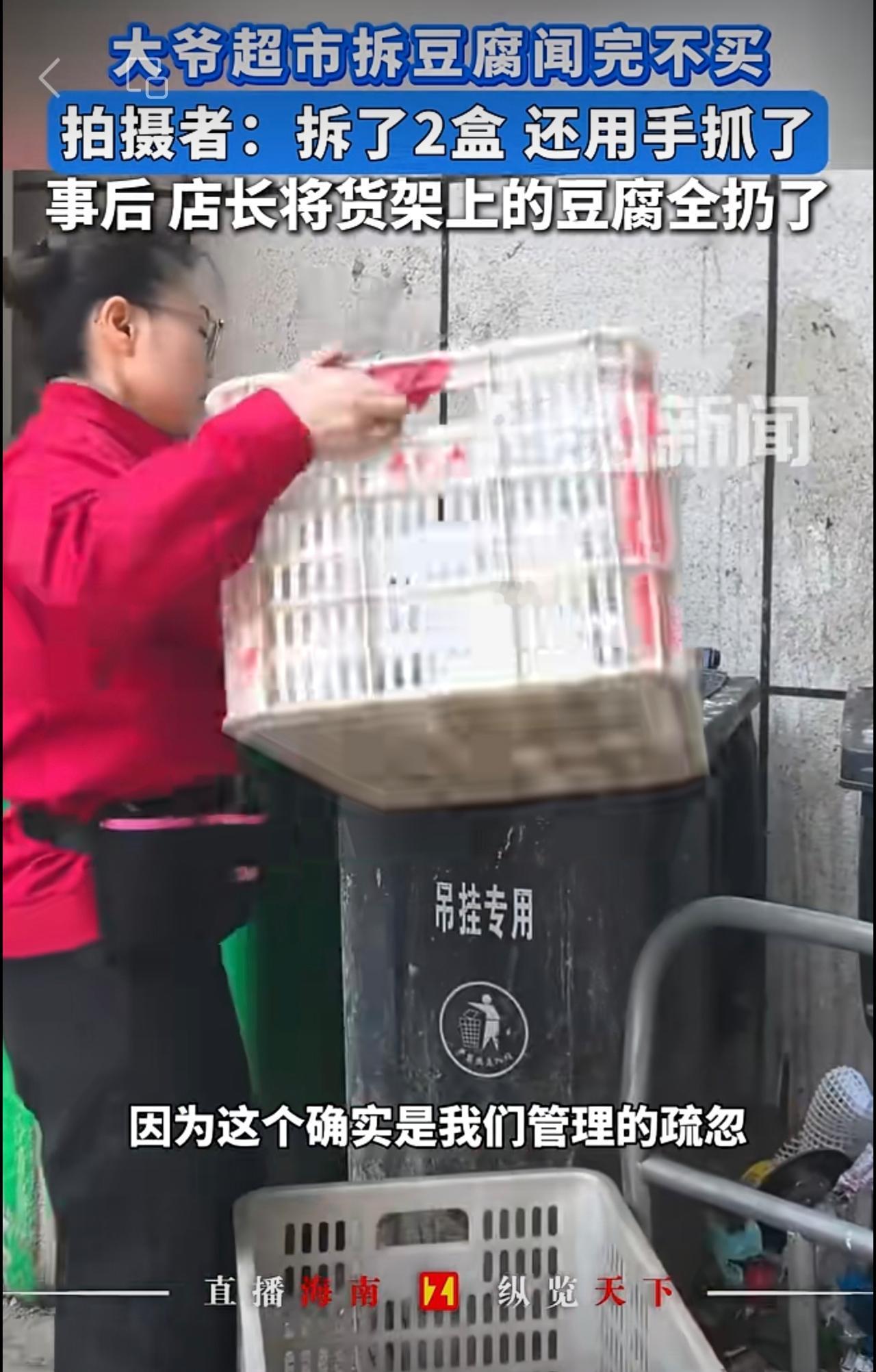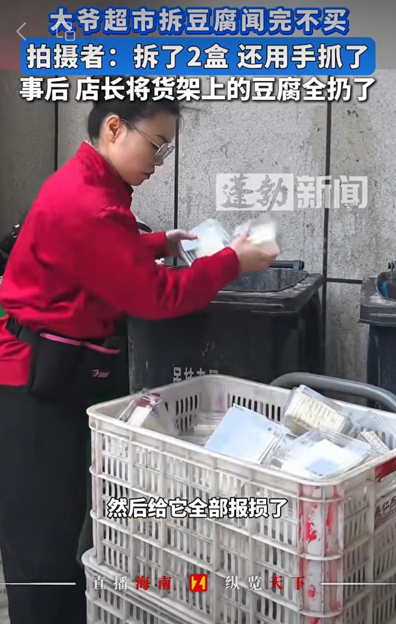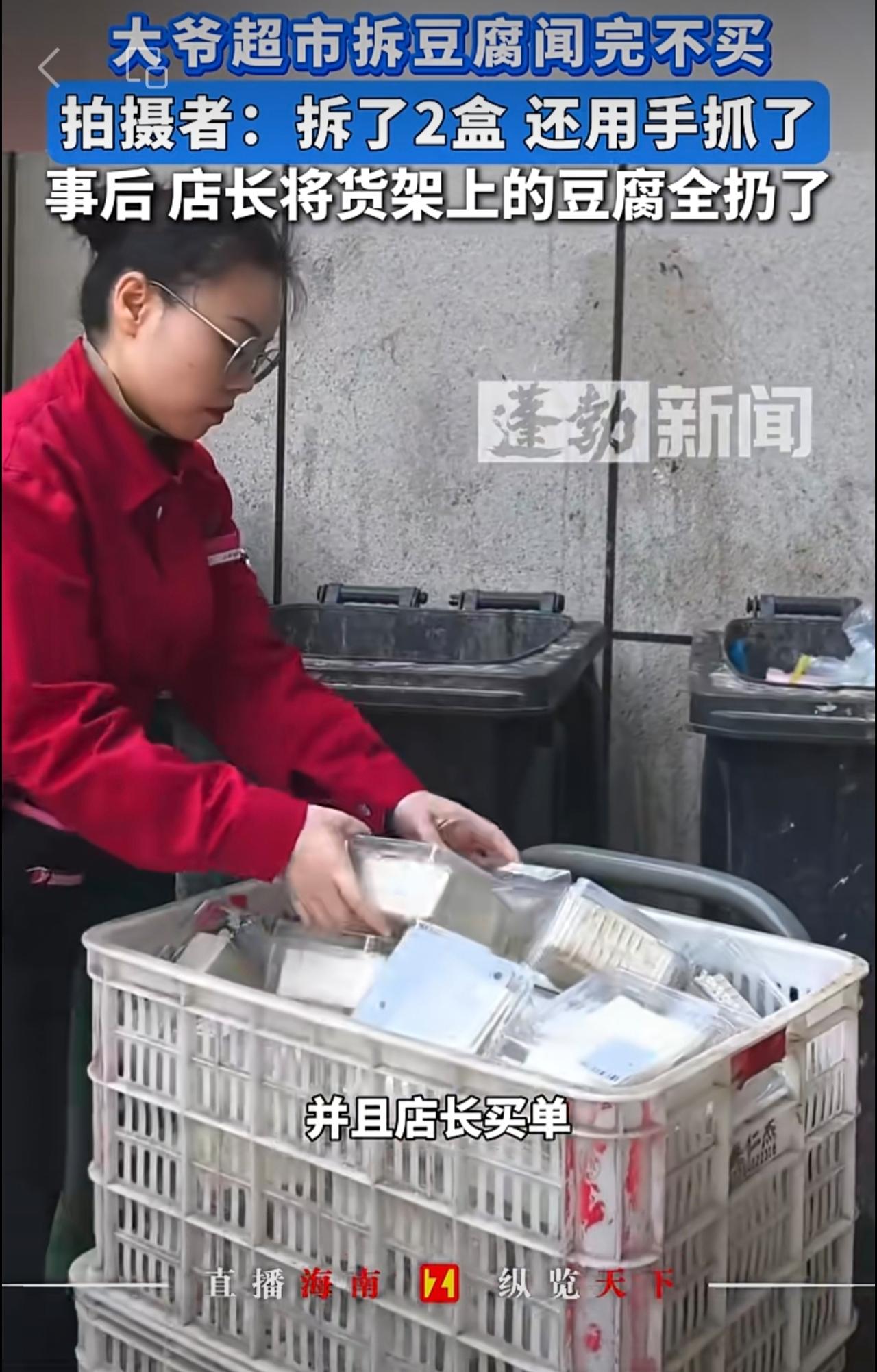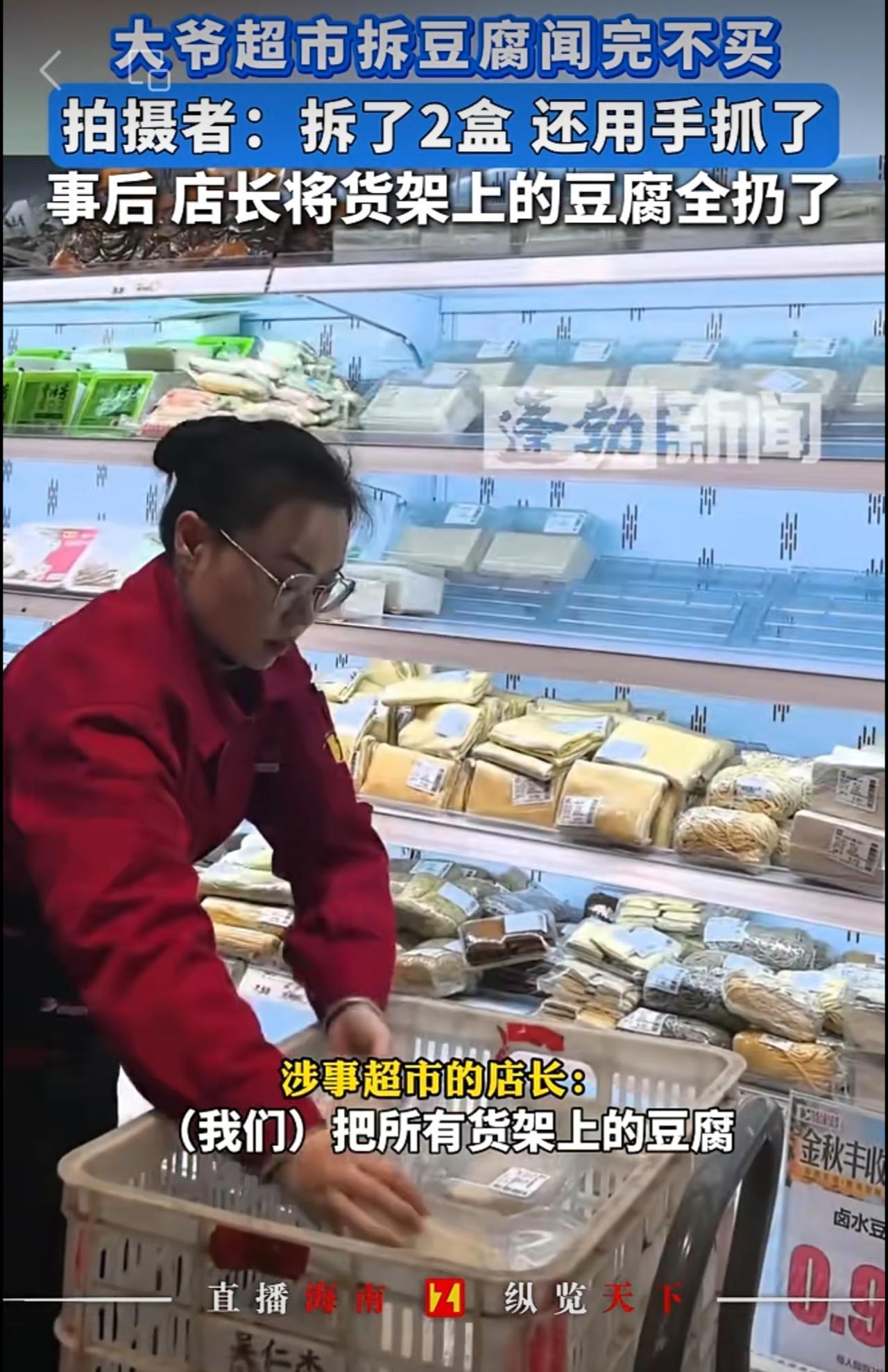 大爷超市拆豆腐闻完不买,拍摄者:拆了2盒,还用手抓了!事发后,店长将货架上的豆腐全扔了!大爷 超市 食品安全