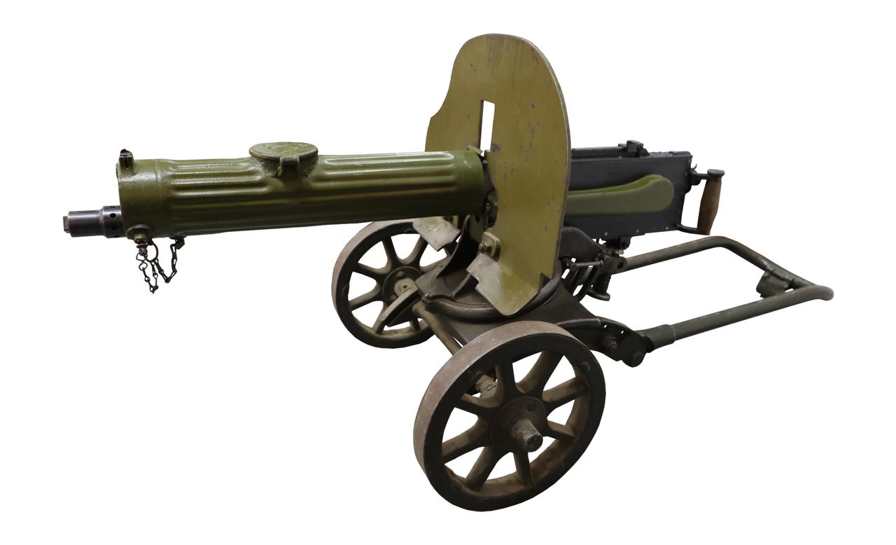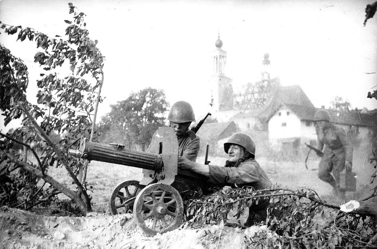 1944年,华沙近郊,瓦维尔区,马雷辛镇格林基村。“波兰人民军”的机枪组正在操作一挺马克沁重机枪投入战斗。背景中可见圣坎塔利齐的斐理斯教堂。 “波兰人民军”是1941年后由苏联组建的波兰军队,苏联负责训练、武器装备和后勤保障,士兵和军官基本上为波兰裔。 照片中的马克沁重机枪采用钢制防盾与索科洛夫轮式枪架(参见图2),可给机枪组提供一定程度的防护。