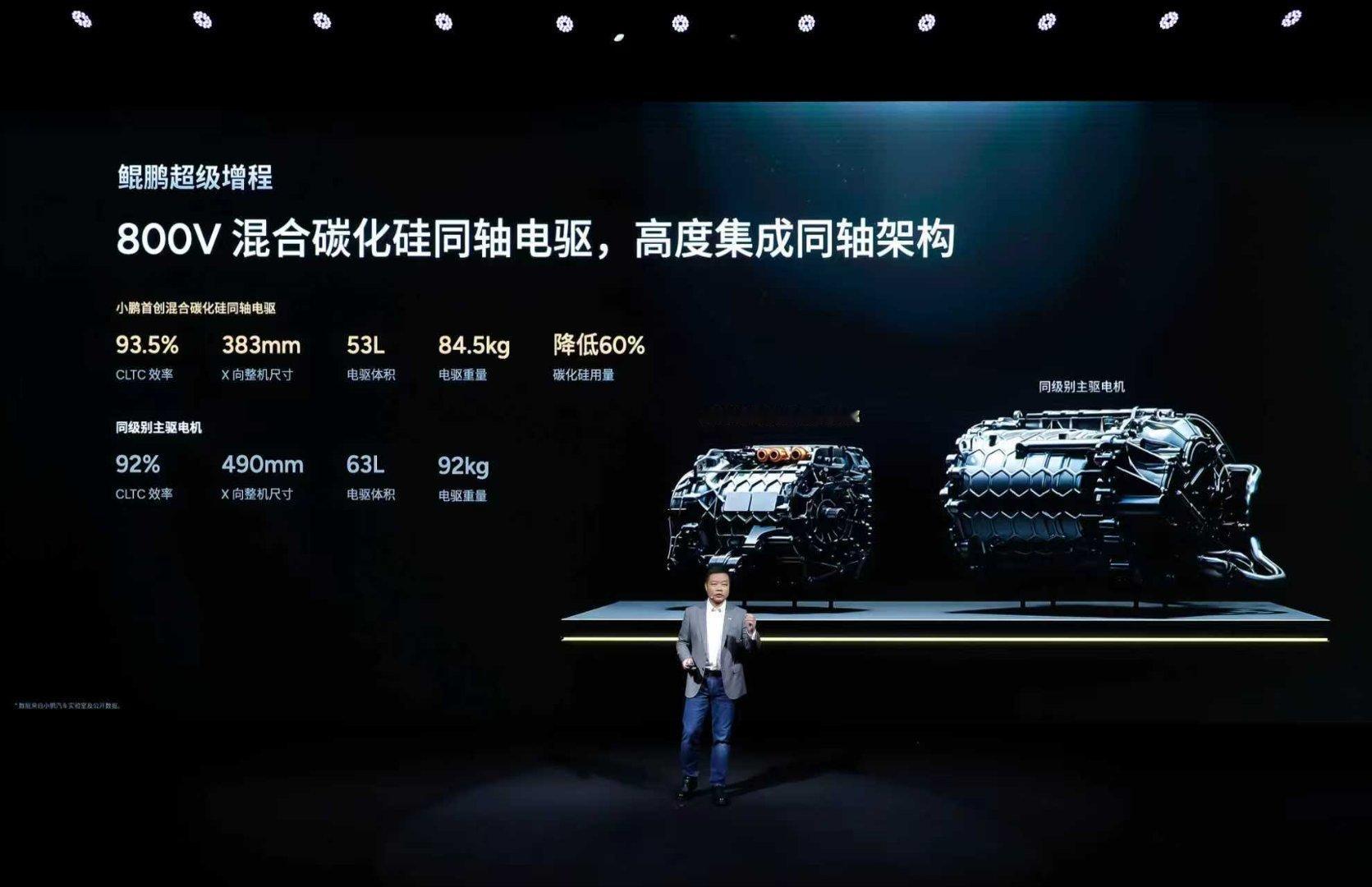 小鹏首创800V混合碳化硅同轴电驱,采用高度集成同轴架构,CLTC综合效率高达93.5%,兼具高集成与强动力,峰值扭矩达465N·m,峰值功率210kW,并实现电量剩余8%动力无衰减。