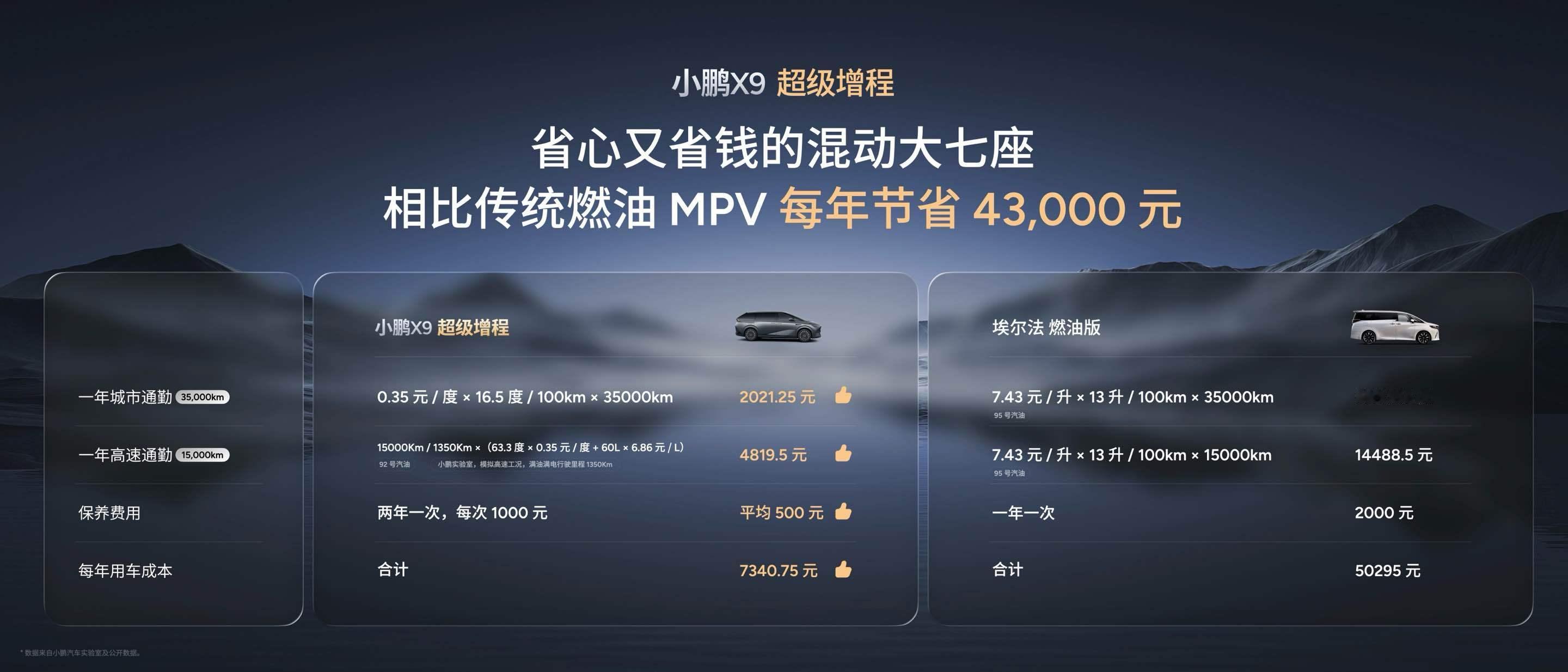 小鹏X9超级增程太强了WLTP油电综合折算燃料消耗量低至2.53L/100km,能用92号油,两万公里只需要换一次机油,对比起传统MPV的使用费用,3年的时间就能省出一台小鹏MONA了,感觉是买小鹏MPV能“赚”一台车。小鹏X9超级增程首发14项全球领先技术