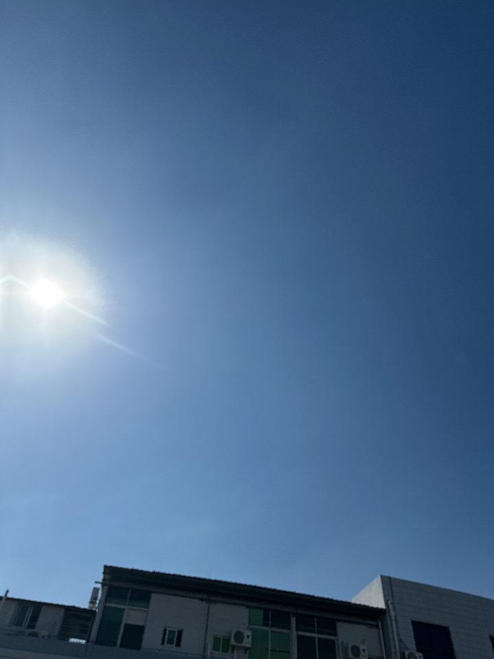 这张照片以无垠的碧空为主角,澄澈如洗,不染纤尘。左上方,烈日如同画面的灵魂,光芒锐利地四散迸发,充满力量感。 下方深色的建筑屋顶沉稳地压住构图,整齐的窗格与空调外机为画面注入了人间烟火气。 明与暗、辽阔与规整在此形成精妙对比。纯粹的蓝色背景衬托出光线的强烈,也反衬出建筑的静谧。 整幅画面在耀眼与沉静之间取得了奇妙平衡,仿佛某个夏日午后的时间切片,既展现了自然的恢弘,又流淌着都市生活中一份难得的宁静诗意。