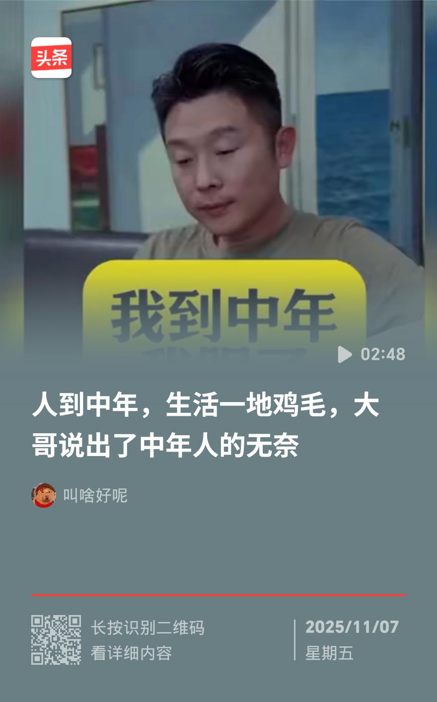 别再羡慕朋友圈!中年人的从容,全是在一地鸡毛里熬出来的 你是不是也总刷到朋友圈里的光鲜生活?海边度假、精致下午茶,再看看自己,满是赶公交、盯报表、哄孩子的琐碎,瞬间觉得日子糟透了?其实啊,谁的生活不是不完美的,中年人的从容,全是在鸡毛蒜皮里熬出来的底气。 凌晨五点半的街头,早点摊的油锅已经“滋啦”作响。阿姨揉着黏糊糊的面团,叔叔翻着金黄的油条,乱糟糟的面团熬一熬,就成了暖肚子的早餐。这就像中年人的日子,工作上不敢松懈,报表要赶、客户要陪,累到颈椎发酸也得撑着;家里父母渐老,血压、腰腿的毛病得记挂,医院预约号要提前抢;孩子的作业要辅导、小情绪要安抚,夜深了还得对着手机搜答案。 谁没过焦虑时刻?怕失业、愁房贷,看到别人的光鲜就忍不住自我怀疑。邻居李姐每天凌晨五点起床做早餐,晚上辅导作业到十点,累到掉眼泪,可孩子递来一颗糖,她就觉得再苦都值;小区王叔失业后没消沉,推着小车帮人收发快递,乐呵呵说“踏实干就有翻盘机会”。 朋友圈的美好大多是精心筛选的,真实的生活本就充满不完美。那些看似从容的人,不过是学会了在压力里扛事,在琐碎里找甜。中年人的幸福,从来不是惊天动地的大事,而是家人吃完饭后的唠家常,是辛苦一天后能歇口气的安稳。 生活从没有完美模板,那些熬过去的苦、扛下来的难,最终都会变成从容的底气。别再羡慕别人,好好过自己的日子,鸡毛蒜皮里也能熬出属于自己的甜。中年生活感悟 中年人幸福观 中年语录