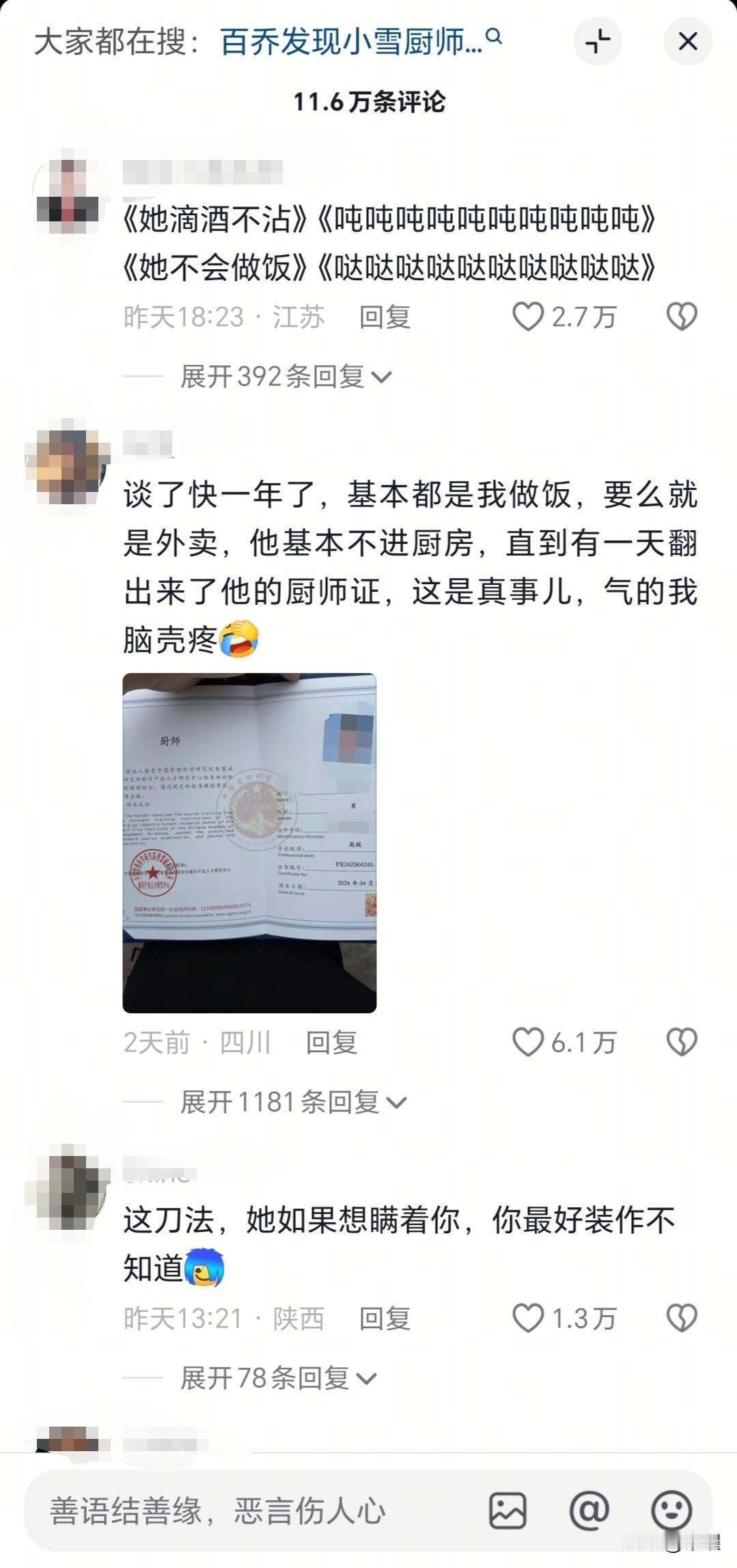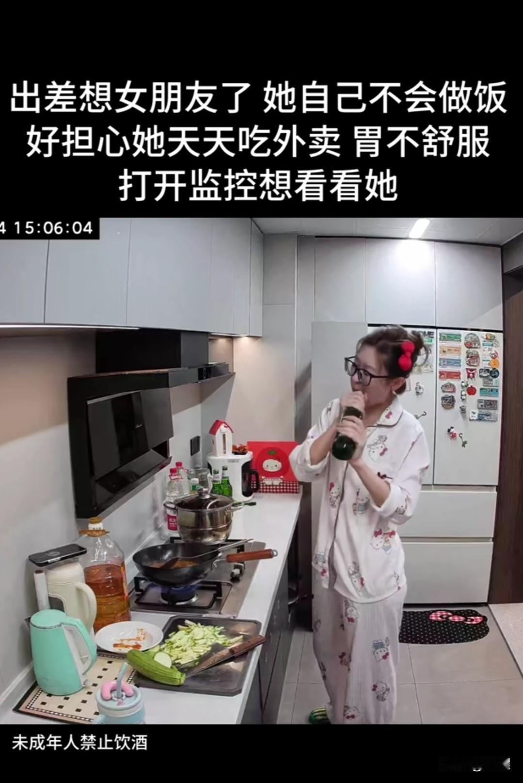 出差时惦记不会做饭的女朋友 怕她吃外卖伤胃, 点开监控却看到她挥舞着菜刀在厨房忙碌, 切菜、做饭,秒变大厨 甚至还了一口“饮料”。 原来不是不会做饭 只是不想做饭 以为是生活废柴 也可能是囤货的厨房特种兵 评论区里, 有人做饭一年后找出了老公的厨师证 有人结婚前交了好多年房租,是媳妇儿帮自己找的房子,直到后来他看见了房产证。 开始还觉得是些搞笑的新闻。 经不住细思,也不可以细思 但愿只是 我悄悄长大,你偷偷牵挂 的双向温柔吧~