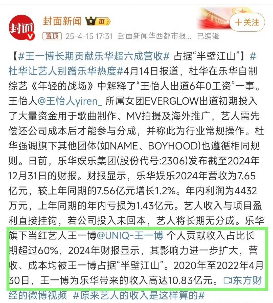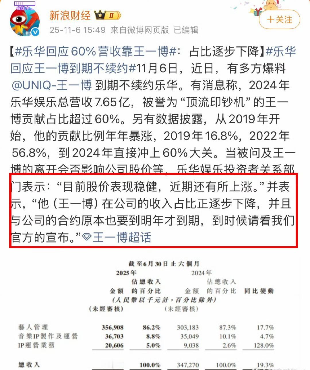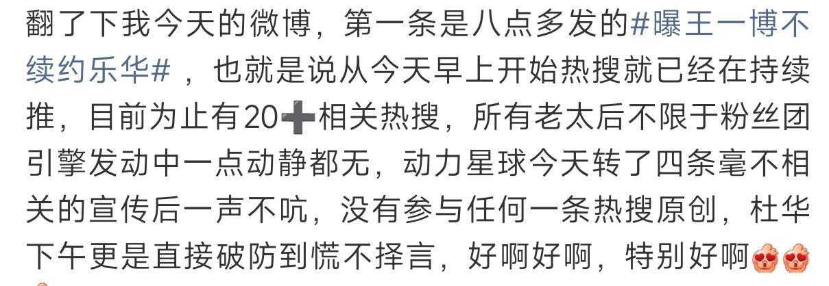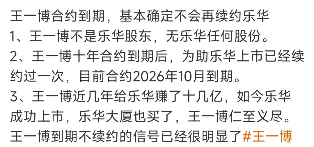 望周知:没有所谓的“解约”,不要篡改字眼儿,解约是解约,到期不续是到期不续,二者天差地别。 王一博与乐华合约到2026年,到期续与不续都不存在“解约”一说,只有“续”与“不续”,不要再造谣。 1⃣️王一博不是乐华股东,无乐华任何股份,工商信息可查无关联。 2⃣️王一博十年合约到期后,为帮助乐华顺利上市已经续约过一次!目前合约2026年10月到期。 3⃣️王一博近几年给乐华赚了十几亿,如今乐华成功上市,乐华大厦都买了,王一博对乐华可谓仁至义尽居功至伟! 一个没有什么资源和助力给到王一博,而是一直拖他后腿吸他血想尽办法只想往他的影视综艺里塞糊糊的公司,从13岁签约到练习生出道到全面爆火仍然续约,王一博对乐华可谓仁至义尽。 该感恩的是乐华,乐华的那位杜女士如果还有一点人性,就尊重王一博意愿,不要再下黑通稿不要再疯狂让氵军洗地了! 短短一天时间20+的热搜,看到“荒谬”两个字时,听到了杜女士绝望破防的声音[笑哭]。 王一博与乐华娱乐到期不续约