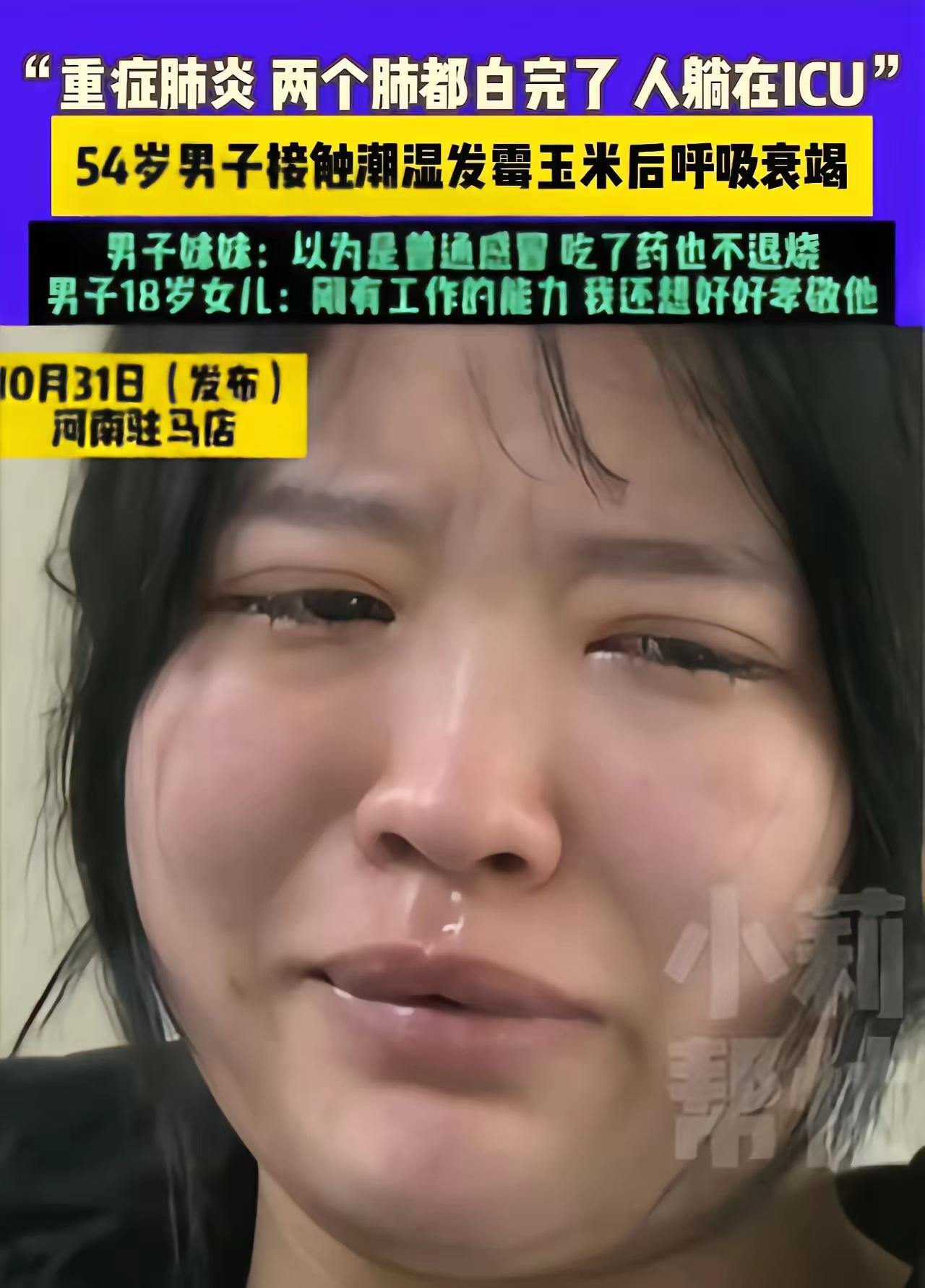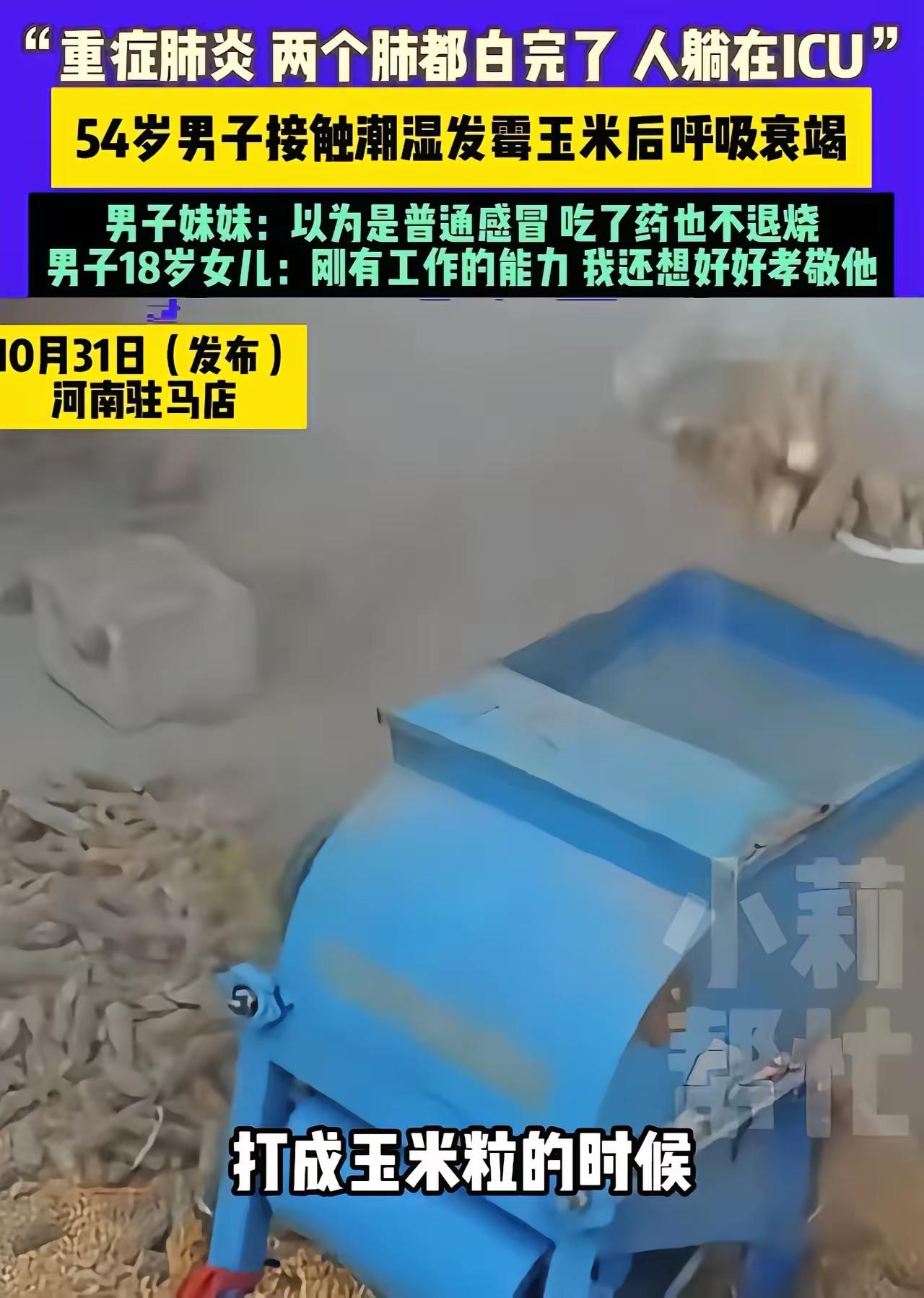 我的天呐!霉玉米能把人送进ICU,乡下人种点粮是真疼得慌啊! 河南驻马店那54岁大叔,玉米潮得长霉了,哪舍得扔?那都是顶着日头淌着汗种出来的,心里盘算着打了粒喂猪喂鸡多好,总比浪费强。可哪想到,打玉米时那霉灰乱飞,全钻进他肺里了! 当晚就发烧咳嗽,他当是着凉,买了点感冒药硬扛,庄稼人过日子就想省点,怕给家里添负担。 结果越扛越糟,昏沉沉连气都喘不上,女儿看见他脸白得像纸,赶紧送医院。一查两肺严重感染,得进ICU!大叔一听医药费,直摆手说不治了,钱留给孩子。刚满18的女儿只能哭着找媒体求助。 霉菌是真毒啊!乡下人种粮不易,但命比粮食金贵,霉透的东西咱真不能硬扛!玉米霉坏 玉米霉菌毒素 玉米霉 玉米烂霉