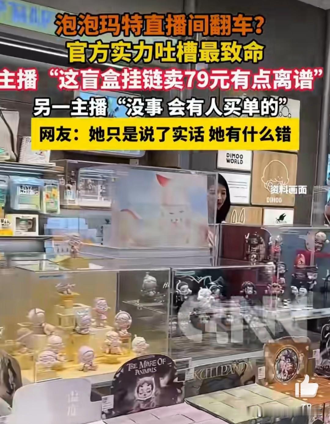 泡泡玛特直播事故,工作人员拿着dimoo原价79块挂链盲盒说“哎嘛,这东西卖79确实有点”,另一个工作人员说“没事会有人买单的”。 但总体而言,问题不大。 虽然这次的“事故”价格又是熟悉的79。 但缺少了花西子事件时的“嚣张跋扈”。 主播没有嗔怪打工人嫌贵是不够努力,而更多是感慨,产品卖的贵了。 因此,整体上虽然是直播事故,但影响绝对要比先前小。 另外,泡泡玛特这种东西,本来就有高昂的溢价。 这应该是每个购买者都心知肚明的。