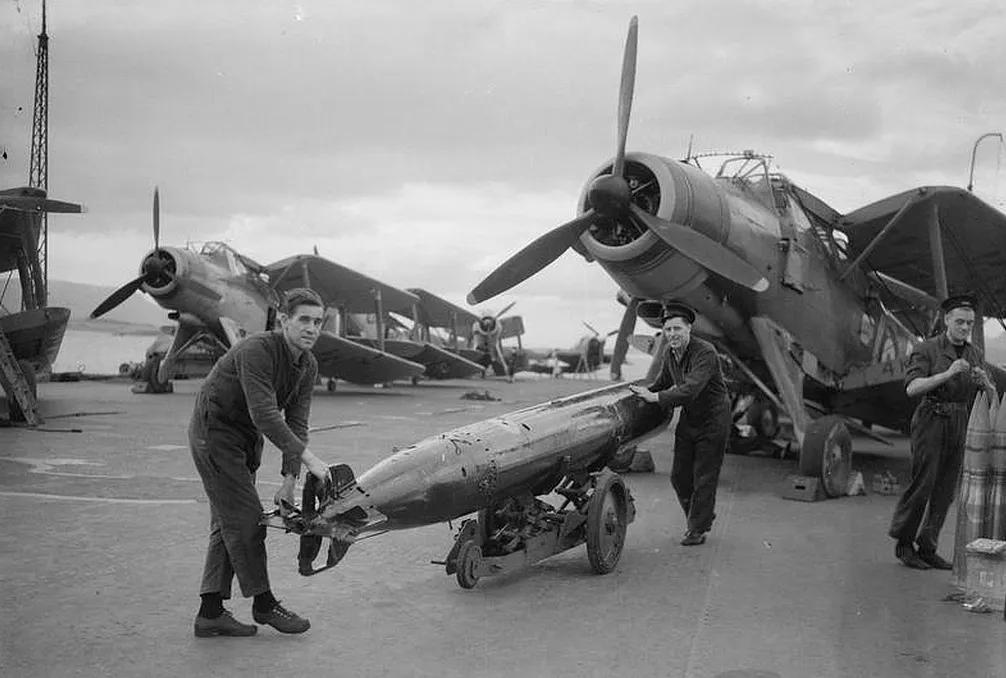 二战时期,英国,肯特郡,瑞德尔机场。英国空军学员正在“大青花鱼”鱼雷轰炸机旁进行训练鱼雷操作。 “大青花鱼”鱼雷轰炸机是英国1940年投产的双翼鱼雷轰炸机,配备布里斯托“金牛座”发动机,可携带730公斤鱼雷或深水炸弹,主要部署于光辉级航母。该机比之前的鱼雷机显著提高了舒适性:封闭式座舱,有供暖,甚至还有一个厕所。不过,该型鱼雷机的战绩不佳,不如它的兄弟”“剑鱼”鱼雷机那么大名鼎鼎。 瑞德尔机场是位于肯特郡的英国海军航空兵训练基地,设有鱼雷装载训练场与模拟甲板设施。