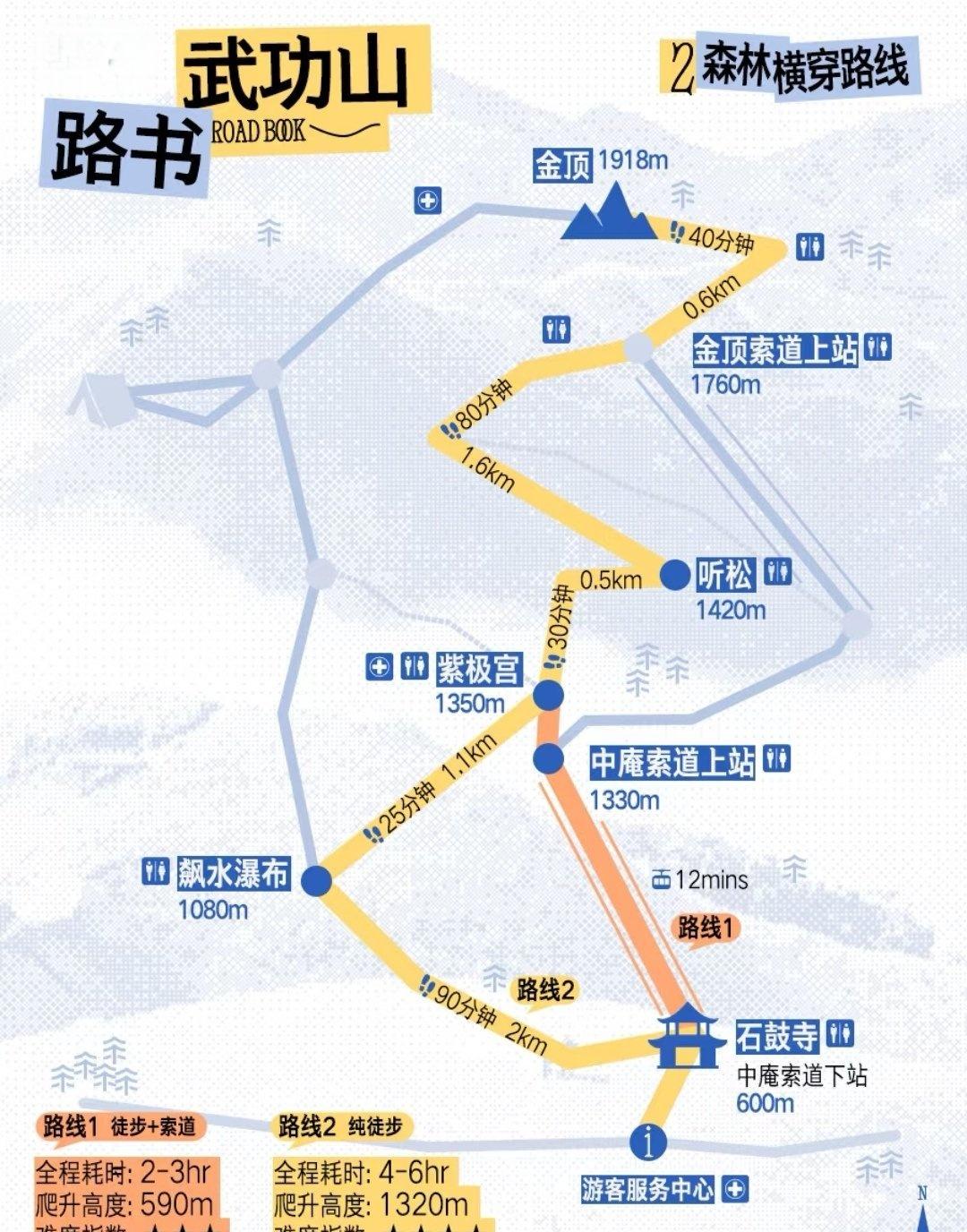 一、上山路线: 从游客服务中心坐免费转运大巴到达石鼓寺即登山口,走右侧阶梯,上中