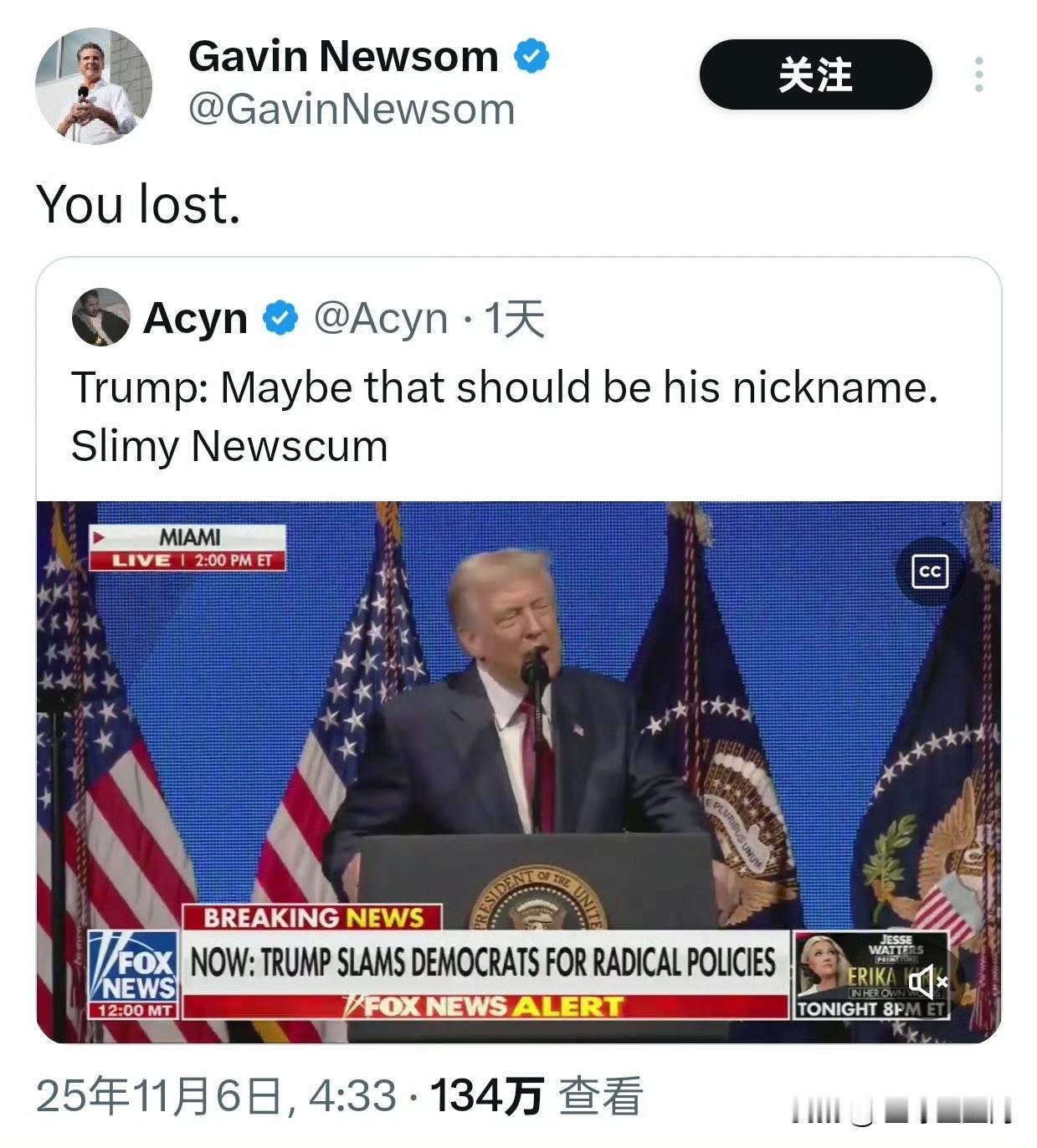 特朗普嘴人特别搞笑,给纽森起外号Slimy Newscum虚伪败类。之前给拜登起外号瞌睡乔,喊佩洛西疯婆子。竞选的时候说哈里斯和拜登都是智障,哈里斯是先天智障,拜登是后来变成智障[笑哭]