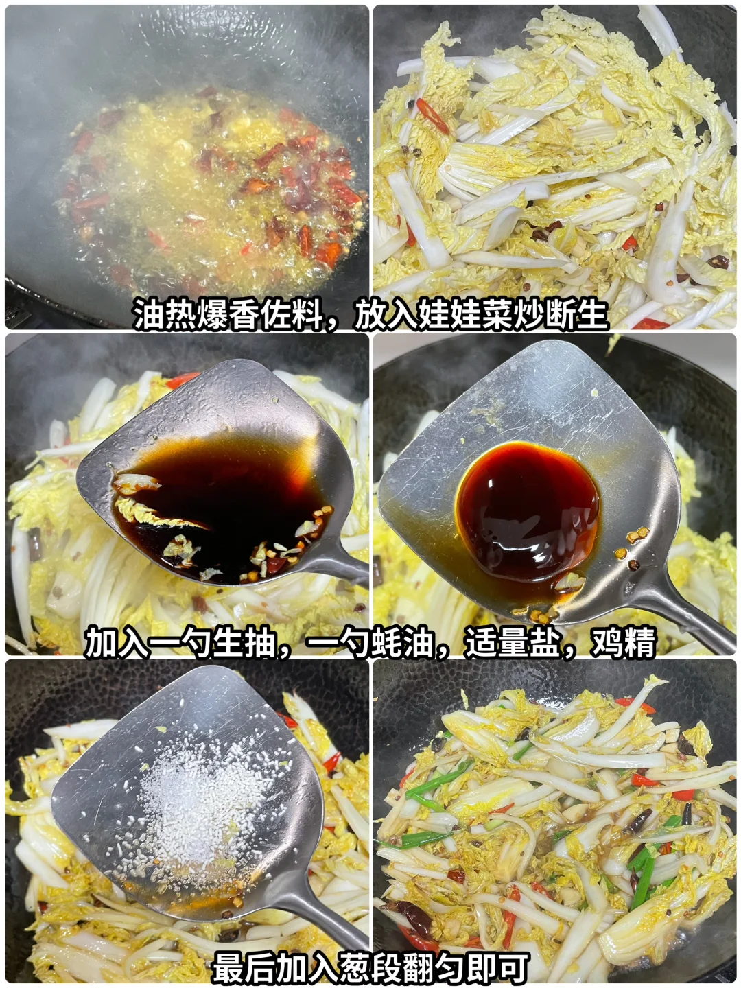 姐妹们,今天给大家出一个素炒娃娃菜,虽然这是个素菜,但是也是巨下饭的素菜。喜欢的姐妹可以尝试做一下。 🌶️食材:娃娃菜 👩🍳做法: 1⃣️娃娃菜切丝准备一些葱段、干辣椒切段,再准备一些小米辣切段、花椒粒、蒜切粒。 2⃣️起锅烧油,油温较高时,放入干辣椒、小米辣、花椒蒜炒香,立刻放入娃娃菜翻炒至断生,然后加入1勺生抽、1勺蚝油,适量的盐翻炒均匀,出锅之前撒上葱段翻匀即可出锅,这样做出来的爆炒娃娃菜好吃又下饭,喜欢的姐妹试试吧
