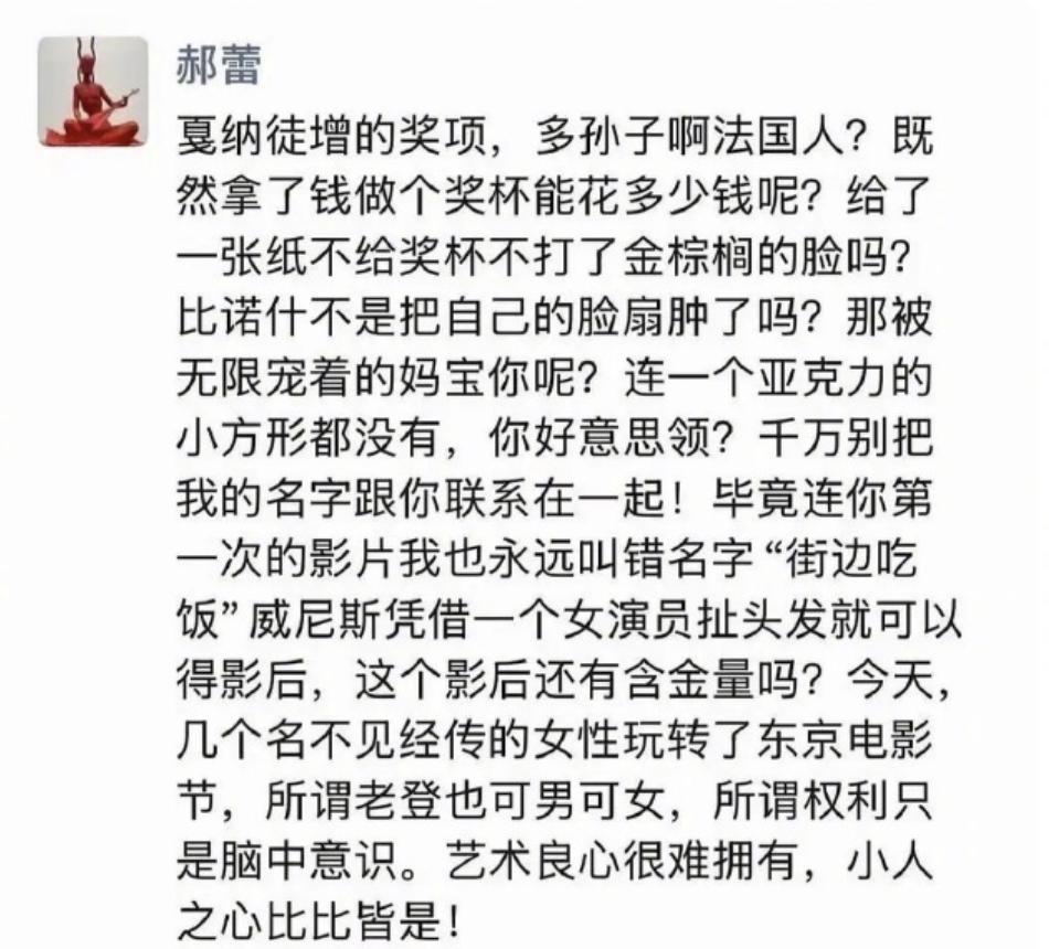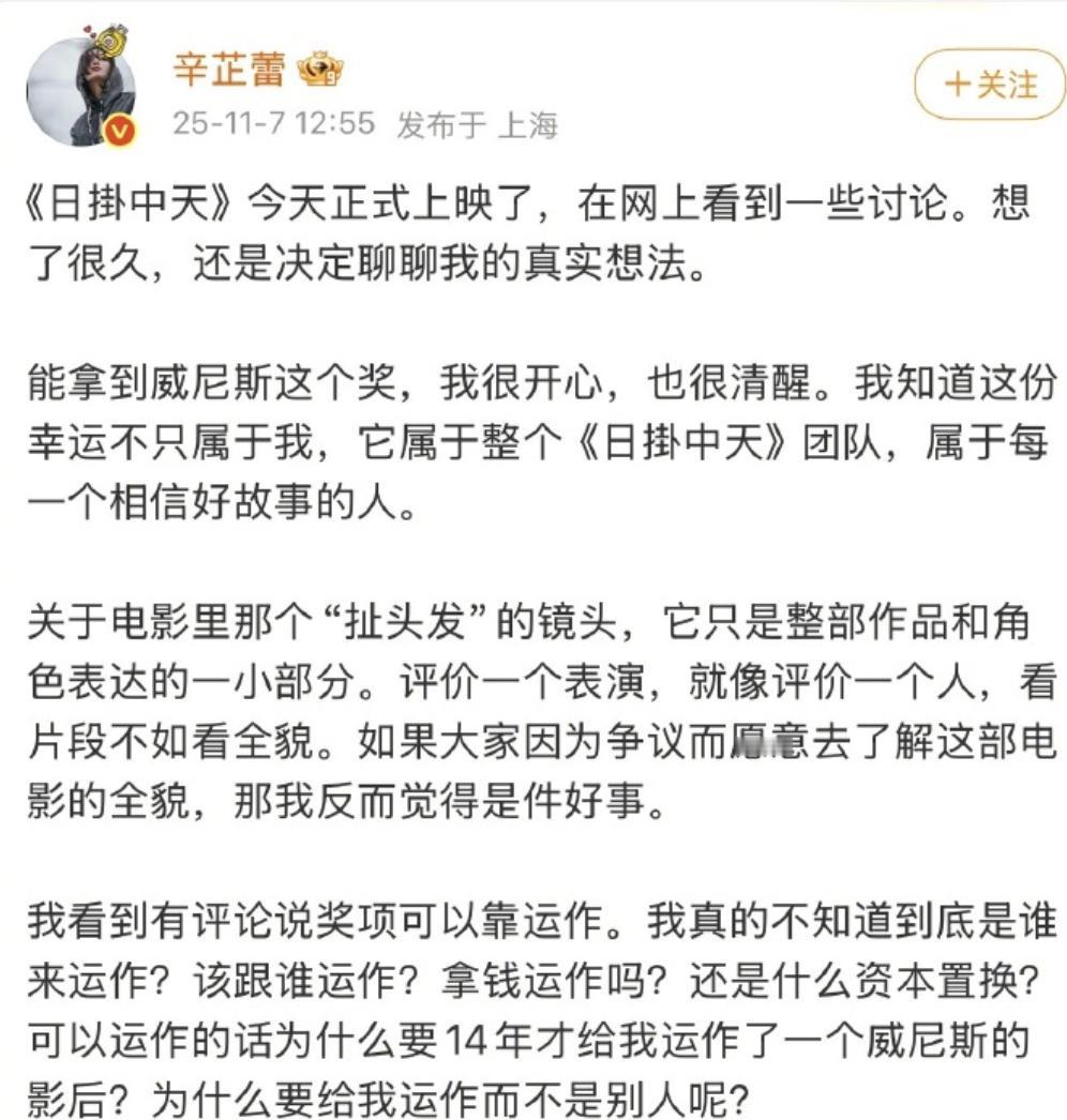 辛芷蕾和郝蕾撕起来了! 辛芷蕾凭借电影《日掛中天》在威尼斯拿影后这件事,郝蕾的点评是:威尼斯凭借一个女演员扯头发就可以得影后,这个影后还有含金量吗? 就是质疑辛芷蕾不配拿这个国际影后。 而辛芷蕾今天的回应也很干脆: 评价一个表演,就像评价一个人,看片段不如看全貌。意思就是说,郝蕾不能只看了一个片段就来评判她的演技好坏,至少应该看完全片再来评判。 从白百何撕王传君的东京影帝,到郝蕾撕辛芷蕾的威尼斯影后,总觉得电影圈这阵子太过于热闹了。 但是这些演员是否意识到了一个问题啊,那就是当他们还在为一个奖项争的面红耳赤的时候,观众并不在乎啊。 而且当下国产电影的质量到底怎么样,大家都清楚啊! 还是去提高电影质量去吧,不然大家真的都去看短剧了。