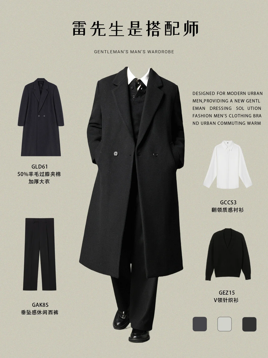 各位轻熟龄的都市职场男士,还在为秋冬商务穿搭犯愁吗?今天给你们扒一套把“轻熟商务感”焊在身上的搭配,从通勤到轻社交都能打,直接拿捏高级质感! 这套look专为25-35岁的现代都市男士打造——不管是日常写字楼通勤、商务洽谈,还是稍正式的休闲聚会,都能让你在人群中脱颖而出。拒绝浮夸,主打一个“低调有品的精英感”,是轻熟男进阶穿搭的满分模板~ ✨ 单品解析:功能与优势双在线 • 50%羊毛过膝夹棉加厚大衣 作为整套的“门面担当”,50%羊毛含量兼顾保暖与质感,过膝长度瞬间拉满气场,夹棉设计让秋冬抗寒力直接拉满!深灰色调百搭不挑人,双排扣细节又添复古绅士感,是能穿很多年的经典款。 • 翻领质感衬衫 商务穿搭的“基石”单品!翻领设计比普通衬衫更显精神,面料质感高级,单穿或内搭都很ok,把它塞进西裤里,利落感一下就出来了~ • V领针织衫 叠穿神器!V领能在视觉上拉长颈部线条,黑色针织衫和衬衫、大衣形成层次,让穿搭不再单调,同时还能在微凉的室内充当“过渡层”,保暖又有造型感。 • 垂坠感休闲西裤 垂坠感面料是“显腿直、显高级”的关键!宽松度适中,不会像紧身裤那样拘谨,也不会过于邋遢,行走间的垂感让你每一步都自带“精英滤镜”。 👔 轻熟商务风格塑造秘籍 • 层次叠穿:衬衫+V领针织+大衣,三层叠穿既有温度又有腔调,解开大衣扣子的瞬间,层次感扑面而来。 • 色彩克制:以黑、深灰为主色调,低调统一却暗藏质感,这种“极简色系搭配”是轻熟商务风的核心逻辑。 • 细节制胜:从大衣的纽扣到西裤的垂感,每一处细节都在传递“精致不刻意”的穿搭态度,这才是轻熟男的魅力所在~ 这套穿搭直接抄作业都不会错!轻熟男们赶紧码住,这个秋冬就让质感成为你的名片~