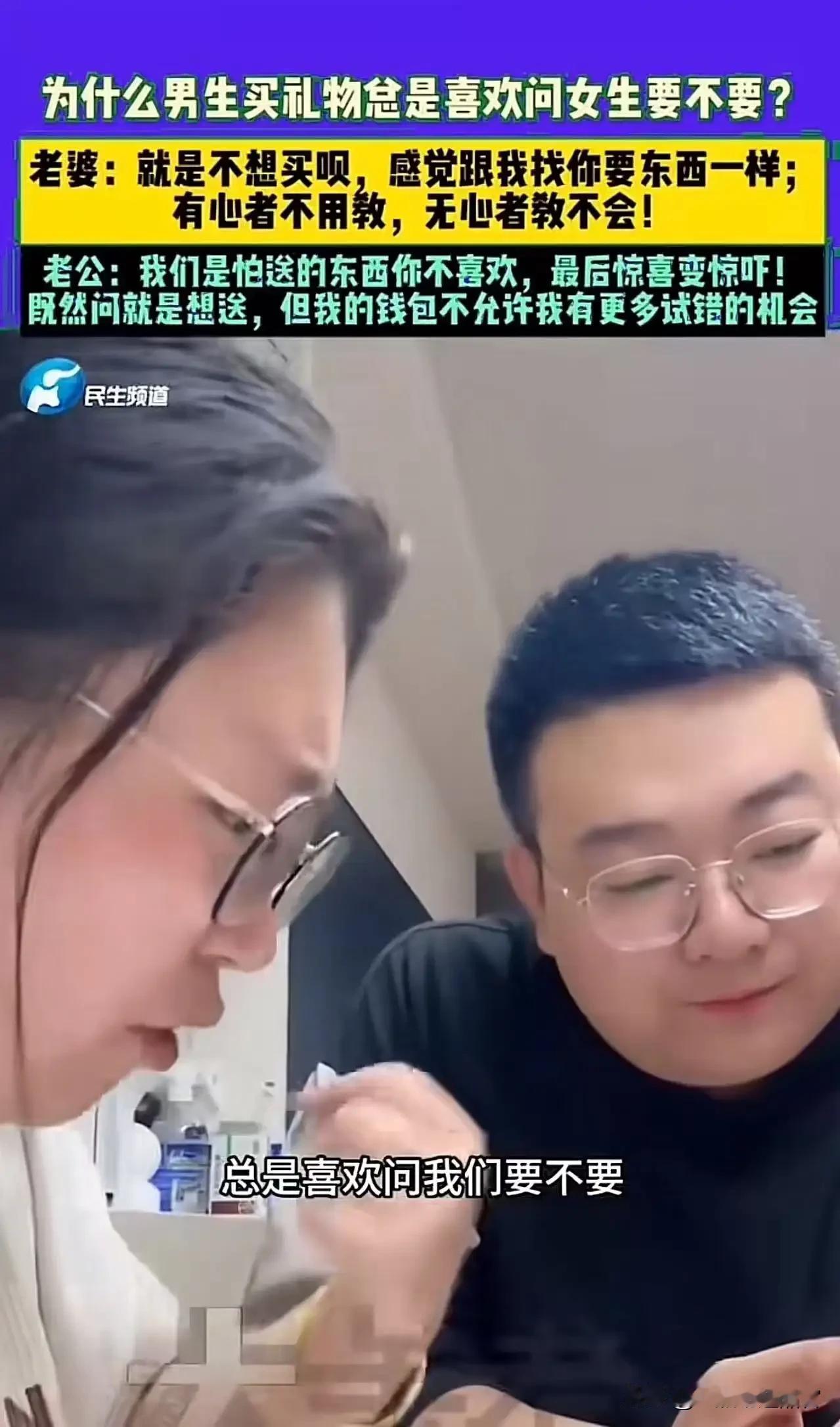 老婆怒斥:“为什么男生买礼物总是喜欢问女人要不要,就是不想买呗,感觉跟我找你要东西一样,有心者不用教,无心者教不会!”老公:男人真的太难了 !网友:当我老婆第一次给我说有心者不用教之后,我就再也没买过礼物! 这段对话反映了夫妻之间在礼物和沟通上的一些趣味和误解。老婆觉得男生问“要不要”其实是“有心”而不是“没心”,希望男生能主动一些;而男生则觉得自己已经很努力了,却还是被误解,感到挺无奈的。 网友的评论更是一语点破:当老婆说“有心者不用教”后,男生觉得既然不用教,那就不用买了,从此一戒不买礼物,可能也是一种“自我保护”或“省事”的表现。 这也反映出夫妻在表达和理解上的差异:有时候,男生可能会觉得主动送礼是“有心”,但老婆可能更希望男生能主动表达关心,而不只是问“要不要”。而女生也许希望男生能更用心,不只问“要不要”,而是主动准备一些惊喜。 这段对话提醒我们,沟通和理解在感情中非常重要。或许,双方可以试着多站在对方的角度,表达自己的想法,也多理解对方的期待,这样感情会更甜蜜。 如果你想要更具体的建议或分析,也可以告诉我!女生问你要礼物 买礼物送老公
