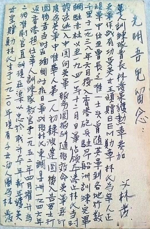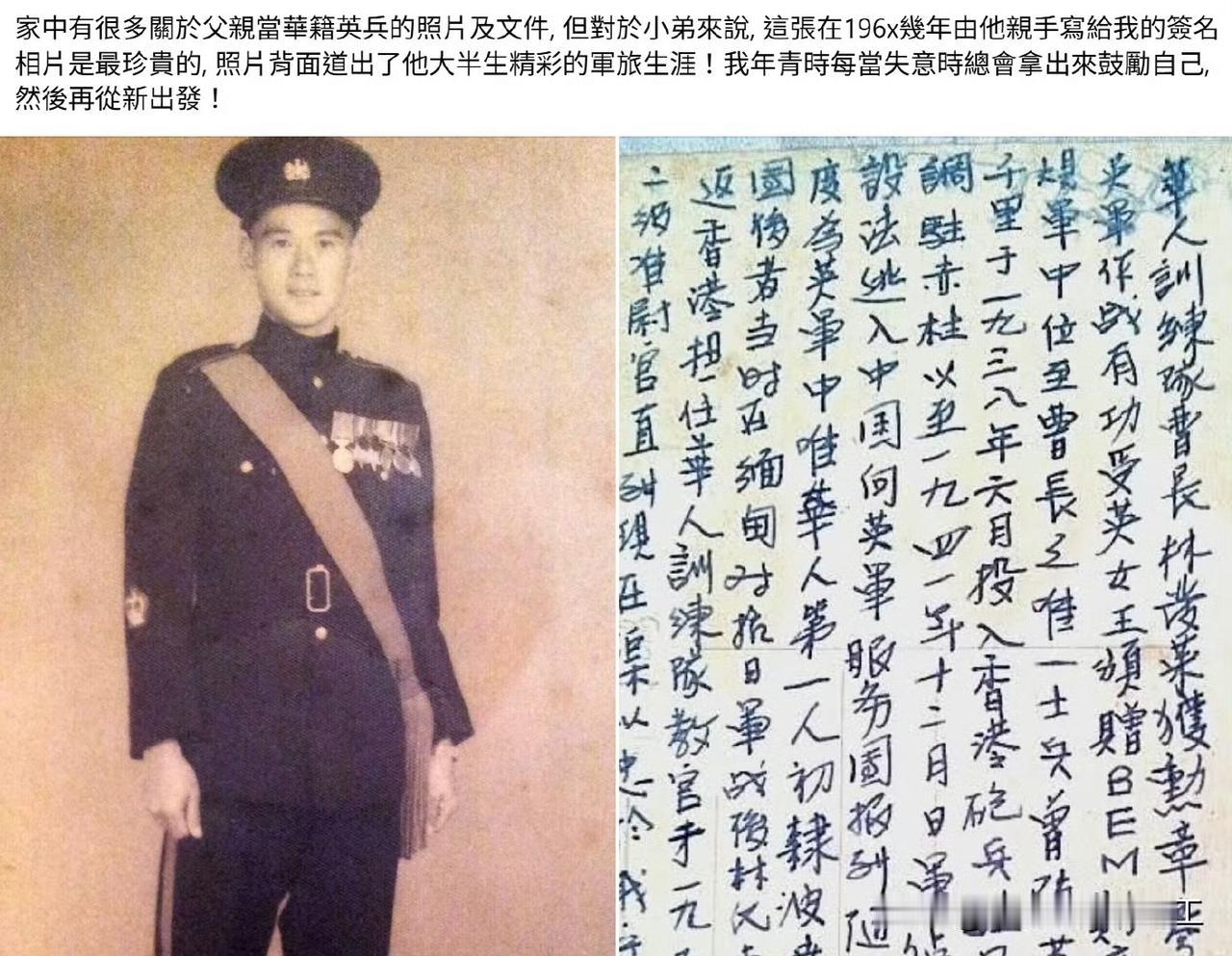 香港一位网友的珍藏,他的父亲当时给他的一封信,信中提到加入华籍英军参加抗日战争的事迹。 他表示每当失意之时,都会把书信拿出来看看,勉励自己。