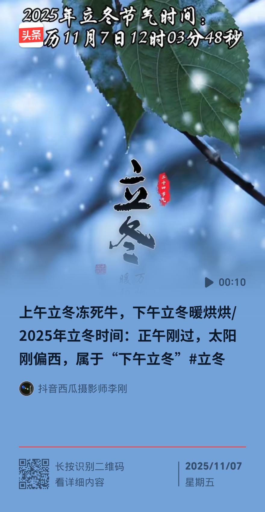 2025年立冬时间定了!11月7日12点03分,妥妥的下午场! 老辈立马搬出顺口溜:“上午立冬冻死牛,下午立冬暖烘烘”,网友直呼盼着暖冬。 节气这东西像老祖宗传的“生活暗号”,冬至、小满都有专属口诀,虽不如天气预报精准,却藏着实打实的生活智慧,至今还在拿捏日常!深秋立冬 立冬谚语 立冬感语录 立冬天气谚语