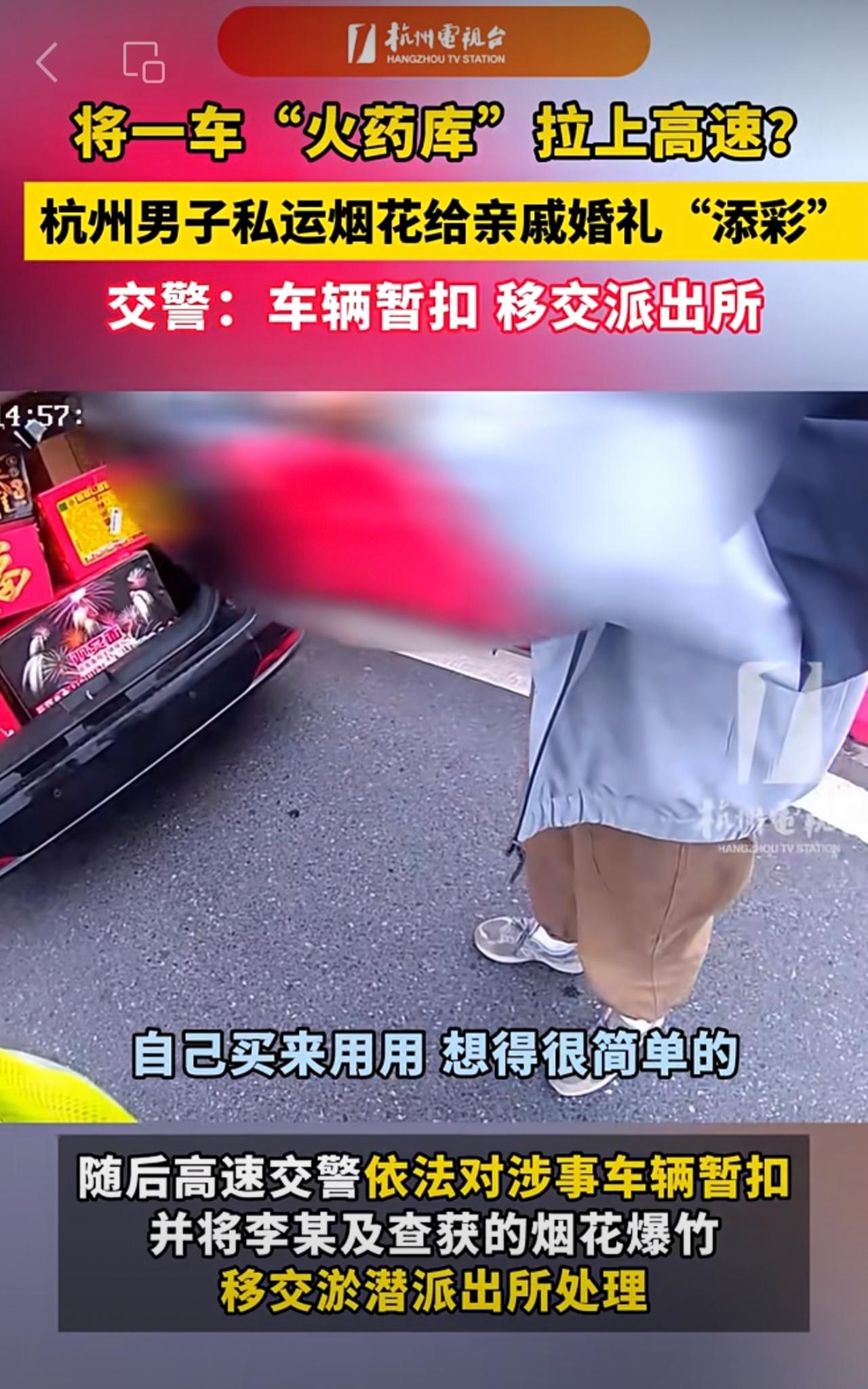 将一车“火药库”拉上高速?杭州 男子私运烟花 给亲戚婚礼 “添彩”,交警:车辆暂扣,移交派出所。