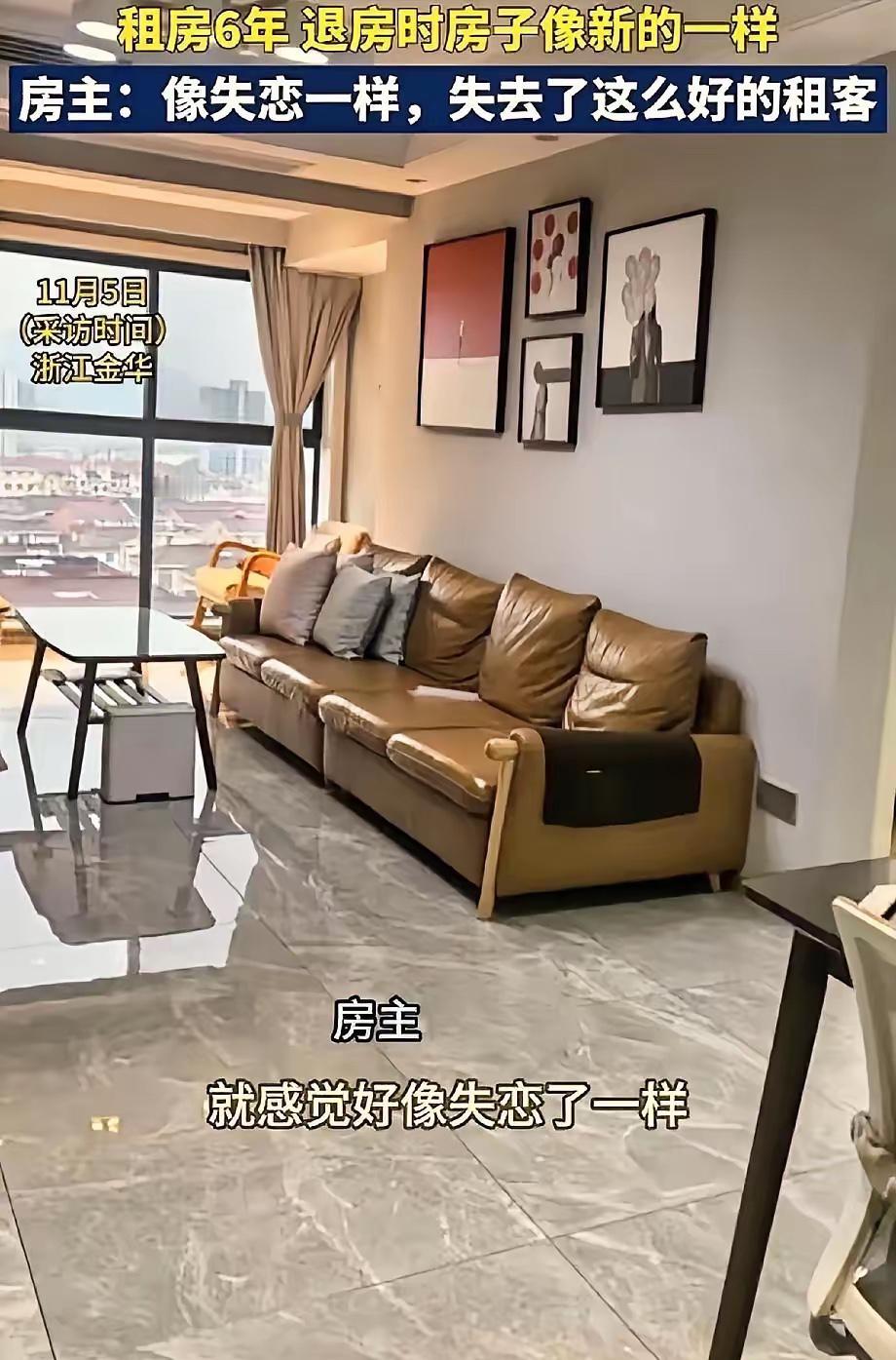 浙江,一位住了6年的女租客要退租,房东上门去收房,以为住了这么久,肯定要花大价钱翻新,还要费时打扫,没想到推开门,直接被感动哭了。 房东2019年把刚装完的新房租给女子,一个月2600块,一租就是6年,这6年里,俩人总共就见了两次面。 女子从不用房东催房租,每次都提前半个月主动转钱,房子有个小修小补,也自己解决,从没麻烦过房东。 现在女子要去横店安家了,要退租。房东去收房,打开门直接看呆了,地板擦得锃亮,厨房也很干净的,一点油污都没有,墙上也没有划痕,家具都套着定制的保护套,跟刚买的时候一样新。 房东坐在屋里的躺椅上,又感动又有点失落,忍不住哭了,说跟失恋了一样,这么好的租客,以后哪儿去找去啊。 房东还说女子是他生命里的贵人,这套房的10年房贷,女子帮着还了6年,退租时,女子还把带不走的用品都留给了房东,加起来差不多4000块。 不过房东对女子也很够意思,这几年有人想买这套房,房东想着她在住,就没卖,房租也从来没涨。 这次女子提前退租,按合同房东不用退房租,但房东主动退了她半个月的钱,俩人这双向奔赴太暖心了。 其实租房住,房子是临时的,但日子和人品不是。把别人的房子当成自己家一样用心对待,既是对生活的认真,也透着做人的分寸,这样的人走到哪里都招人喜欢。 网友纷纷称赞: 这样的租客实在太少了,真是个好女孩,谁娶到这女孩是非常幸运和幸福的,愿这位女孩一生平安康健。 每个人的人品品质的确也来自于父母的基因,父母的大爱品行素质同样感染所生的人,这就是品德。 当下这样心善的女租客不好找,房东遇上这种租客做梦都在笑,这也许就是缘分吧,可遇不可求,愿像这样高素质租客越来越多!