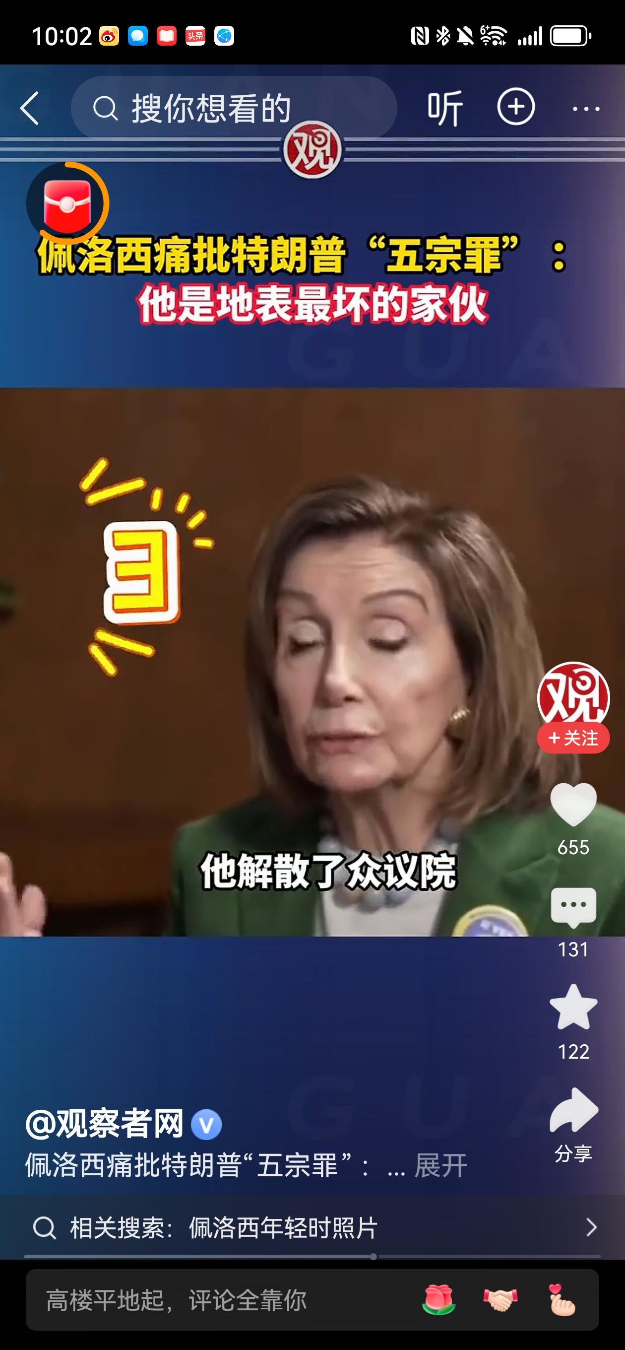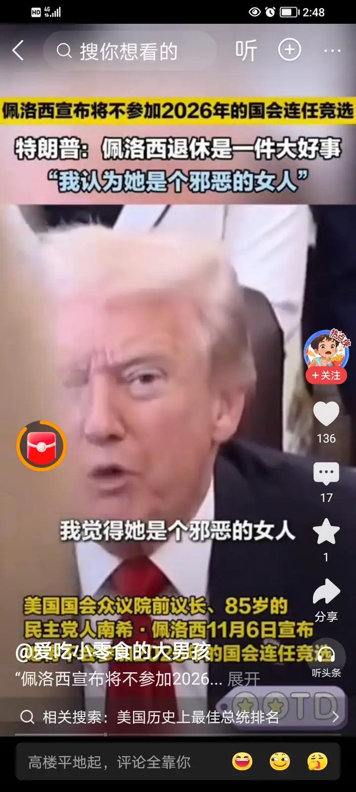 85岁的佩洛西终于要退休了。佩洛西亲自宣布:本届议员到期后,不再竞选,作为在位已经40多年的美国第一位女议员,也该享受生活了。 对于佩洛西的即将退休,美国总统特朗普显得特别高兴,特朗普说:“我很高兴她退休了,她对国家来说是一个巨大的负担,工作做的一塌糊涂,给国家造成巨大的损失和声誉损害,我认为她糟糕透顶,我认为她是一个邪恶的女人”。 两个80多岁的老男女,一道靓丽的风景线。佩洛西说特朗普是“地表最坏的家伙”,而特朗普则说佩洛西是“她是一个邪恶的女人”,这女人确实邪恶,没有干过什么正经事,坏人终于变老了。 特朗普与佩洛西属于不同的党派,互相攻击,互相伤害,实属正常。最为重要的是,特朗普上次执政期间,佩洛西以众议院议长的身份,两度弹劾特朗普,虽未弹劾成功,两人内心深处已经结下梁子。特别是2020年2月4日,美国总统特朗普在国会发表国情咨文时,口若悬河,滔滔不绝,等到特朗普讲完,佩洛西认为国情咨文满嘴跑火车,蹭蹭走到特朗普面前,把特朗普的演讲稿撕的粉碎,当着那么多议员的面,等于扇了特朗普的脸,如此恩怨也是有原因的。