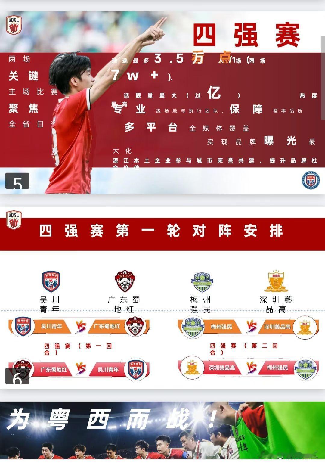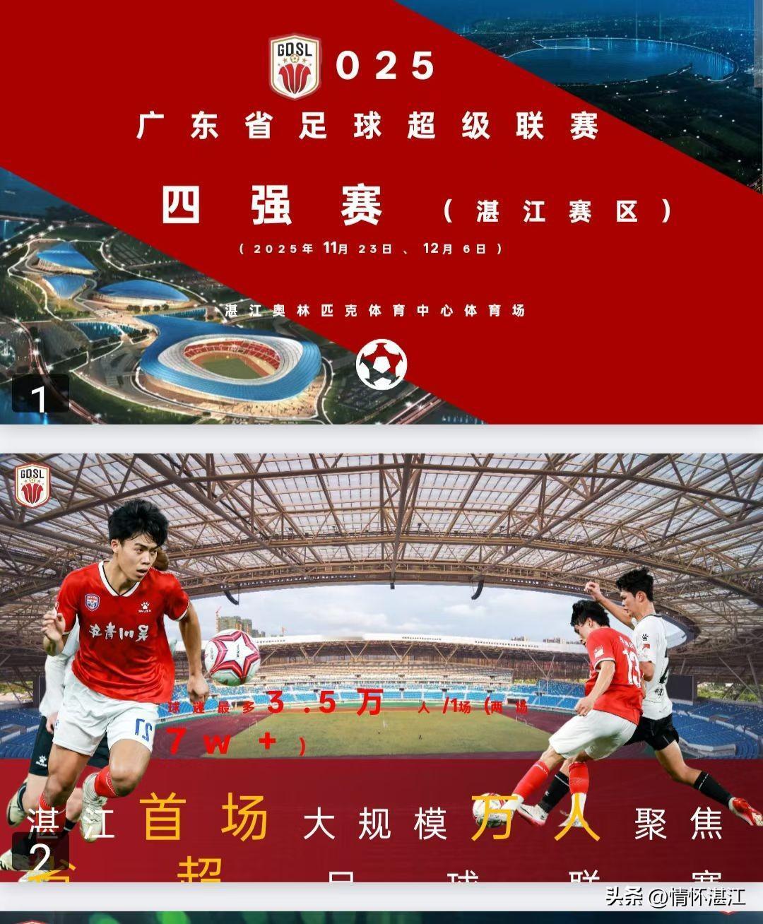 全国关注的2025年江苏省城市足球联赛(苏超)已经落幕,而南方的广东省足球超级联赛(省超)却正进入高潮,四强赛即将在湛江赛区打响。比赛时间为11月23日-12月6日。比赛场地为湛江奥体中心体育场。参赛队伍包括咱们湛江的子弟兵吴川青年队,广东蜀地红,梅州强民、深圳藝品高。喜欢现场看足球比赛的湛江球迷们,届时记得到达湛江奥体中心体育场,支持吴川青年队。同时期待吴川青年队利用主场的优势,顽强拼搏,力争获得省超联赛冠军!