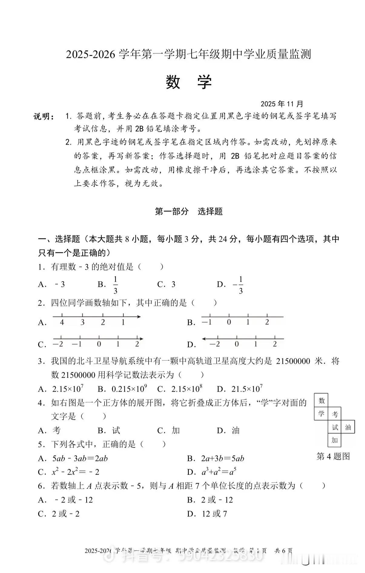 下周就是初一中考了,还没做麒麟中学的数学试卷,现在去做还来得及。这份试卷不仅是知识掌握程度的检验标尺,更是点燃学生逻辑思维、培养核心素养的优质载体,以鲜明特色成为区域初中数学教学的重要风向标。 试卷在题型设计上精准对标中考,采用8+5+7的经典结构,选择题、填空题、解答题梯度分明,让学生在日常练习中提前熟悉中考节奏,搭建起知识应用与应试能力之间的桥梁。这种“全真模拟”式的命题思路,既降低了学生应对中考的陌生感,也让教学方向更具针对性,实现了“以考促学、以考促练”的教学目标。 难度把控上,试卷展现出科学的分层思维:七年级试卷以4:3:3的易中难比例,侧重思维深度的挖掘,如定义新运算类题目渗透高中数学思想,抽象且灵活,倒逼学生跳出机械解题的舒适区;这种“因材施教”式的难度设置,既让基础扎实的学生得以施展才华,也为不同层次的学生明确了提升方向,区分度堪称优质。 命题核心更凸显“能力立意”的导向:几何题中勾股定理的综合应用、代数题中知识迁移的灵活考查,摒弃了单纯的知识点记忆考查,转而聚焦逻辑推理、逆向思维与实际应用能力。每一道新颖的题目,都是对学生“举一反三”能力的考验,引导教学从“灌输知识”向“培养思维”转变,让数学学习真正回归到提升核心素养的本质。 它以严谨的结构、灵活的题型、科学的难度,助力学生在数学学习中夯实基础、突破瓶颈,更培养了面对复杂问题时冷静分析、从容破解的能力。