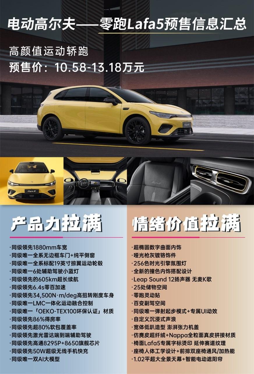 年轻人买人生第一台车该如何选?15-20万预算不妨看看零跑Lafa5! 凡事都有第一次,对于打算购买人生第一台车的年轻朋友来说,这无疑是一件更令人激动的事情。不过激动之余也有纠结,如何才能挑选到适合自己的车型呢?尤其是在预算有限的前提下,想要操控和高颜值兼顾可不容易,名爵MG4、大众ID.3和零跑Lafa5这三款可能会是你的菜。 首先咱们从外观入手,三车都是采用经典的轿跑造型,所以运动感营造都不差。不过相对来说,零跑Lafa5在细节上会比较突出,比如宽体轿跑套件搭配低风阻车身,这让本就蓄势待发的车身姿态再度迸发出肌肉感,个人感觉年轻朋友都会喜欢。而且就已知配置来看,零跑Lafa5还具有六种个性车色可选,像是张扬的电掣黄和沉稳的金属黑,进一步满足不同车主的个性表达需求。 接着再看性能驾控,零跑Lafa5基于LEAP3.5技术架构打造,搭载最大功率160kW电机,这能让它拥有6秒级的加速能力,话说在15-20万级能有这个性能体验的车型还真不多。更值得一提的是,零跑Lafa5底盘也经过Stellantis集团联合调校,配备前窄后宽轮胎、LMC一体化运动融合控制技术,所以说操控稳定性不会令人失望。MG4和ID.3的电机参数在同价位也算不错,满足对性能的基本需求没问题。 不过还有一点需要注意,零跑Lafa5的续航里程将超过600km,MG4和ID.3最多只有530km和451km,这个时候要是再结合一下价格,像零跑Lafa5预售价才10.58万起,并提供预售至高12500元的权益,品价比拉满,所以年轻人想要帅,又想要好开,不妨看看零跑Lafa5。