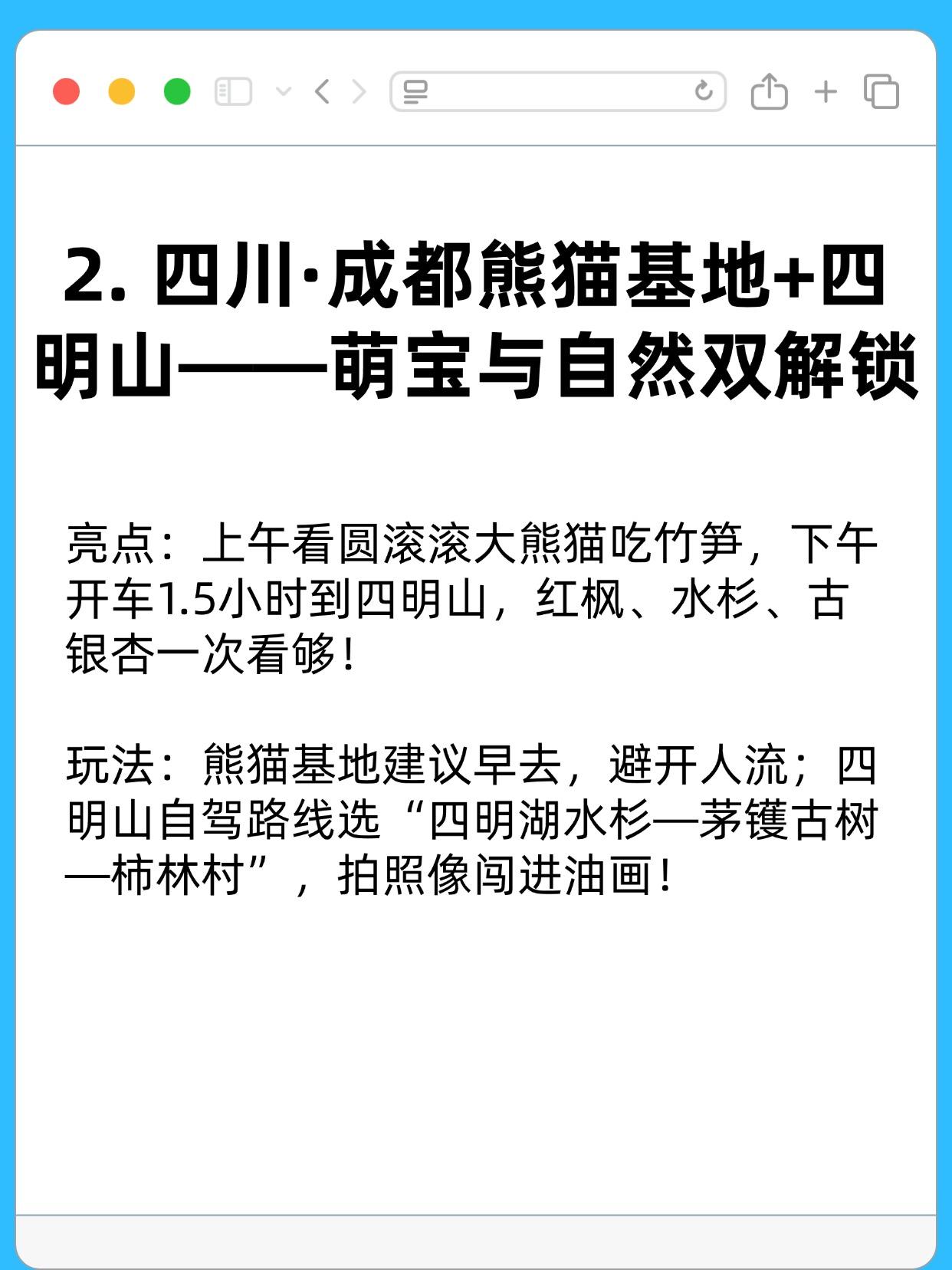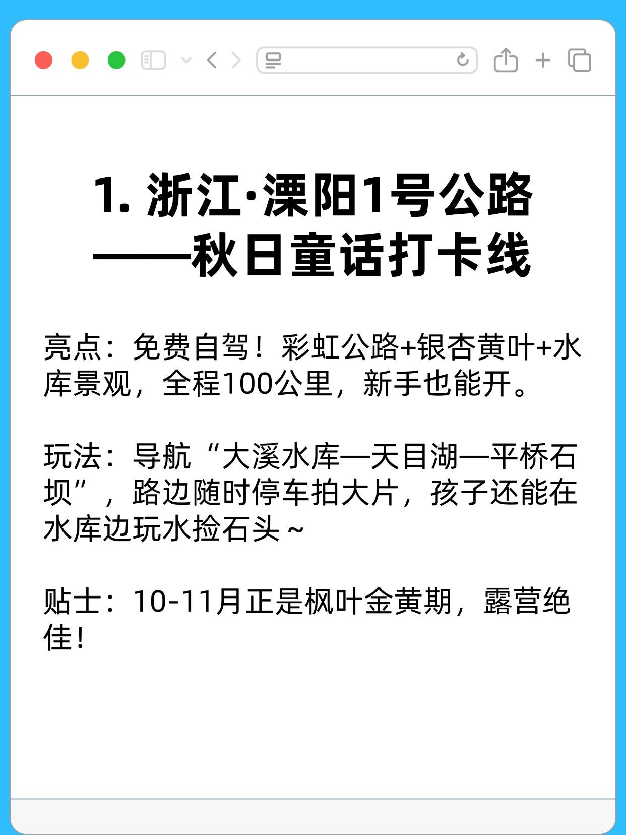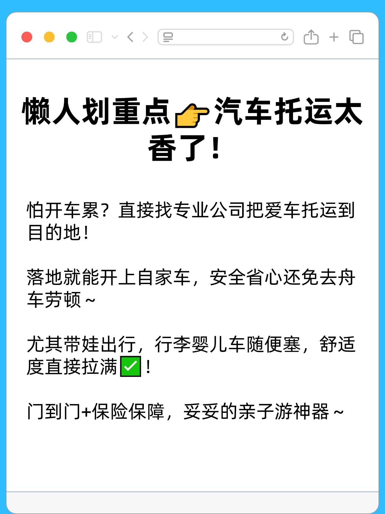 新出的春秋假+周末=整整5天小长假!这波福利不安排个亲子自驾游简直亏大了好吗!5天时间完全够咱们带娃撒欢儿,逃离城市拥抱大自然~今天就把我私藏的4大宝藏自驾地分享给大家,关键是还有懒人福音——汽车托运!全程躺玩不是梦! ✅ 推荐4个亲子自驾神地(亲测不踩雷!) 1. 浙江·溧阳1号公路——秋日童话打卡线 ••亮点:免费自驾!彩虹公路+银杏黄叶+水库景观,全程100公里,新手也能开。 ••玩法:导航“大溪水库—天目湖—平桥石坝”,路边随时停车拍大片,孩子还能在水库边玩水捡石头~ ••贴士:10-11月正是枫叶金黄期,露营绝佳! 2. 四川·成都熊猫基地+四明山——萌宝与自然双解锁 ••亮点:上午看圆滚滚大熊猫吃竹笋,下午开车1.5小时到四明山,红枫、水杉、古银杏一次看够! ••玩法:熊猫基地建议早去,避开人流;四明山自驾路线选“四明湖水杉—茅镬古树—柿林村”,拍照像闯进油画! 3. 云南·西双版纳植物园——热带雨林奇妙日 ••亮点:北方娃必冲!11月-4月是旱季,超适合带娃认植物、看蝴蝶、吃菠萝饭。 ••玩法:棕榈园拍亲子照,奇花异木园摸含羞草,晚上住傣族民宿,轻松不累~ 4. 山东·济南古村+植物园——文化自然两不误 ••亮点:朱家峪古村逛烟火气老街,植物园参加花朝市集、看花仙子巡游,活动超多! ••贴士:古村门票40元/人,植物园30元,性价比超高适合短途游 懒人划重点👉汽车托运太香了! 怕开车累?直接找专业公司把爱车托运到目的地!落地就能开上自家车,安全省心还免去舟车劳顿~尤其带娃出行,行李婴儿车随便塞,舒适度直接拉满✅!门到门+保险保障,妥妥的亲子游神器~