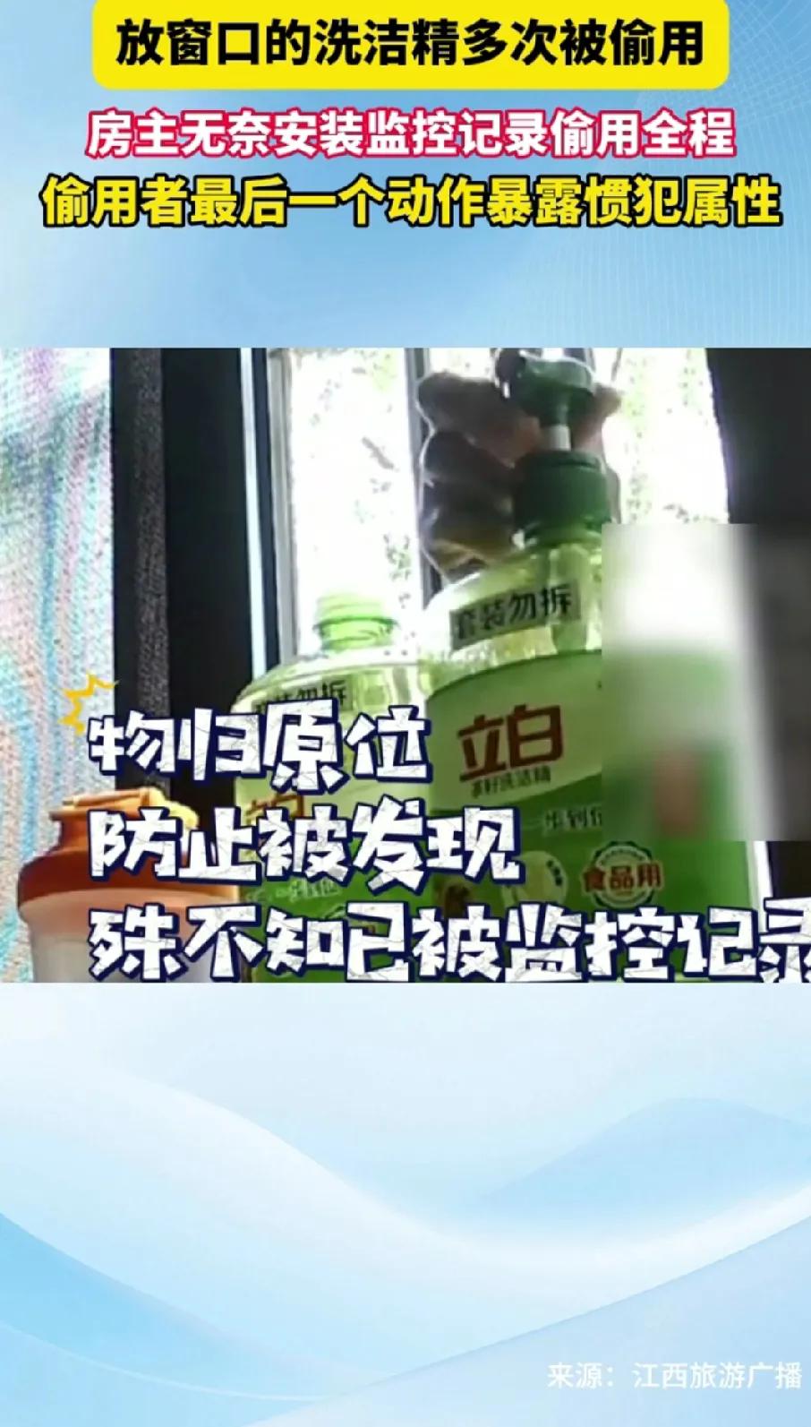 至于吗?真是活不起了!放窗口的洗洁精多次被偷用,房主无奈安装监控记偷用全过程。按完洗洁精后还恢复原位,惯犯! 遇到这样的事情真是闹心,没多少钱的事,却很膈应人!你说他偷吧,他只按了几下,没拿走整瓶,还知道物归原位!你说他不偷吧,就每天来那几下,够闹心的!这种人就是看到便宜不占就觉得吃亏了! 建议房主把窗户关起来上锁,或者把洗洁清放下面,省得他又来占便宜!就怕下这种哪天盘子没洗干净,拉肚子,还要找房主赔钱。