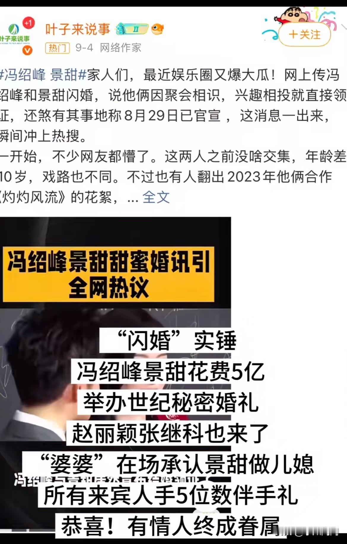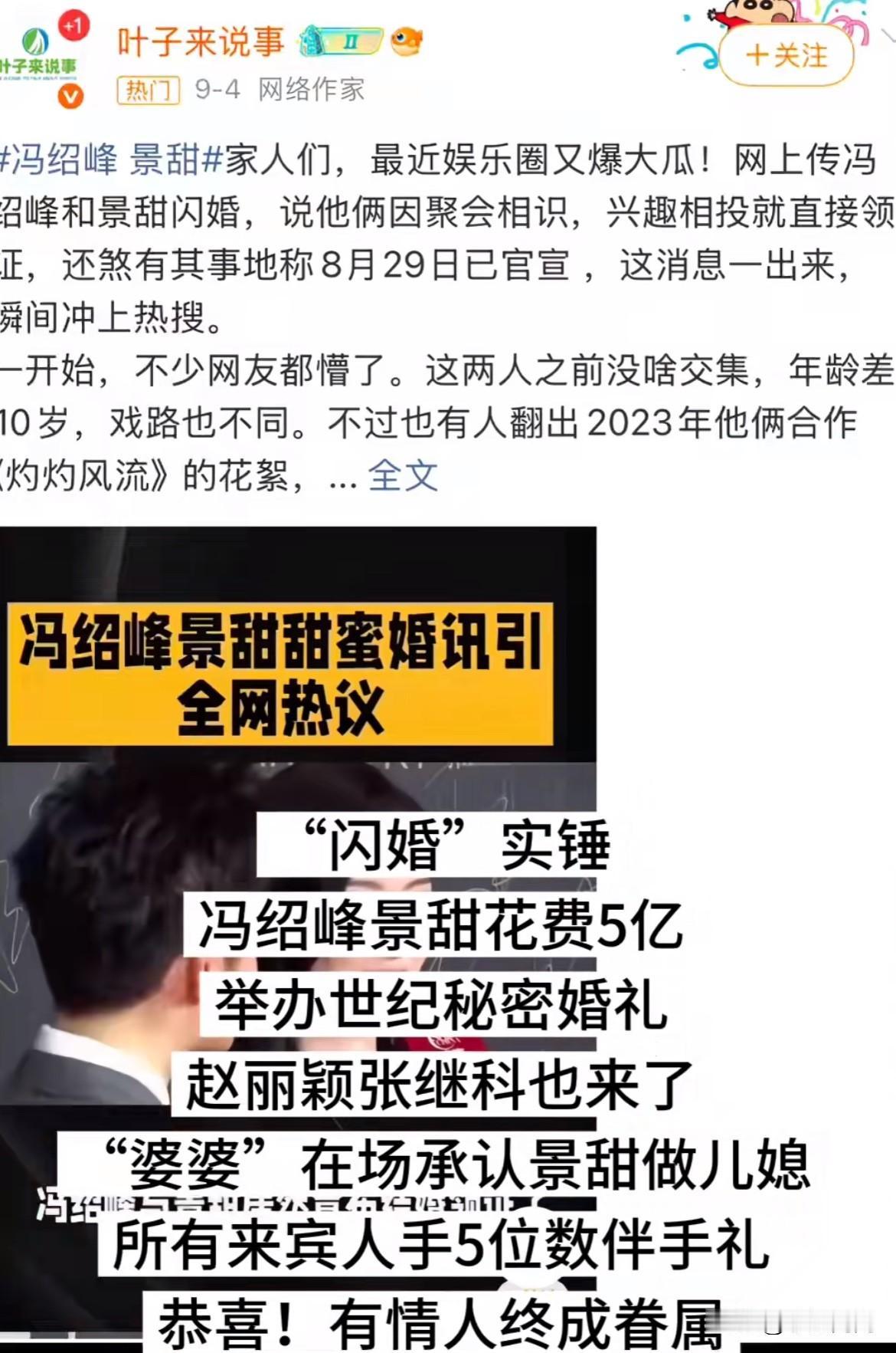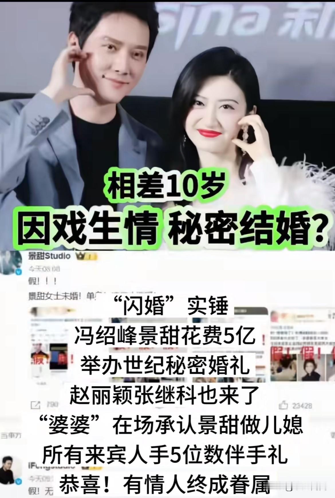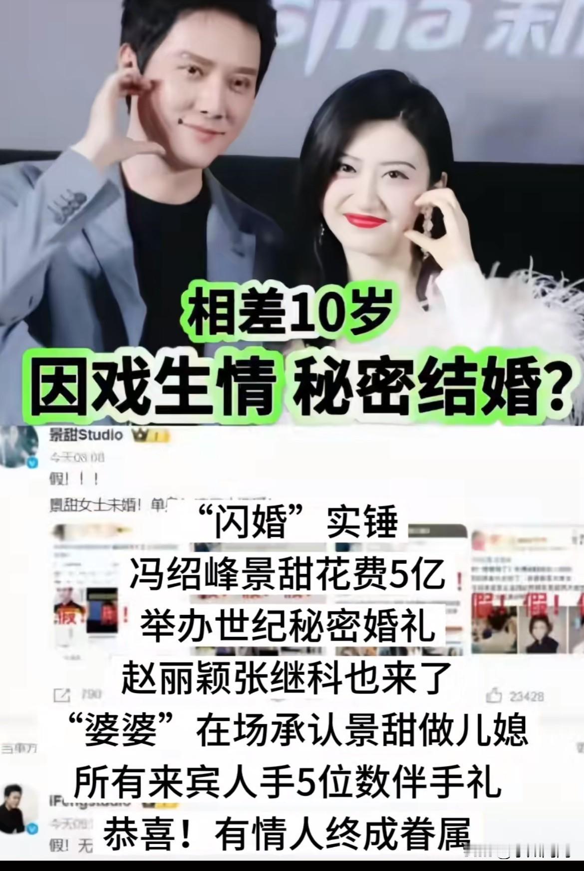 天呐‼️景甜和冯绍峰闪婚 冯绍峰花5一办婚礼 这是真的还是假的? 要睡了,刷到