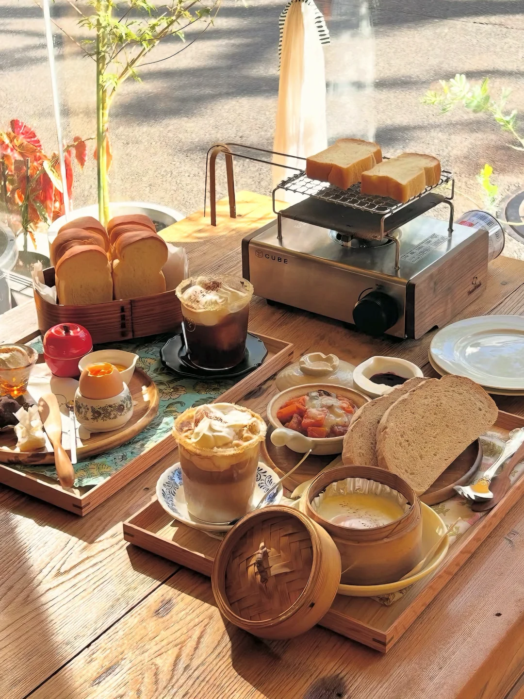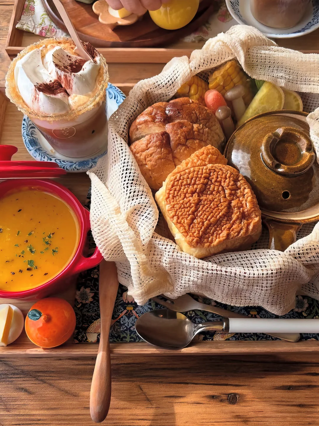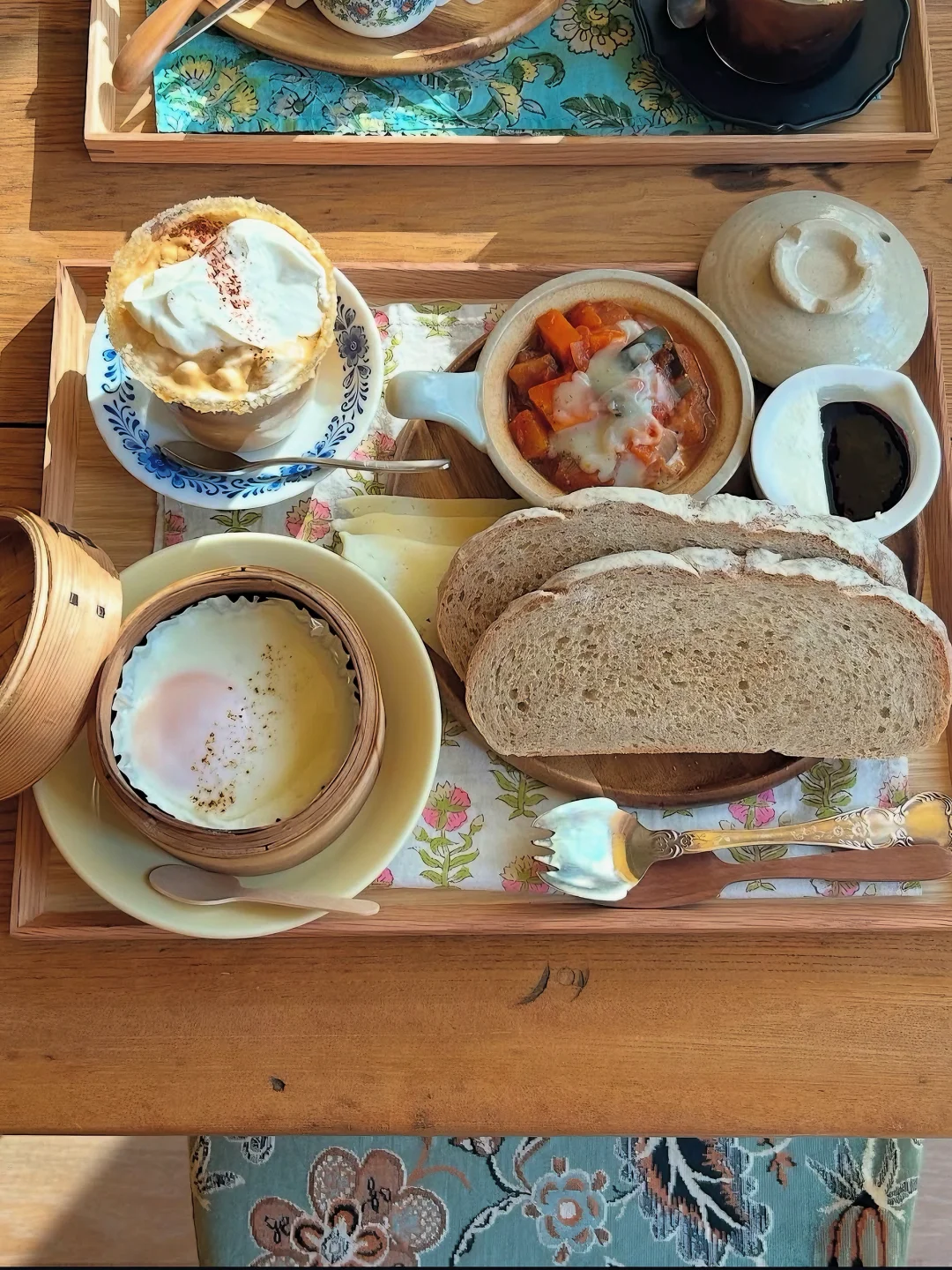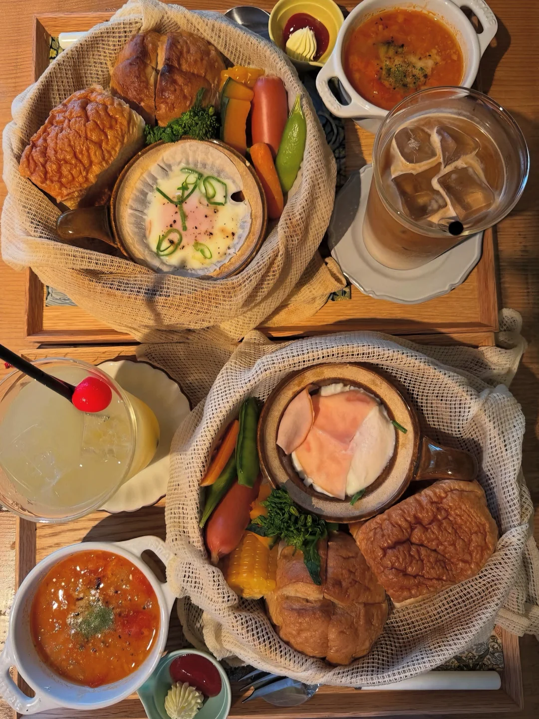 最有人气的是这里的蒸笼面包拼盘,里面还搭配了蔬菜和蒸蛋,蒸笼里放着面包。这里主打一个自己动手烤面包,可以自己挑选几种特制果酱,在烤好的面包涂上黄油或者果酱,早餐仪式感满满!咖啡和一些蔬菜例汤,味道也是很不错的~