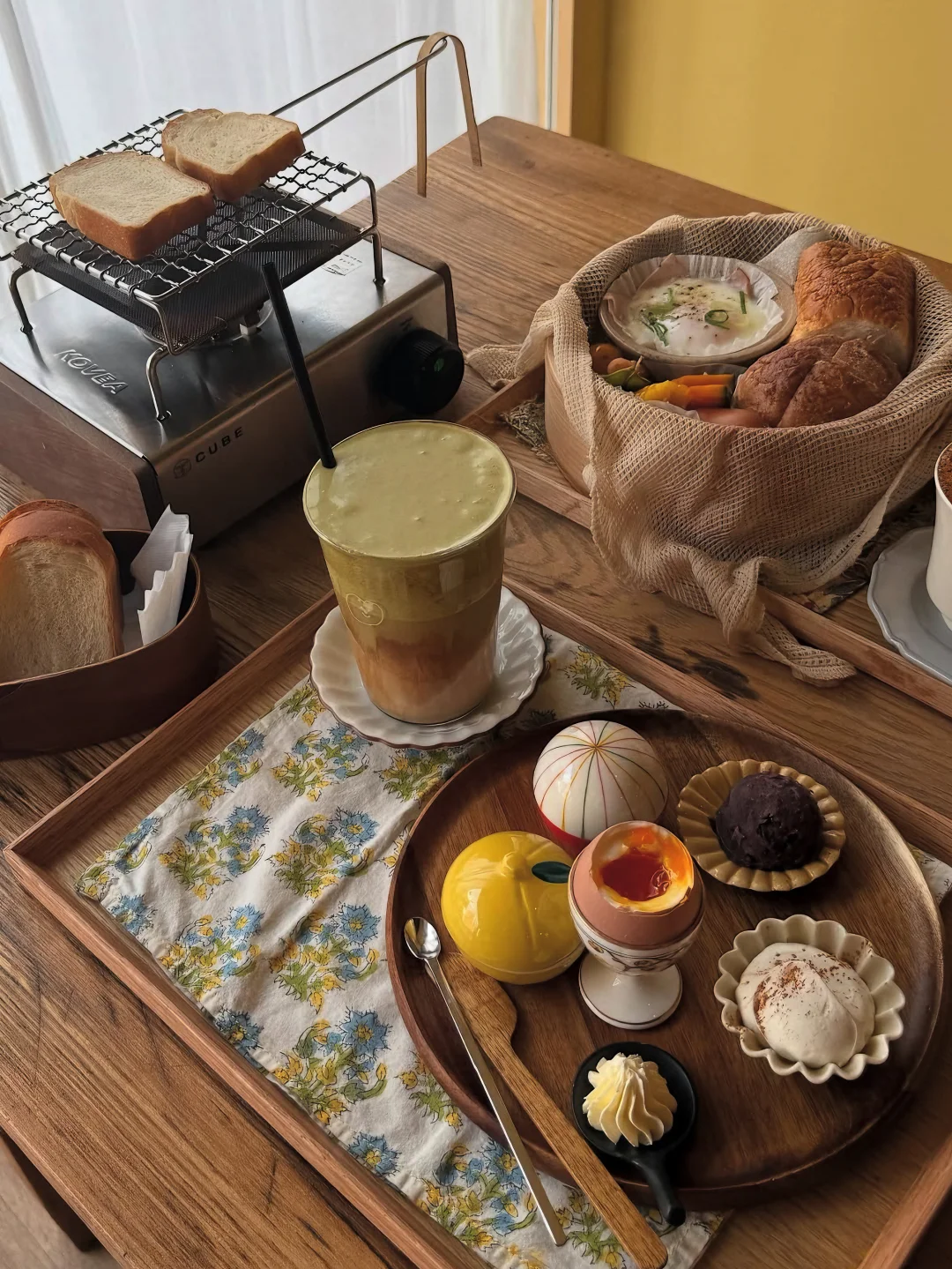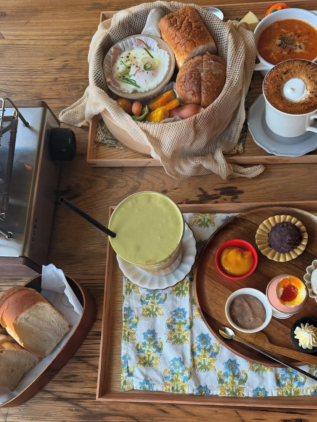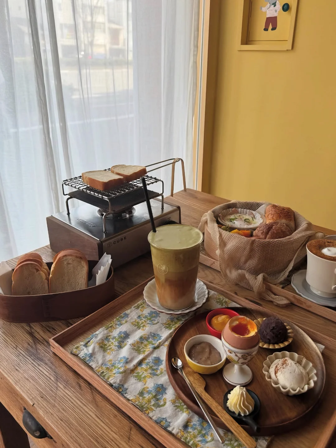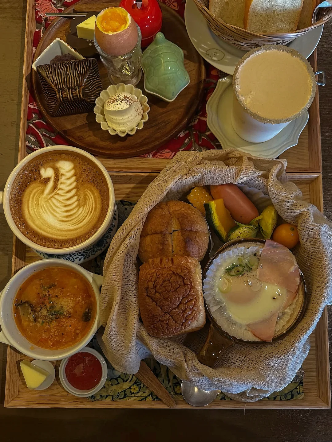 最有人气的是这里的蒸笼面包拼盘,里面还搭配了蔬菜和蒸蛋,蒸笼里放着面包。这里主打一个自己动手烤面包,可以自己挑选几种特制果酱,在烤好的面包涂上黄油或者果酱,早餐仪式感满满!咖啡和一些蔬菜例汤,味道也是很不错的~