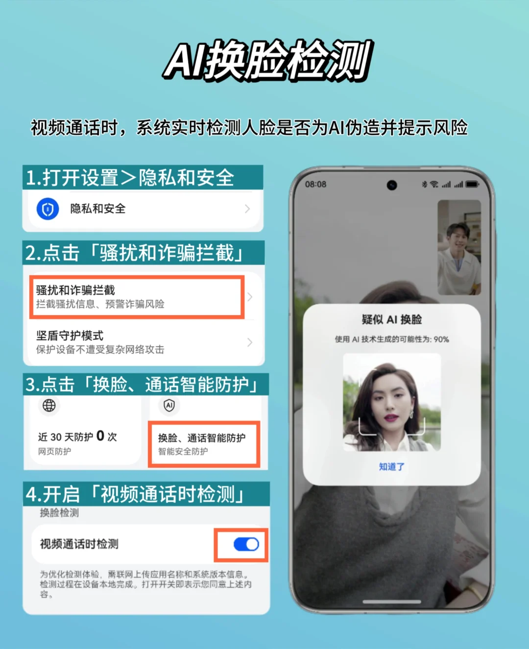 现在AI换脸防不胜防,这个功能就像AI“照妖镜”,在视频通话中可实时检测对方是否为AI伪造的,一旦识别立马提示,再也不怕骗子冒充亲友了🤗