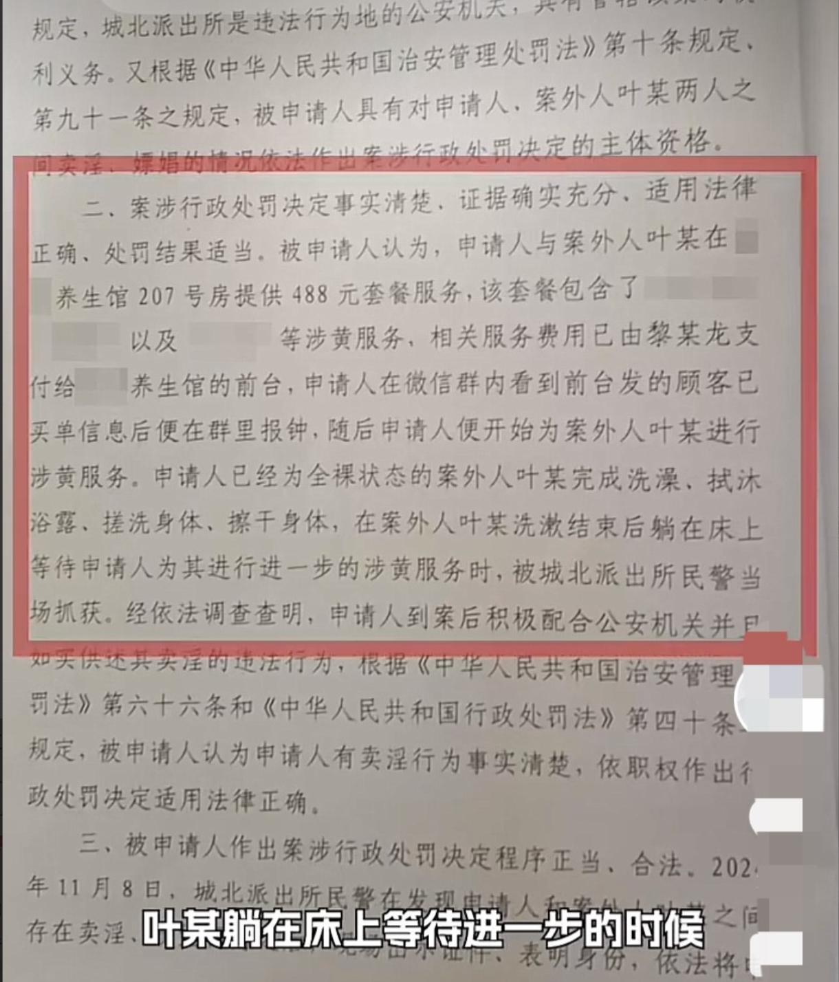广西贵港,一位尚在哺乳期女子,为帮补家用,在一家按摩店担任技师。一晚,女子为男顾客提供198元的泡浴服务,在给浴缸放水时,便衣民警突然闯入,将她与男顾客带走。不料,警方调查后,以女子提供488元全 裸涉 黄套餐为由,对其处以行政拘留一日的处罚。女子不服,坚称自己清白,哭诉在派出所被诱导签字,并质疑执法程序。事后,女子又是复议、又是诉讼,却不想还是栽在案卷中那份有她亲笔签名的询问笔录。法院这样判决。   唐女士是一位年轻母亲,和丈夫刚刚迎来第二个孩子,家庭的经济压力随之增大。   为了分担家计,还没给孩子断奶的唐女士,便选择外出工作,在一家提供美容护理、推拿按摩服务的店铺担任技师。   唐女士的丈夫对此非常理解与支持,信任妻子从事的是正规工作。   2024年11月8日晚上11点多,店里来了三位男顾客。   唐女士和一位同事分别在不同的房间为他们提供服务,唐女士服务的男顾客名叫叶某。   据唐女士事后回忆,她正准备为叶某进行一项198元的泡浴按摩服务,刚在浴缸里放水,突然,一名身着便衣的帽子叔叔闯入房间,迅速给叶某戴上手铐,随后将唐女士和叶某一同带走。   次日,警方对唐女士作出了行政拘留1日的处罚,理由是:唐女士向叶某提供了488元全LUO泡浴等涉 黄服务,其行为构成了违法。   唐女士感到万分委屈,坚称自己从未提供过任何违法服务。她表示,当晚为顾客预约的是198元的正规泡浴按摩,并非警方所说的488元套餐,更不存在所谓的涉 黄行为。   唐女士强调,帽子叔叔闯入时身着便衣,且未出示证件,在派出所,她因害怕和不解哭了很久,民警则反复劝说她“配合一下,签个字明天就能走”。   唐女士自称不懂法律,在那种情境下,最终在询问笔录上签了字。   笔录中记载,唐女士曾承认自己和叶某说了388的套餐包含涉 黄服务,还说了叶某选了488的项目并把衣服都脱了进到浴缸里。   此外,叶某在询问时也陈述,技师在介绍套餐时,他已知道其中包含特殊服务。   唐女士的同事也证实,店里488元的套餐确实包含“特殊服务”。   事后,唐女士认为自己被误导才签字,第一时间选择了申请行政复议。   然而,复议机关维持了处罚决定。   唐女士仍不服,继续提供行政诉讼,要求撤销警方处罚决定及复议决定,并要求警方赔偿其因被限制人身自由造成的经济损失462.44元。   庭审中,唐女士坚持称自己提供的是正规服务,而警方在抓捕过程存在未亮明身份等程序瑕疵,且自己在派出所受到言语影响,并非自愿签字。   更为关键的是,唐女士要求警方提供当时的执法记录录像,以证明民警是否规范执法等。   对此,警方的回应是,由于执法记录仪内存卡出现故障,导致当时的录像数据已经丢失无法恢复,并就此向法庭提交了书面说明。   法院会如何判决呢?   公安部《关于以钱财为媒介尚未发生性 行 为或发生性 行 为尚未给付钱财如何定性问题的批复》(公复字[2003]5号)规定:行为主体之间主观上已经就卖 淫 嫖 娼达成一致,已经谈好价格或者已经给付金钱、财物,并且已经着手实施,但由于其本人主观意志以外的原因,尚未发生性 关系的;……都可以按卖 淫 嫖 娼行为依法处理。……   《治安管理处罚法》第六十六条规定:卖 淫、嫖 娼的,处十日以上十五日以下拘留,可以并处五千元以下罚款;情节较轻的,处五日以下拘留或者五百元以下罚款。   法院指出,唐女士本人签名确认的《询问笔录》中,明确陈述了其向顾客叶某介绍了包含特殊服务的套餐项目,以及顾客叶某已脱去衣物进入浴缸等待服务的事实。   结合最高法《关于行政诉讼证据若干问题的规定》,当事人对自身不利的陈述具有较高的证明力。   唐女士虽主张该笔录系在民警诱骗下所签,但其未能提供任何证据证明存在警方存在以欺骗、胁迫等非法手段取证的情形。   此外,违法行为人叶某的陈述、唐女士同事的证言均在关键情节上与唐女士的笔录内容相互印证,共同证明唐女士与叶某已就特 殊服务的内容与价格达成合意。   尽管本案中执法记录仪录像因故缺失,确为执法程序中的瑕疵,但该证据的缺失并不足以推翻由多名当事人证言及书面笔录所构建的、稳固的案件事实基础。   法院认为,对于该笔录的合法性与真实性,依法可予以采信,警方认定唐女士存在为违法行为,并无明显问题。   不过,唐女士主张帽子叔叔未着警服、未出示证件,属于程序违法。   法院指出,在查处此类违法活动时,便衣执法是常见的、必要的执法方式,且帽子叔叔在将唐女士带至派出所后,其身份已通过后续的办案程序得到明确,该瑕疵并未实质影响唐女士的法定权利,亦未影响到本案实体处理。   法院认为,警方作出的行政处罚决定,事实清楚,证据确凿,适用法律正确,程序并无重大违法之处。   最终,法院判决驳回唐女士的全部诉讼请求。   对此,您怎么看?