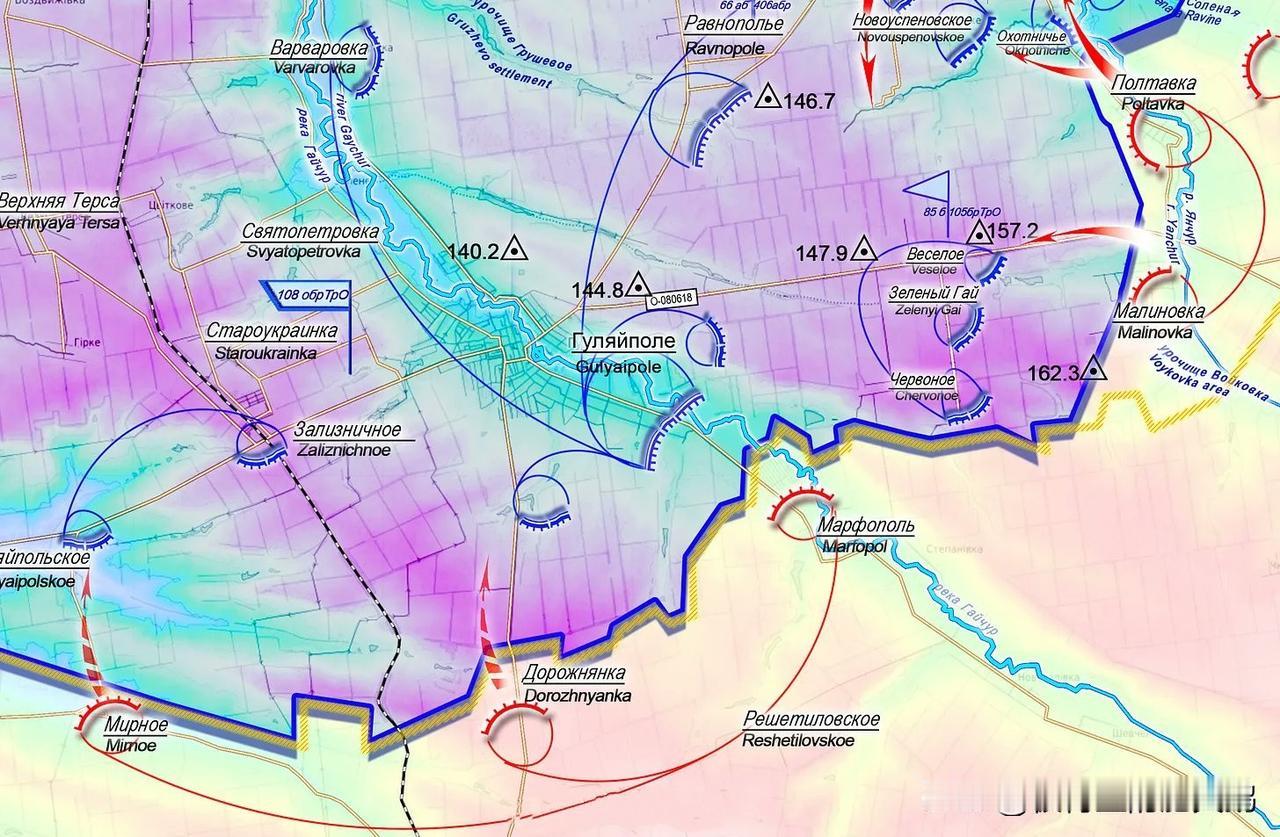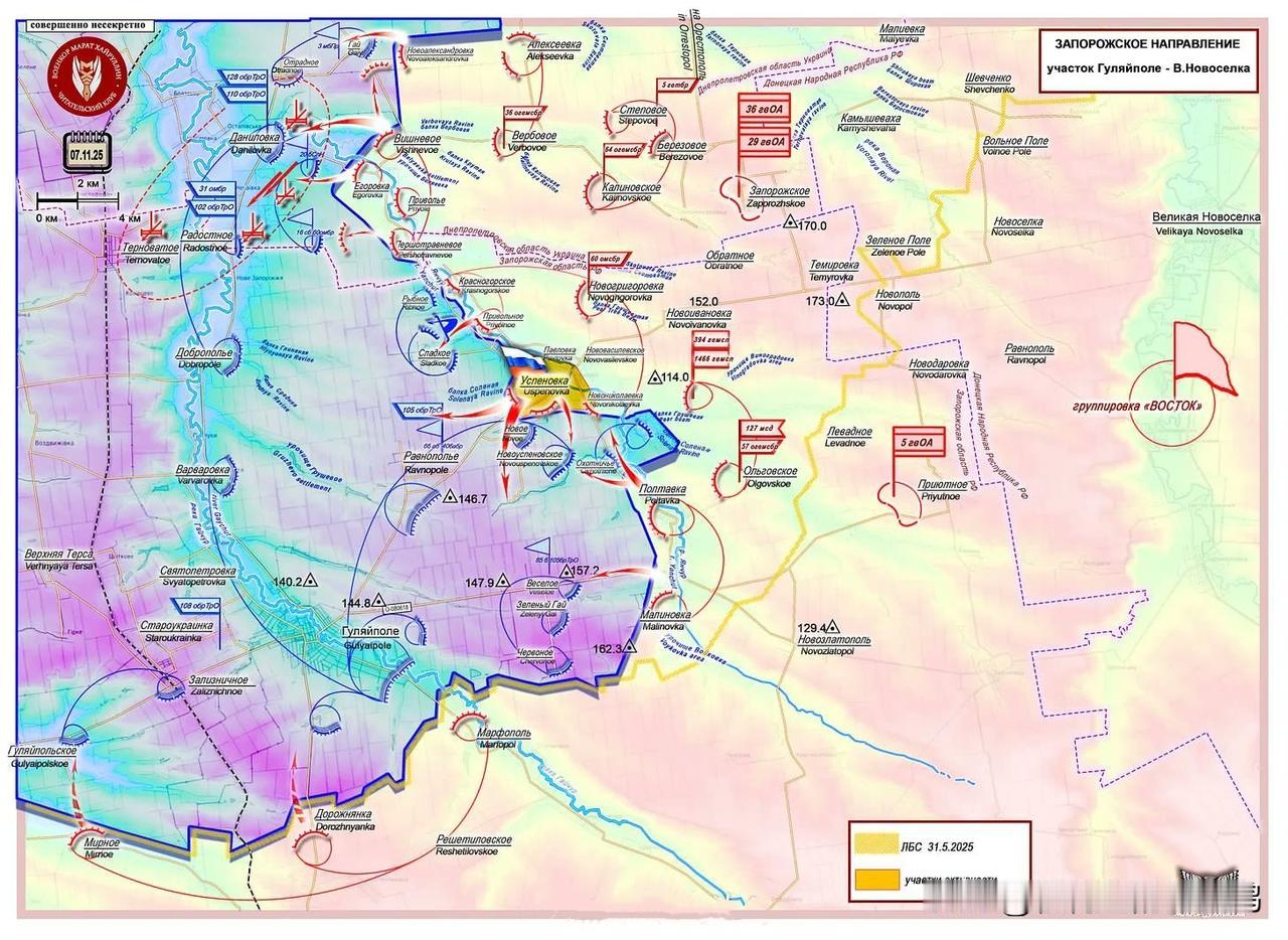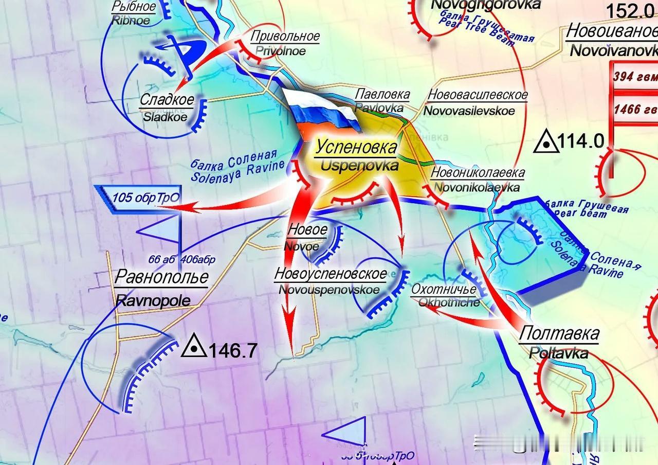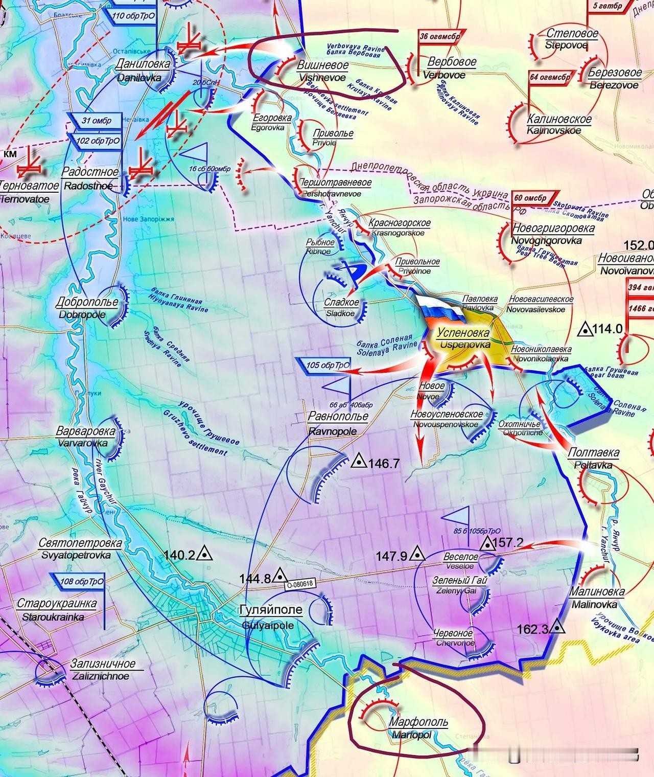 俄罗斯联邦国防部消息:“东部集团军群近卫诸兵种合成第5集团军第 127 摩托化步兵师的军人已完成对扎波罗热州乌斯片诺夫卡定居点的解放 —— 这是敌人在扬丘尔河左岸的关键且防御最坚固的据点之一。” 当泽圣和大蟋蟀为了国际观瞻,把注意力集中于被围困在库皮扬斯克和红军城(波克罗夫斯克)市的乌军残部这一注定覆灭的目标上时,俄“东部” 集团军群的突击部队在11月7日控制了乌克兰军队的一个主要防御据点乌斯片诺夫卡(北纬 47°46′53″,东经 36°23′57″,约有 1400 名居民)。 依托该地区、位于扬丘尔河左岸的这个乌军重要防御节点正处于被俄军彻底摧毁阶段。 在通往防守扎波罗热州南部地区中心及防御据点古利亚伊波列的乌军部队左翼的道路上,存在一些零散的乌军阵地,随着俄军推进至扬丘尔河与盖丘尔河的分水岭,这些阵地很快将被摧毁。 在地图上,乌军防御下的乌斯片诺夫卡突出部清晰可见,其北部和南部基地(维什涅沃耶和马尔福波尔)由俄军控制。俄军沿着乌斯片诺夫卡 - 拉夫诺波列 - 古利亚伊波列路线渡过扬丘尔河左岸,切断了这个突出部,俄军成功的建立了桥头堡,这使得他们确立进一步包围两河之间的乌军阵地,截断其补给路线的优势。 在这种态势下,俄军部队向丹尼洛夫卡定居点附近的盖丘尔河推进,以及马尔福波尔 - 多罗日内扬卡 - 米尔诺耶一线的行动就显得十分合理。 俄乌在扎波罗热东南部态势及战事发展,实际上并不亚于库皮扬斯克和红军城包围圈那般有趣和引人注目。 俄军总参谋部正大胆且自信地描绘着又一幅乌克兰武装部队溃败的图景。这一次,是在扎波罗热方向的东南。 制图:米哈伊尔·波波夫 #俄乌冲突# #俄乌激战红军城#