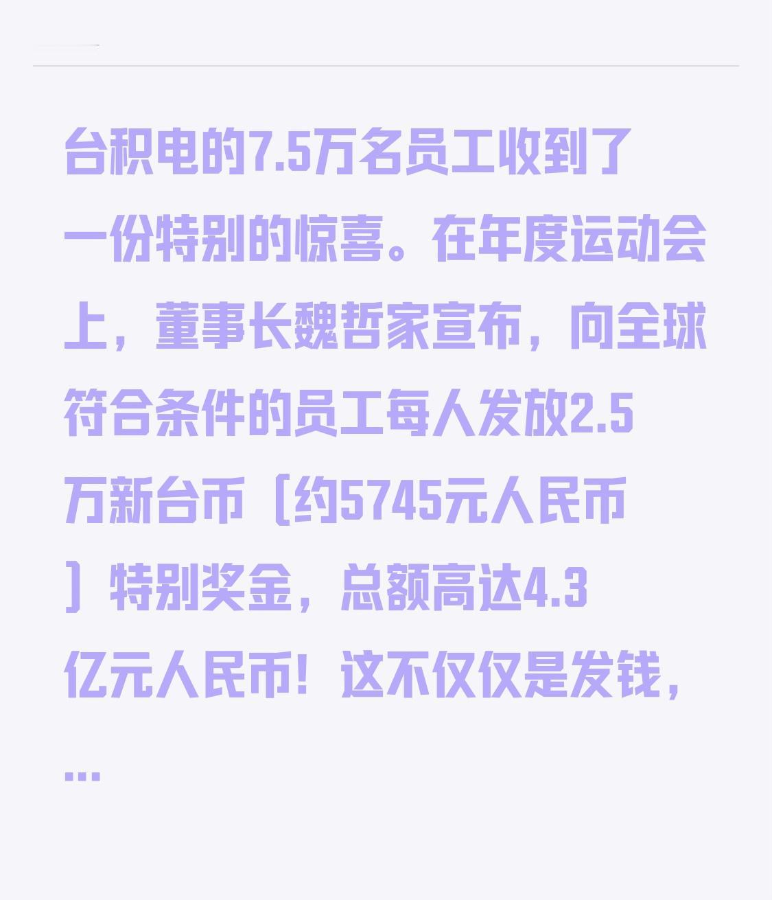 这才是“别人家的公司”!台积电豪掷4.3亿发奖金,员工笑称:双11购物车清空了! 就在刚过去的这个周末,当很多打工人还在为即将到来的周一焦虑时,台积电的7.5万名员工收到了一份特别的惊喜。在年度运动会上,董事长魏哲家宣布,向全球符合条件的员工每人发放2.5万新台币(约5745元人民币)特别奖金,总额高达4.3亿元人民币! 这不仅仅是发钱,更是一种企业智慧! 现阶段半导体行业的人才争夺激烈。 在芯片人才紧缺的当下,台积电此举可谓深谋远虑。与其说这是在发奖金,不如说是在投资未来。毕竟,留住一个核心工程师的价值,远超过这笔奖金本身。 台积电市值 台积电断芯