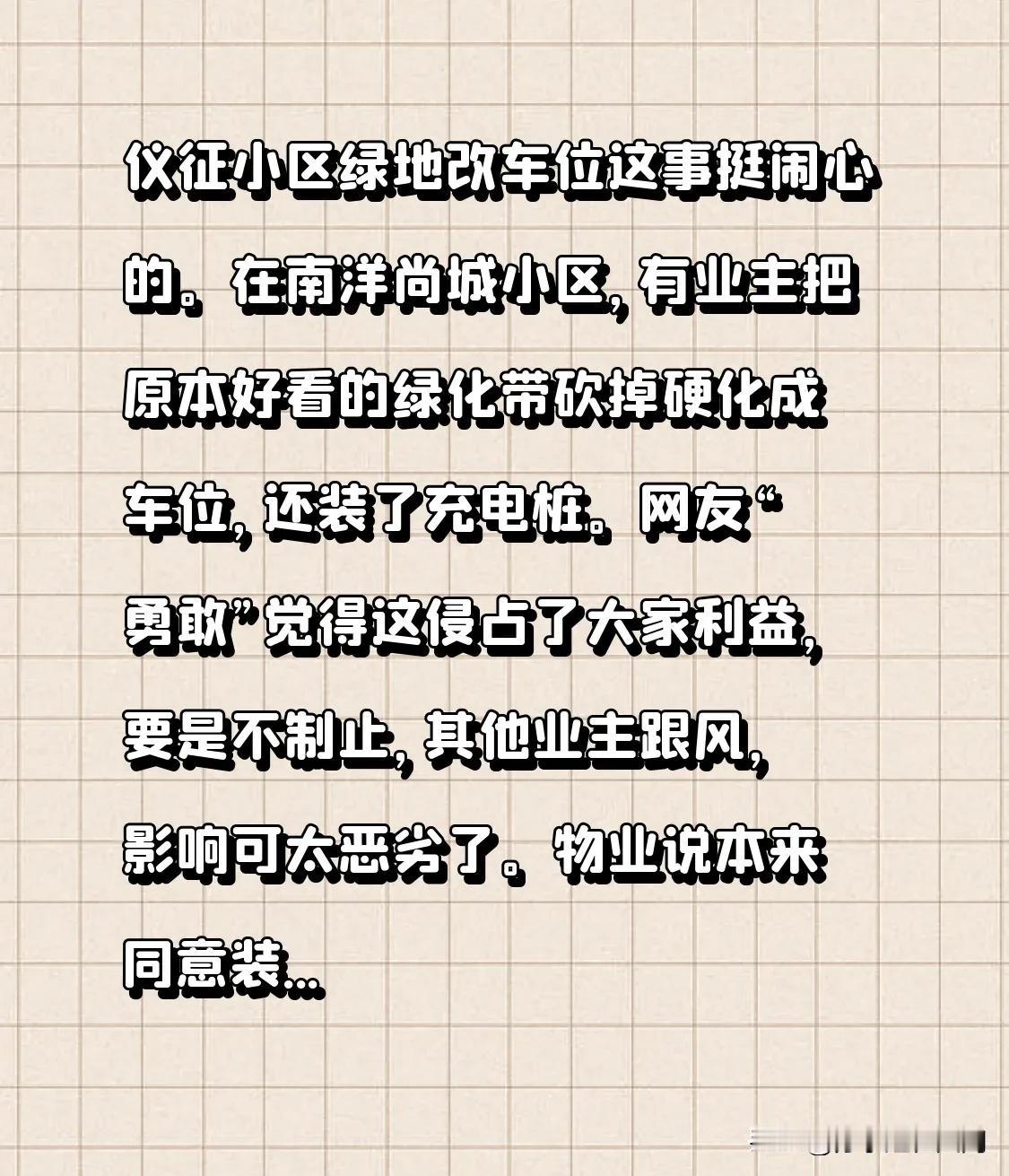 仪征小区绿地改车位这事挺闹心的。在南洋尚城小区,有业主把原本好看的绿化带砍掉硬化成车位,还装了充电桩。网友“勇敢”觉得这侵占了大家利益,要是不制止,其他业主跟风,影响可太恶劣了。物业说本来同意装充电桩是以为业主有车位,没想到装到了居民楼下。 另外金鑫花苑也有车位问题,2、4、7栋楼下过道窄,车辆多,特种车辆通行都成问题。年前南门西侧车位改造完成了,业主希望加快这三栋楼下车位改造,不过住建局表示前期改造有业主反对,工程搁置,想继续得跟业委会反映。小区车位改造真得好好平衡各方利益啊。 小区改造车位 仪征前进路东延 丹徒车位广告牌 仪征停车 海安车位划线 小区停车位微改 叶塘车位划线
